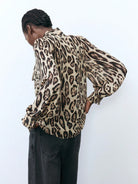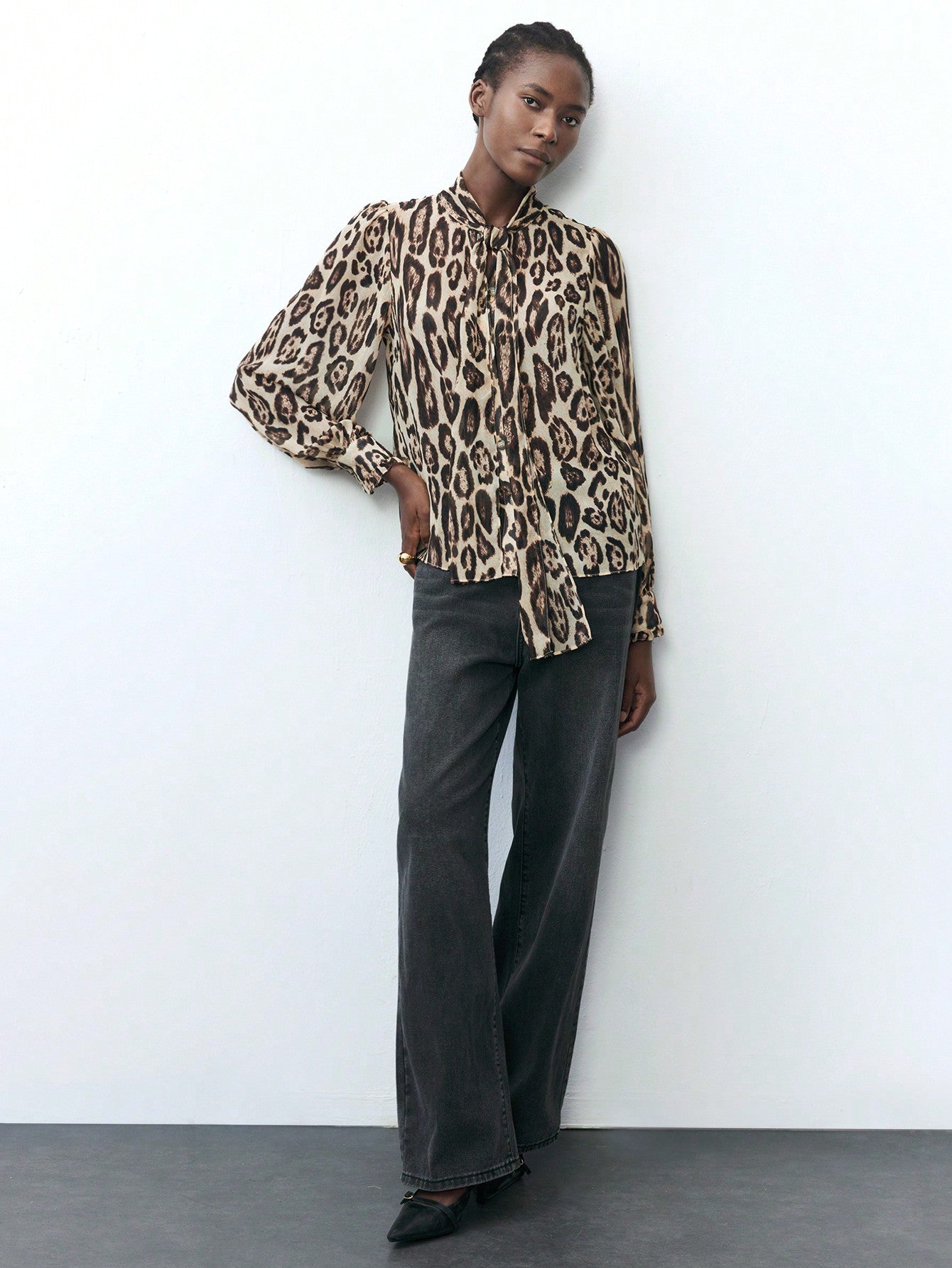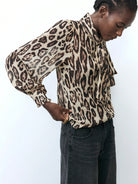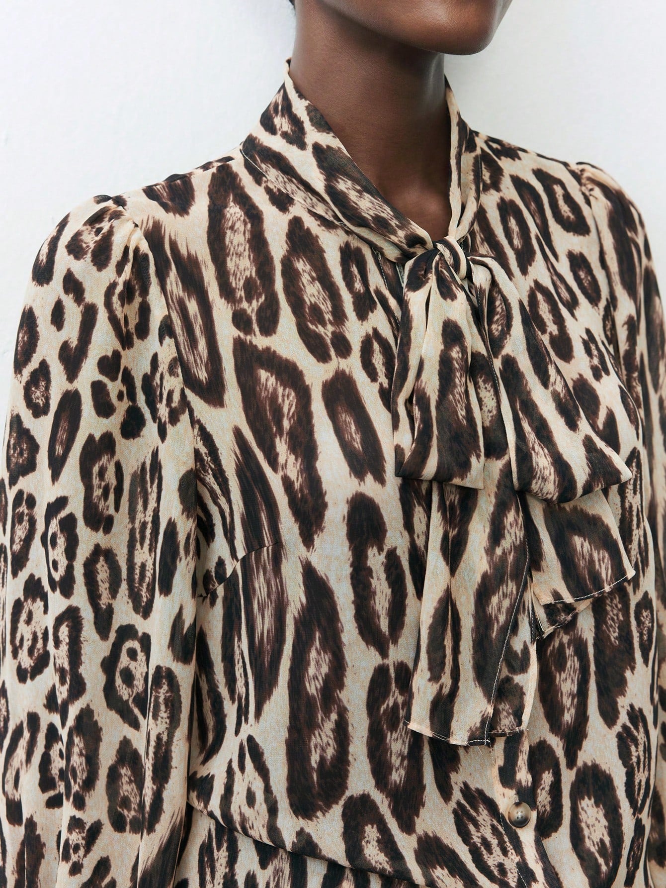 Maija Women's Brown Leopard Print Chic Urban All-Season Versatile Animal Print Lace-Up Collar Long Sleeve Blouse