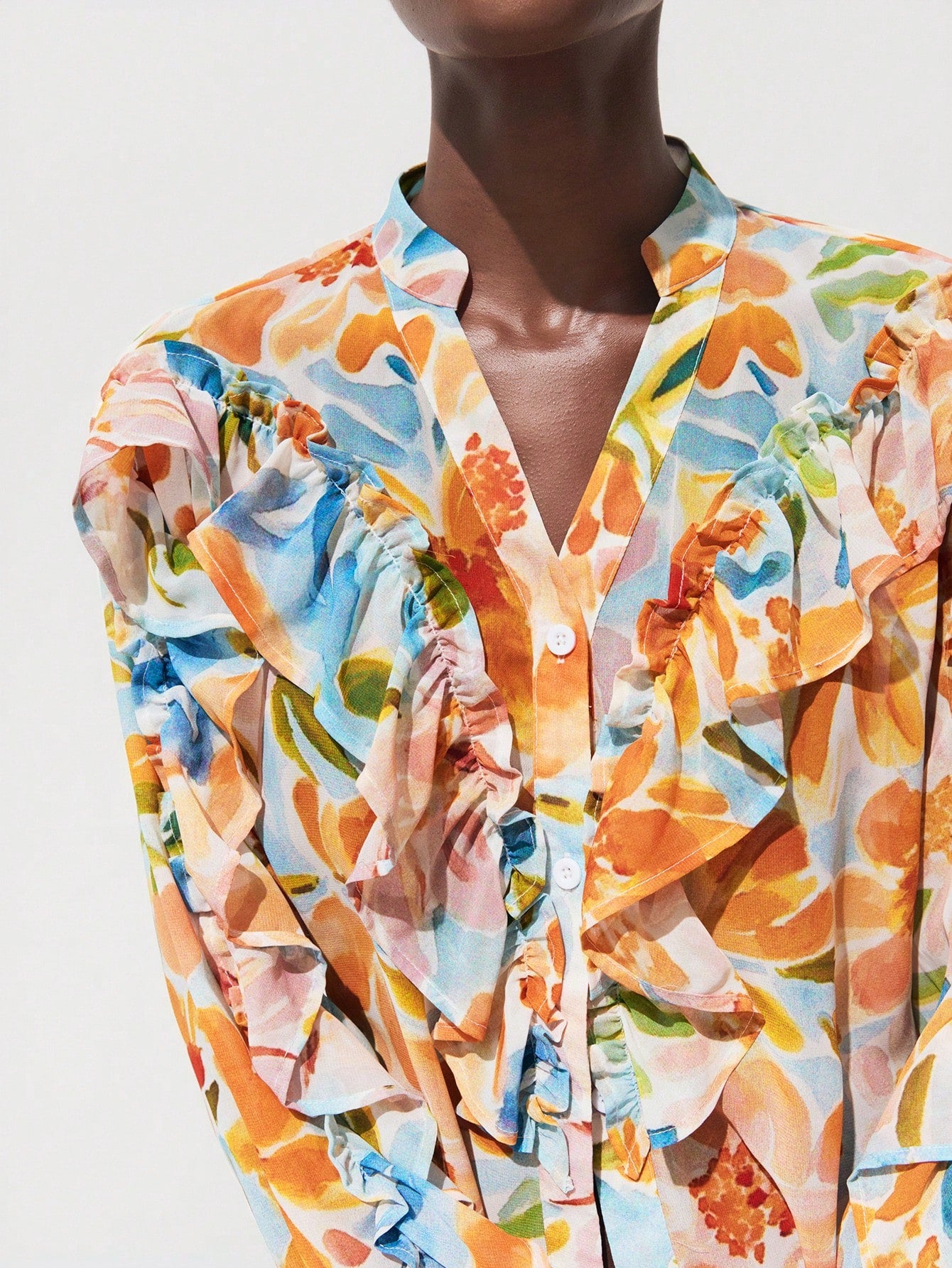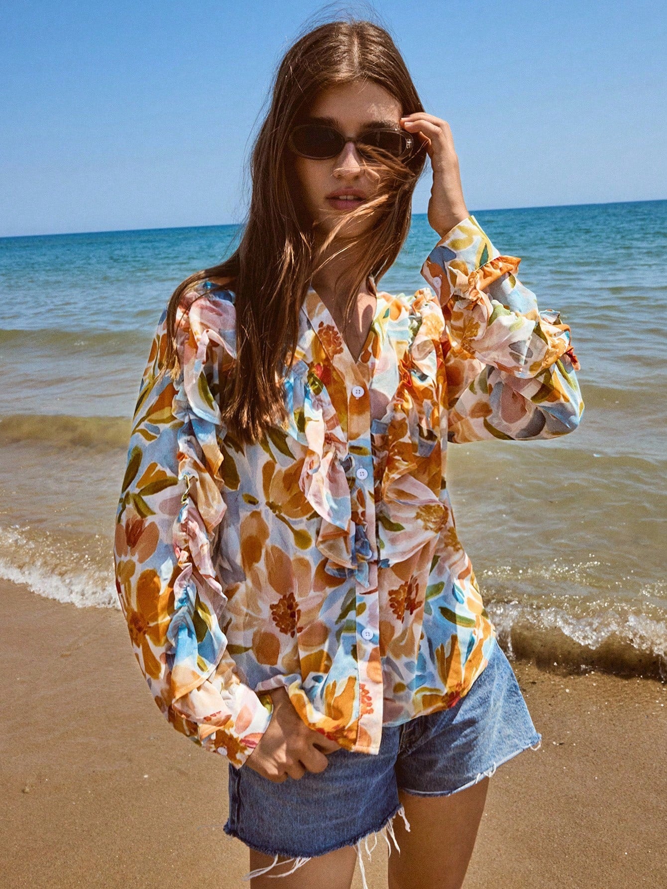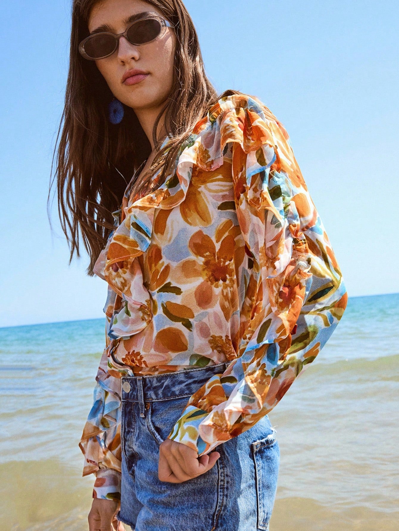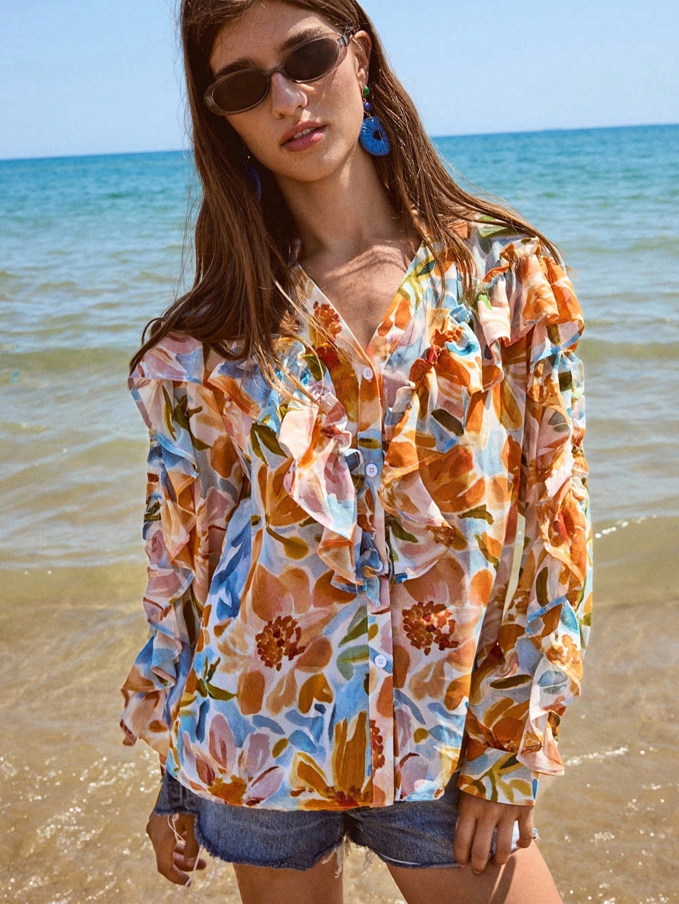 Maija Women's Elegant Floral All-Over Print Ruffle Hem Blouse Cute Summer Top Beach Outfits For Woman
