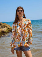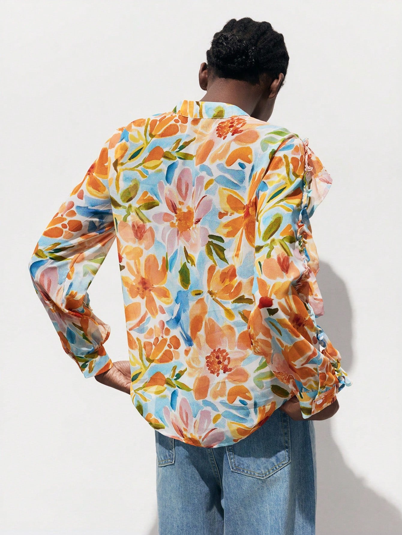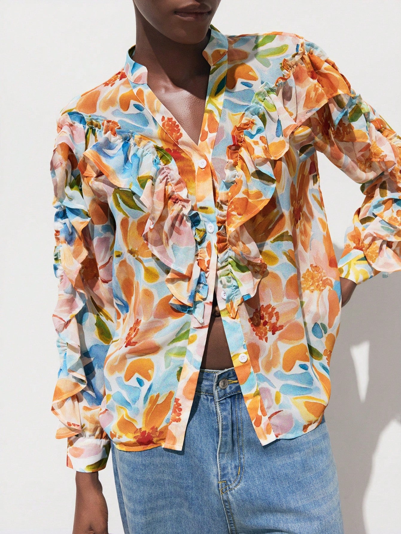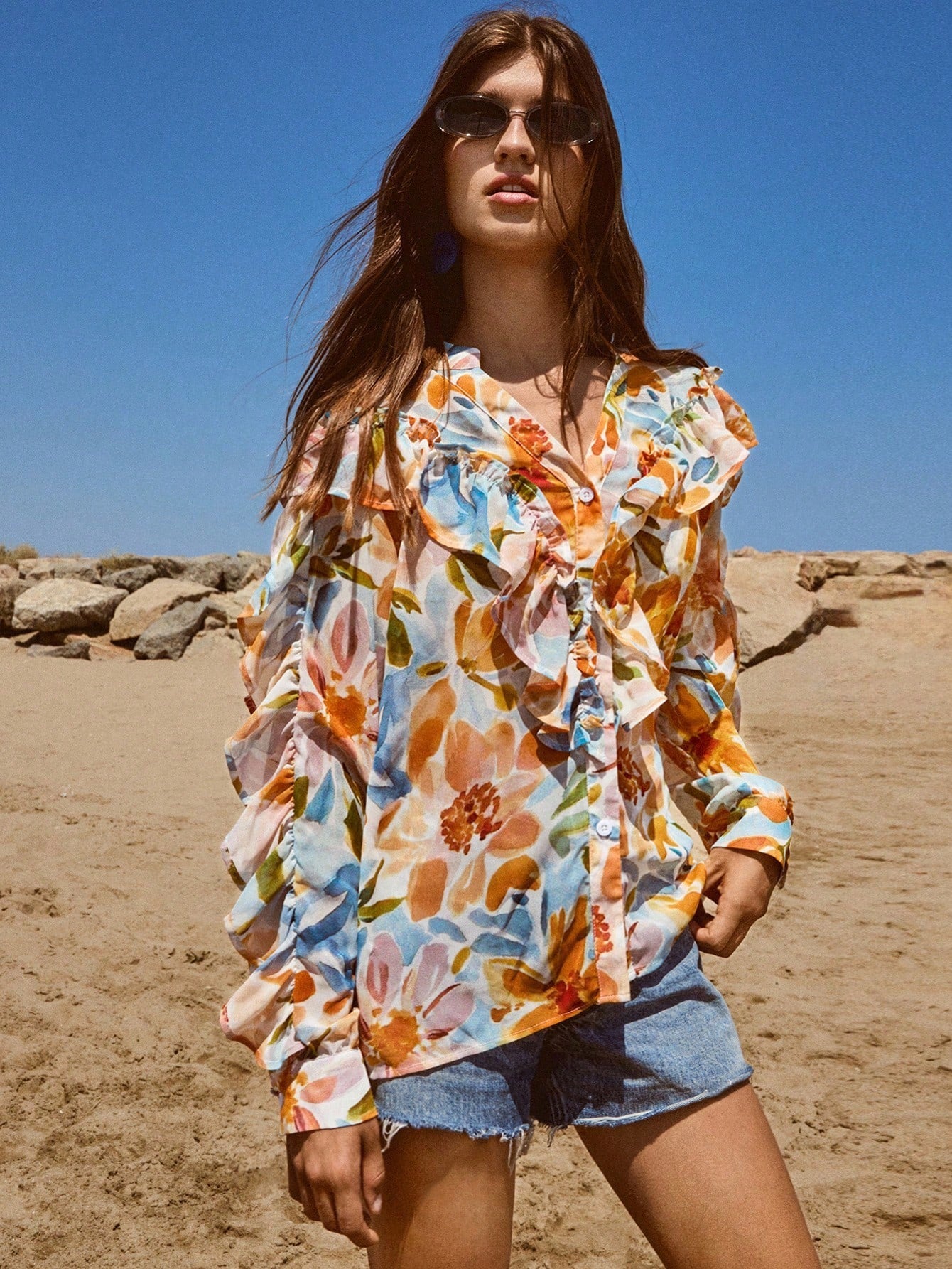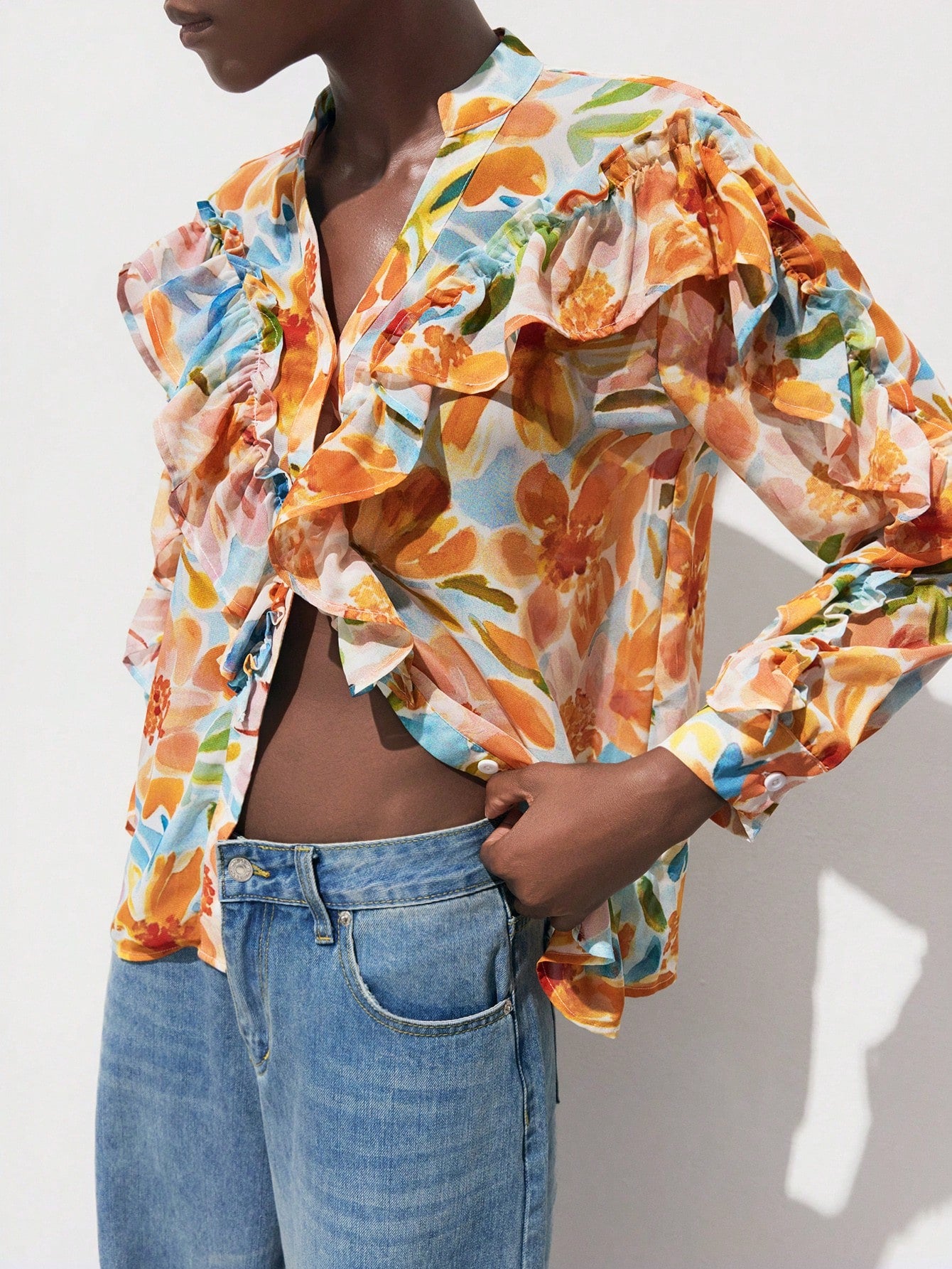 Maija Women's Elegant Floral All-Over Print Ruffle Hem Blouse Cute Summer Top Beach Outfits For Woman