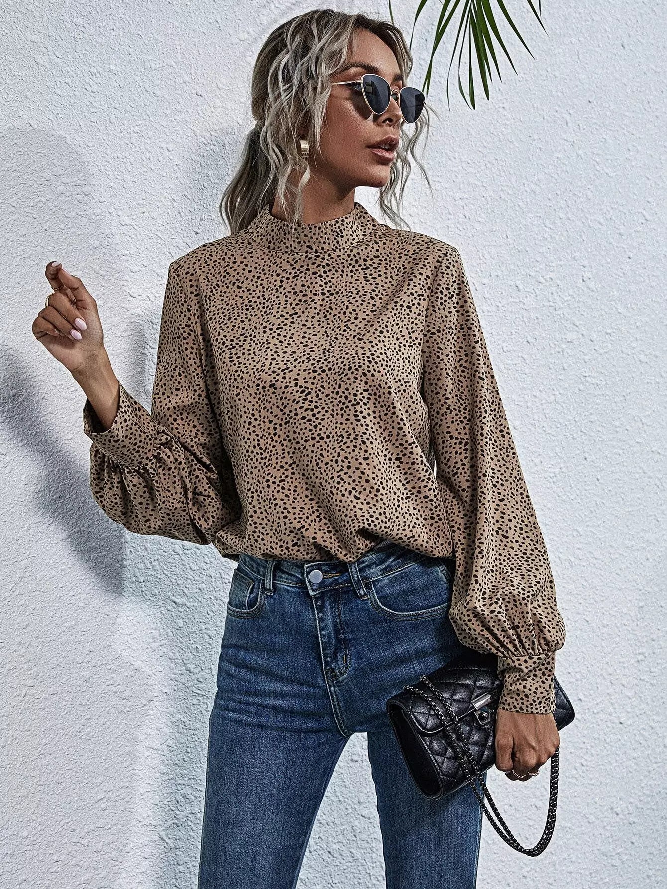 Mock Neck Dalmatian Print Blouse
