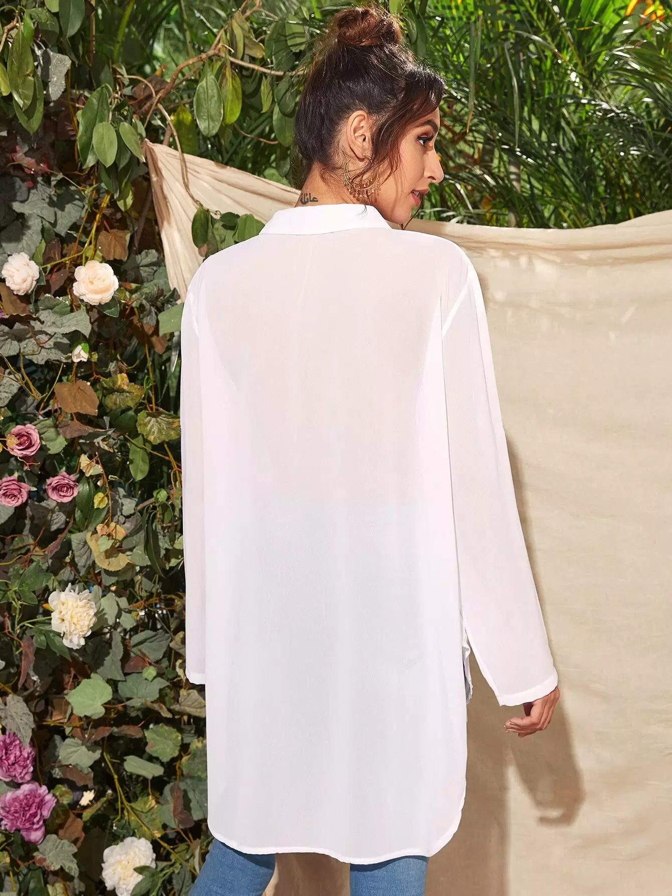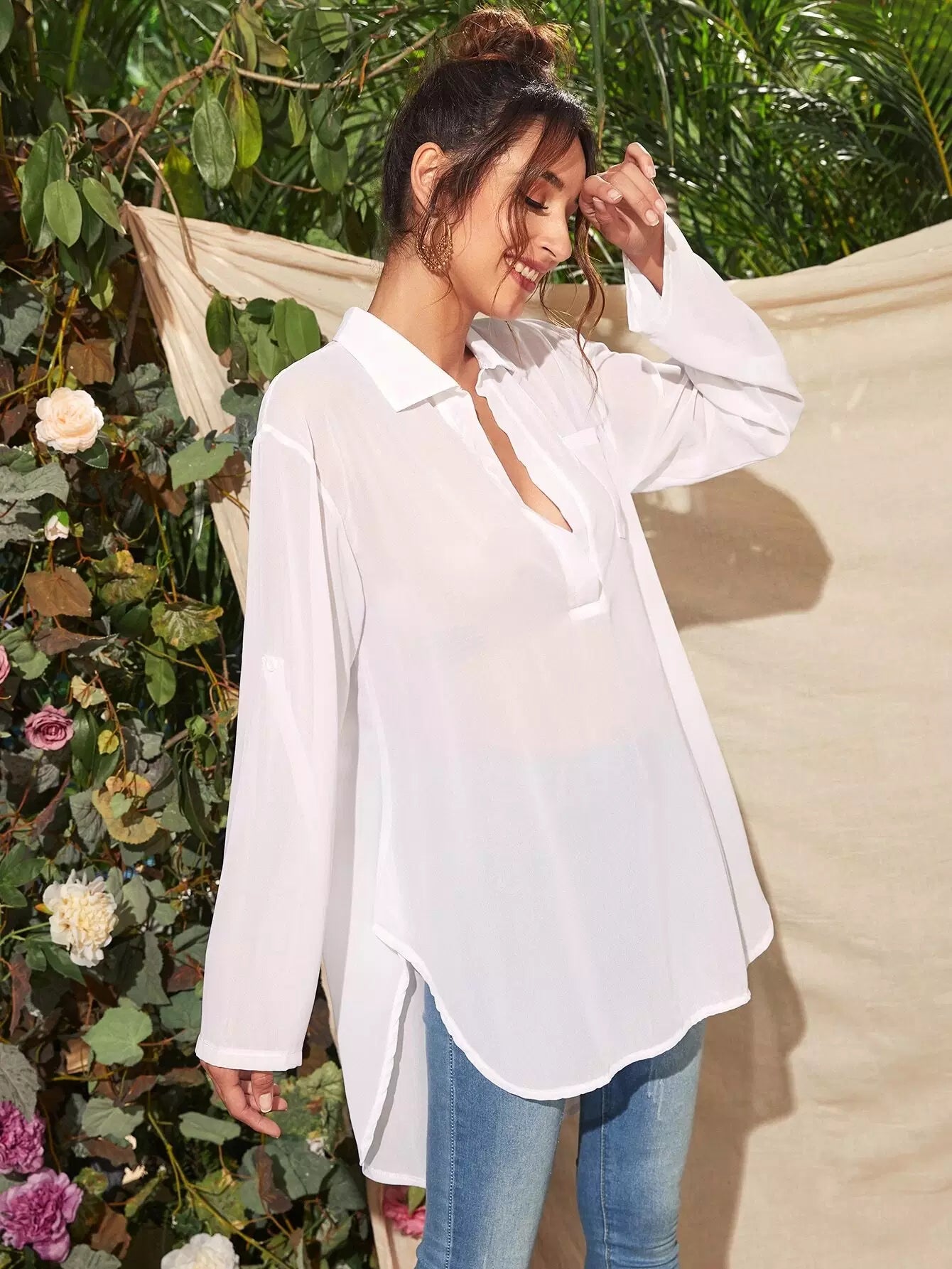 Women - Notch Neck Rolled Tab Sleeve Dip Hem Top