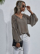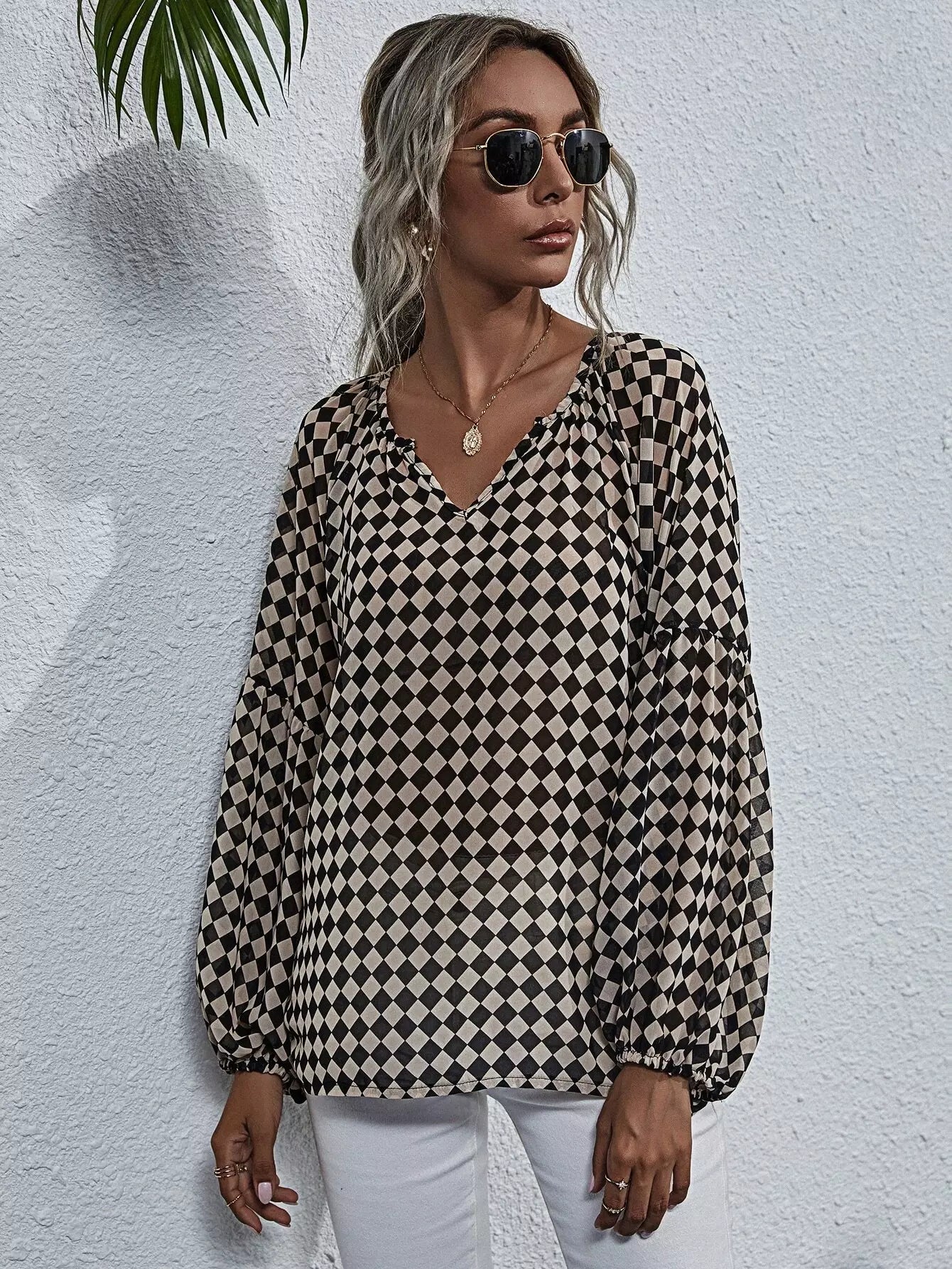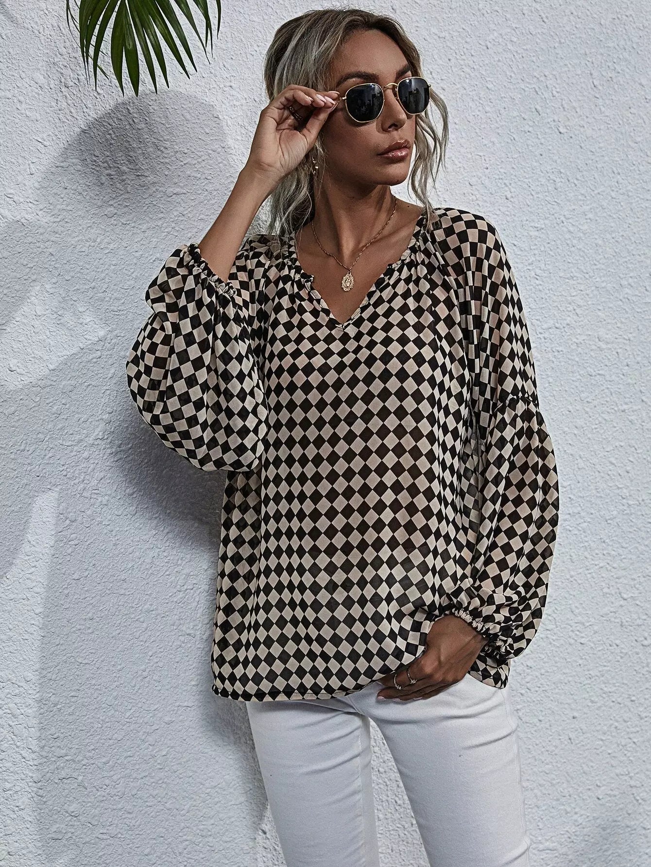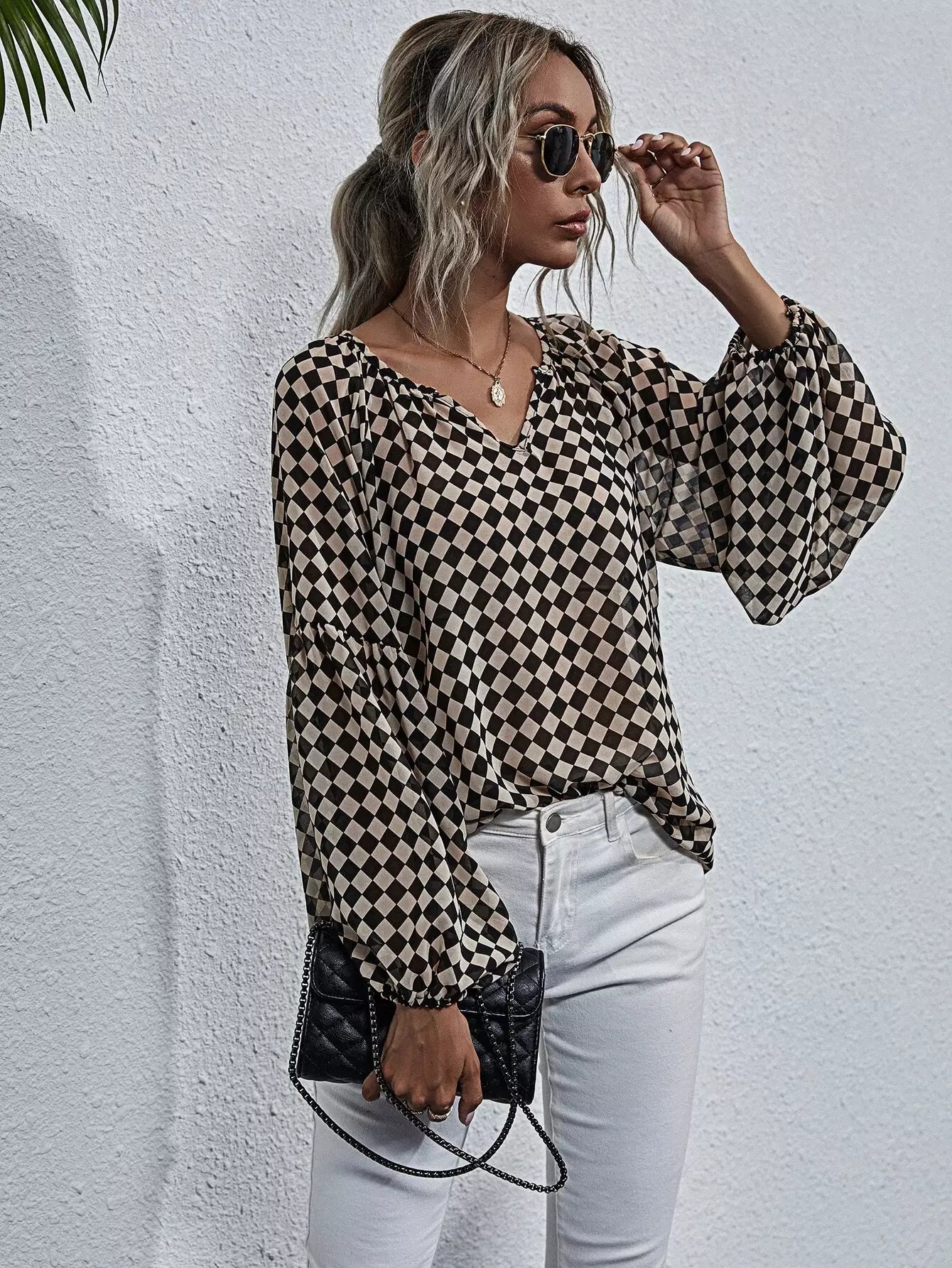 Notched Checker Bishop Sleeve Chiffon Blouse