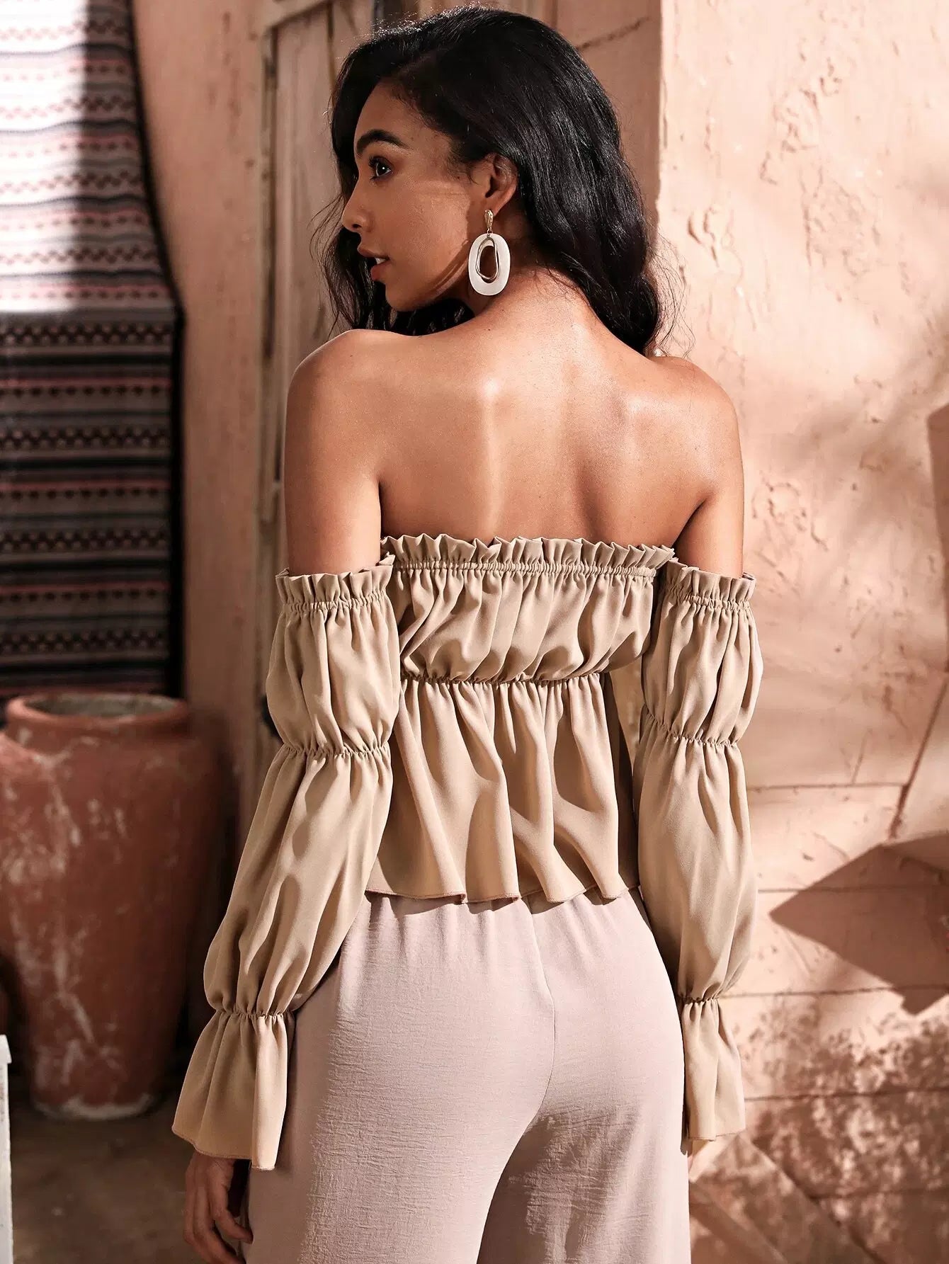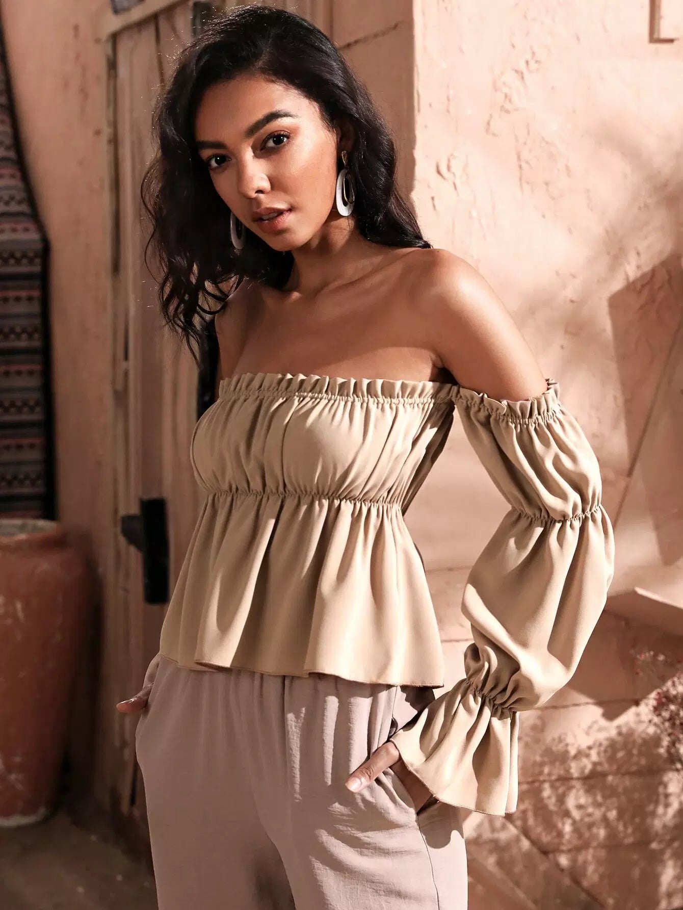 Off Shoulder Frill Trim Ruched Bust Gather Sleeve Top