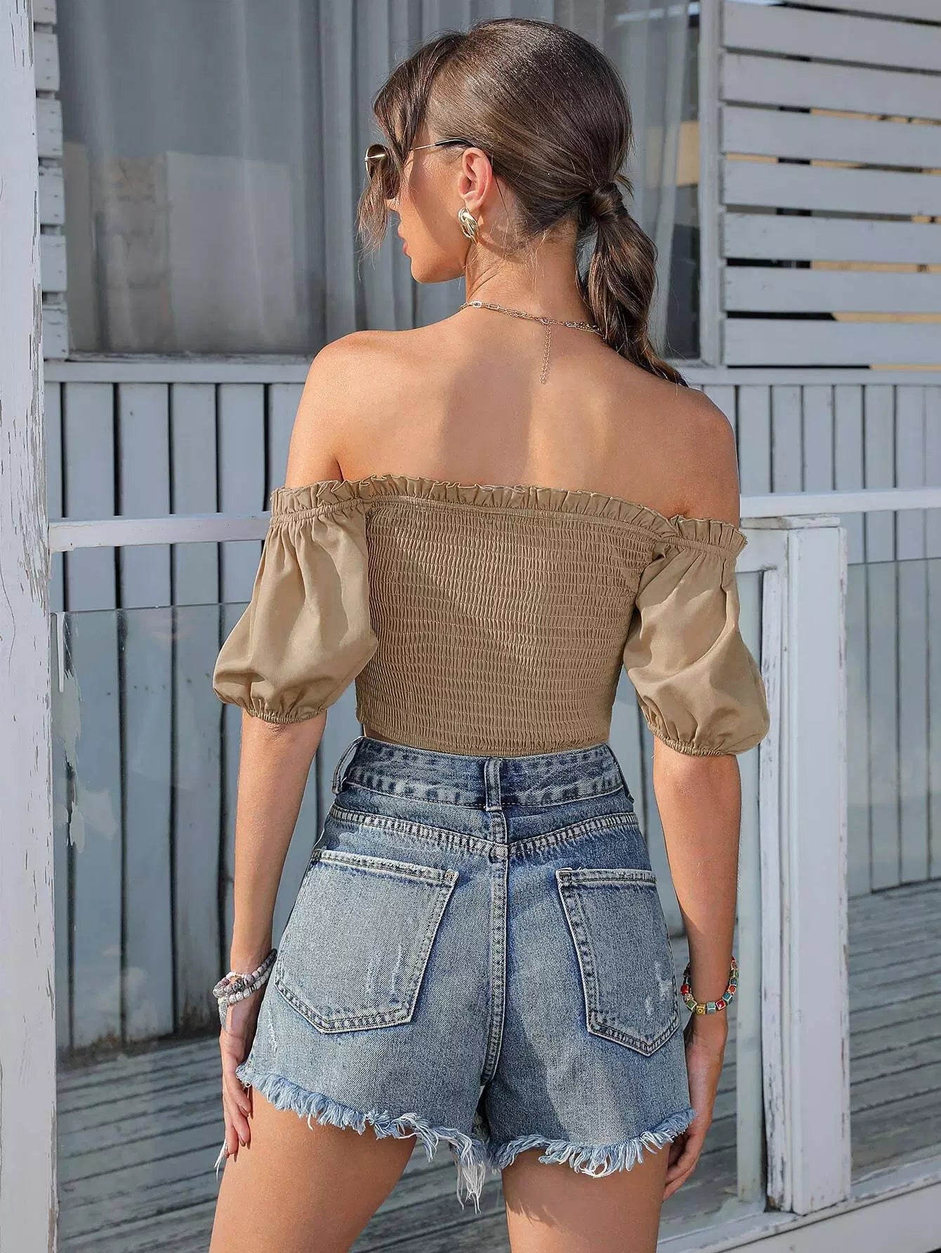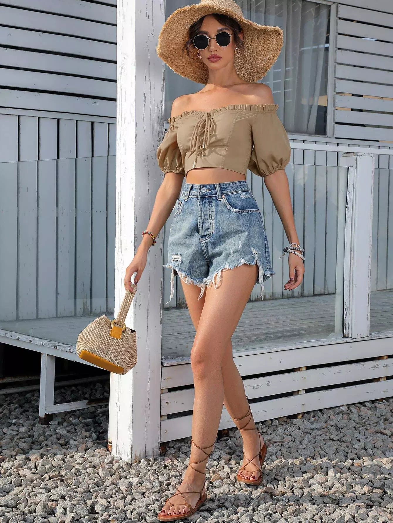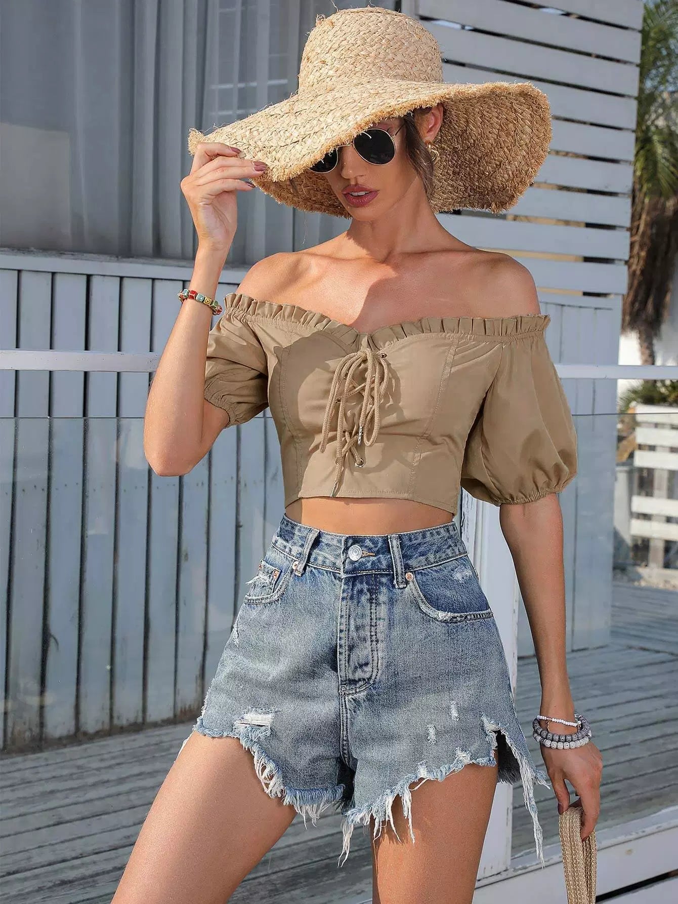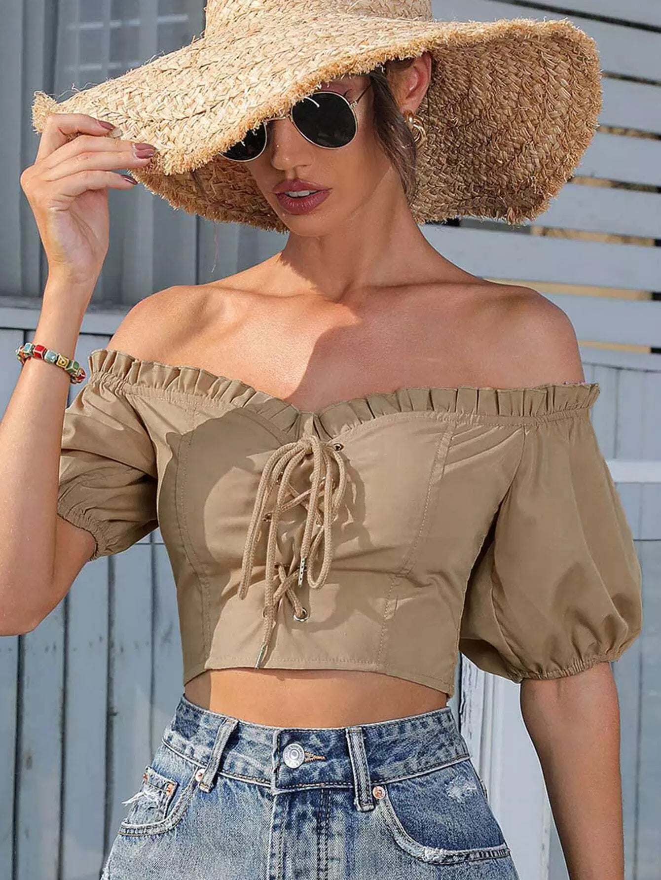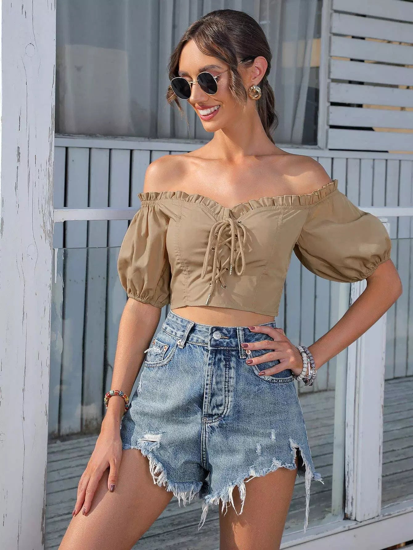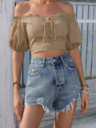 Off Shoulder Frill Trim Shirred Back Lace Up Front Top