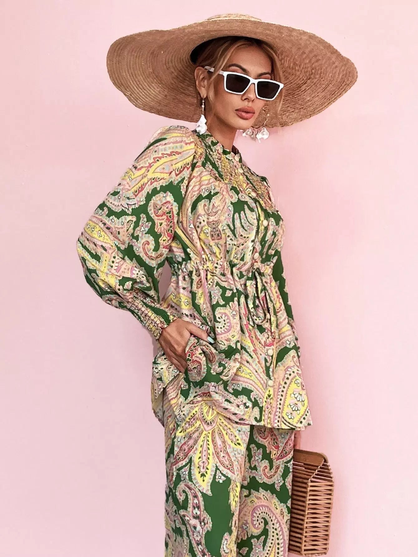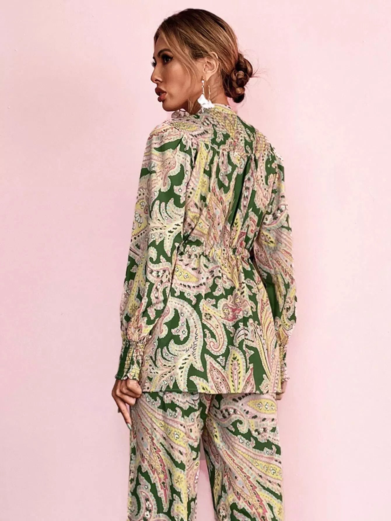 Paisley Print Bishop Sleeve Button Up Drawstring Blouse