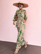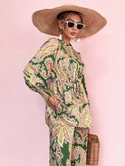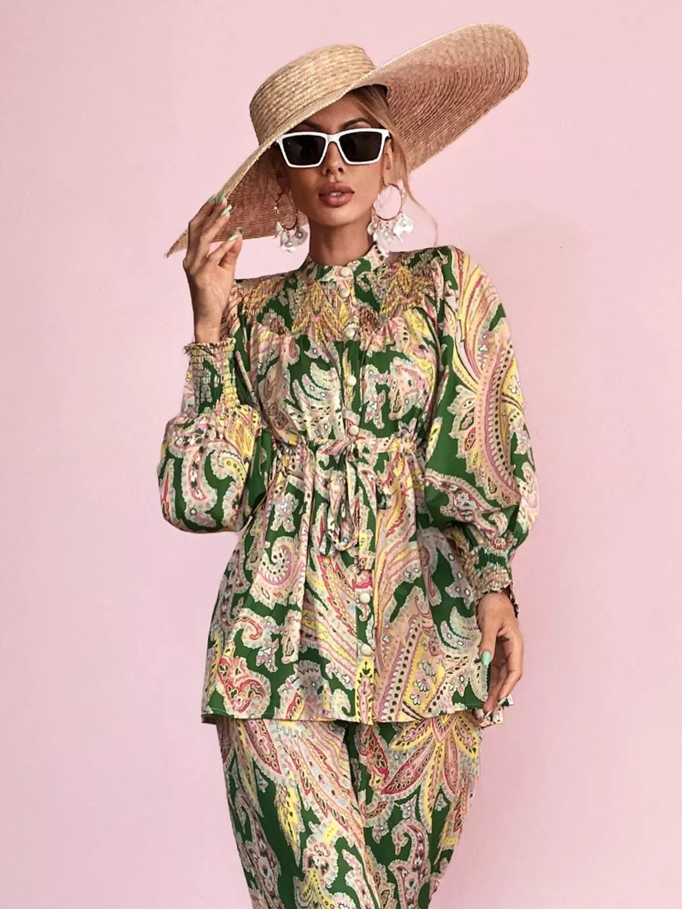Women - Paisley Print Bishop Sleeve Button Up Drawstring Blouse
