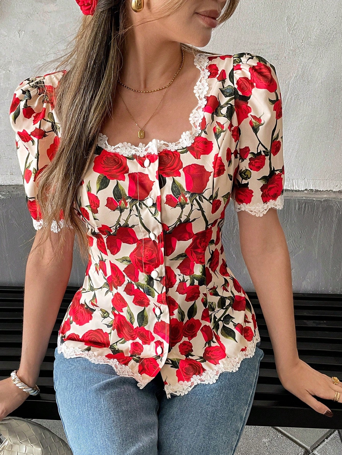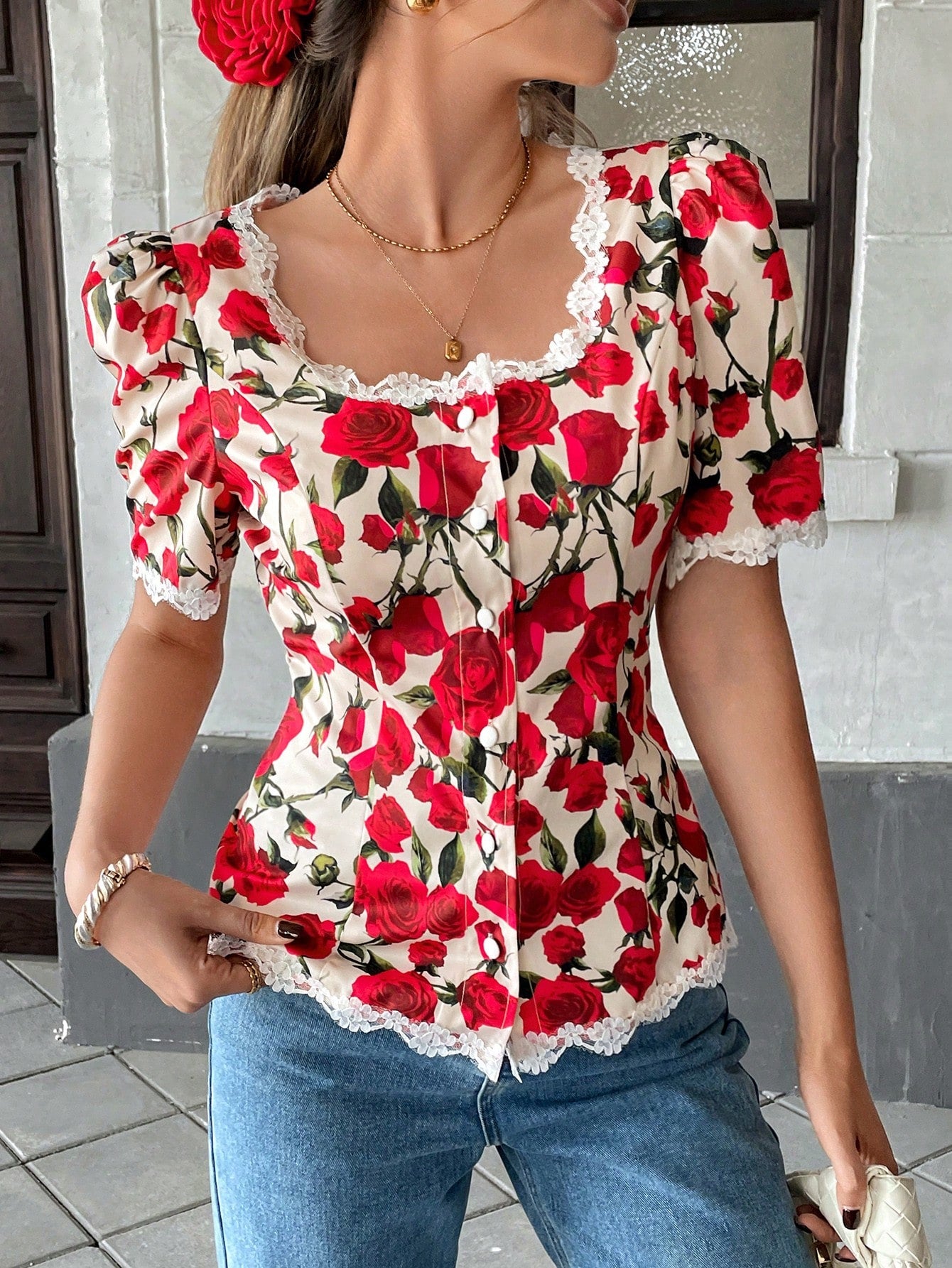 Pariaura Women's Red Rose Print Blouse: Casual Scoop Neck, Half Sleeve Top With Contrast Lace Detail