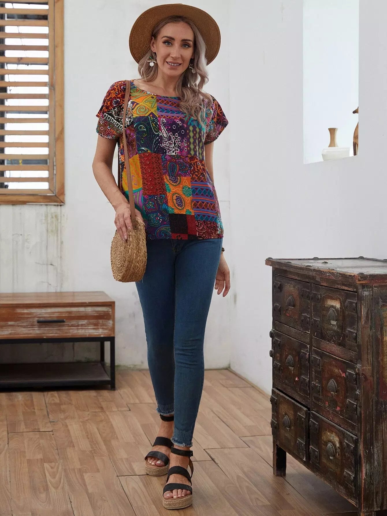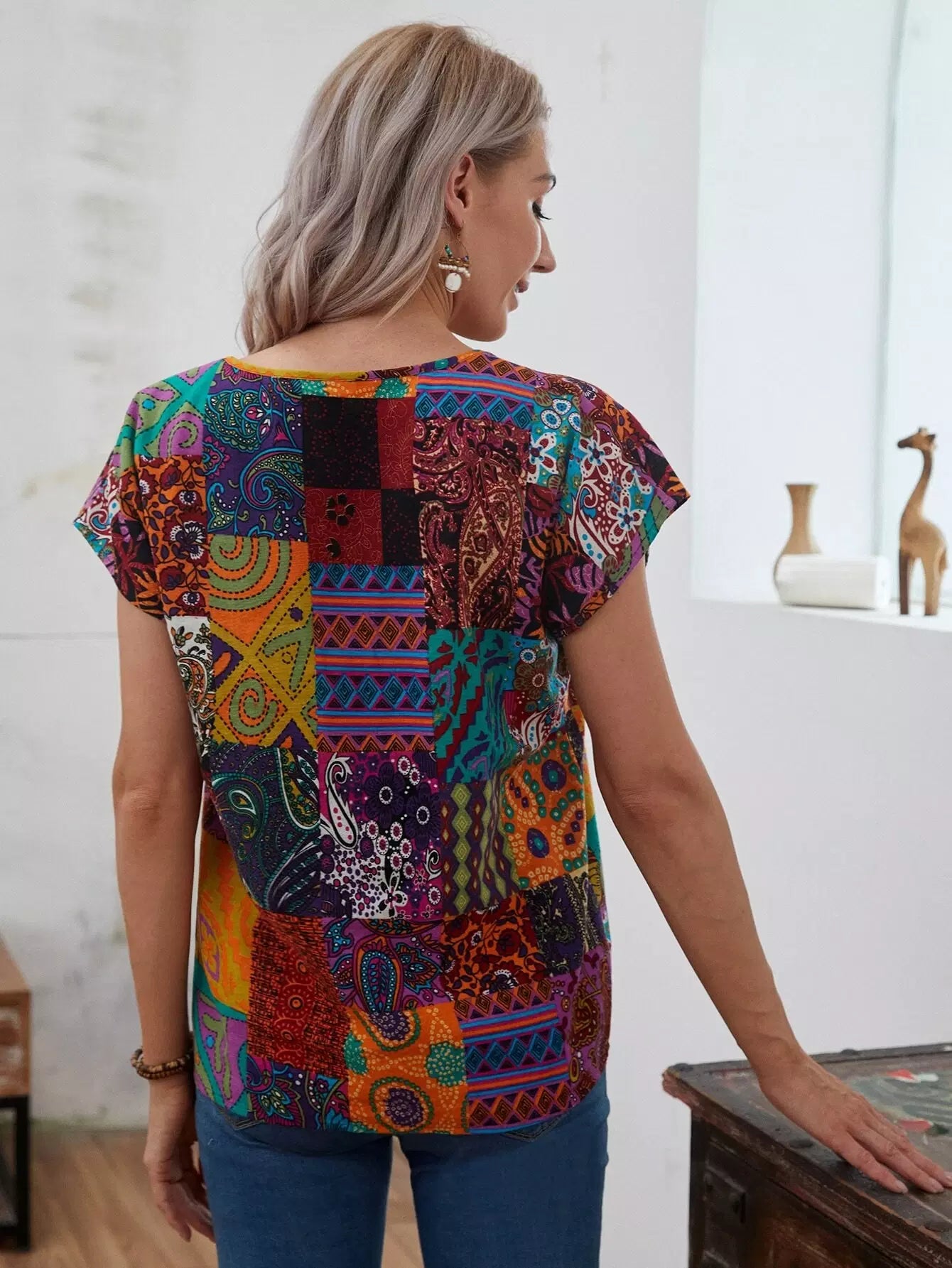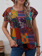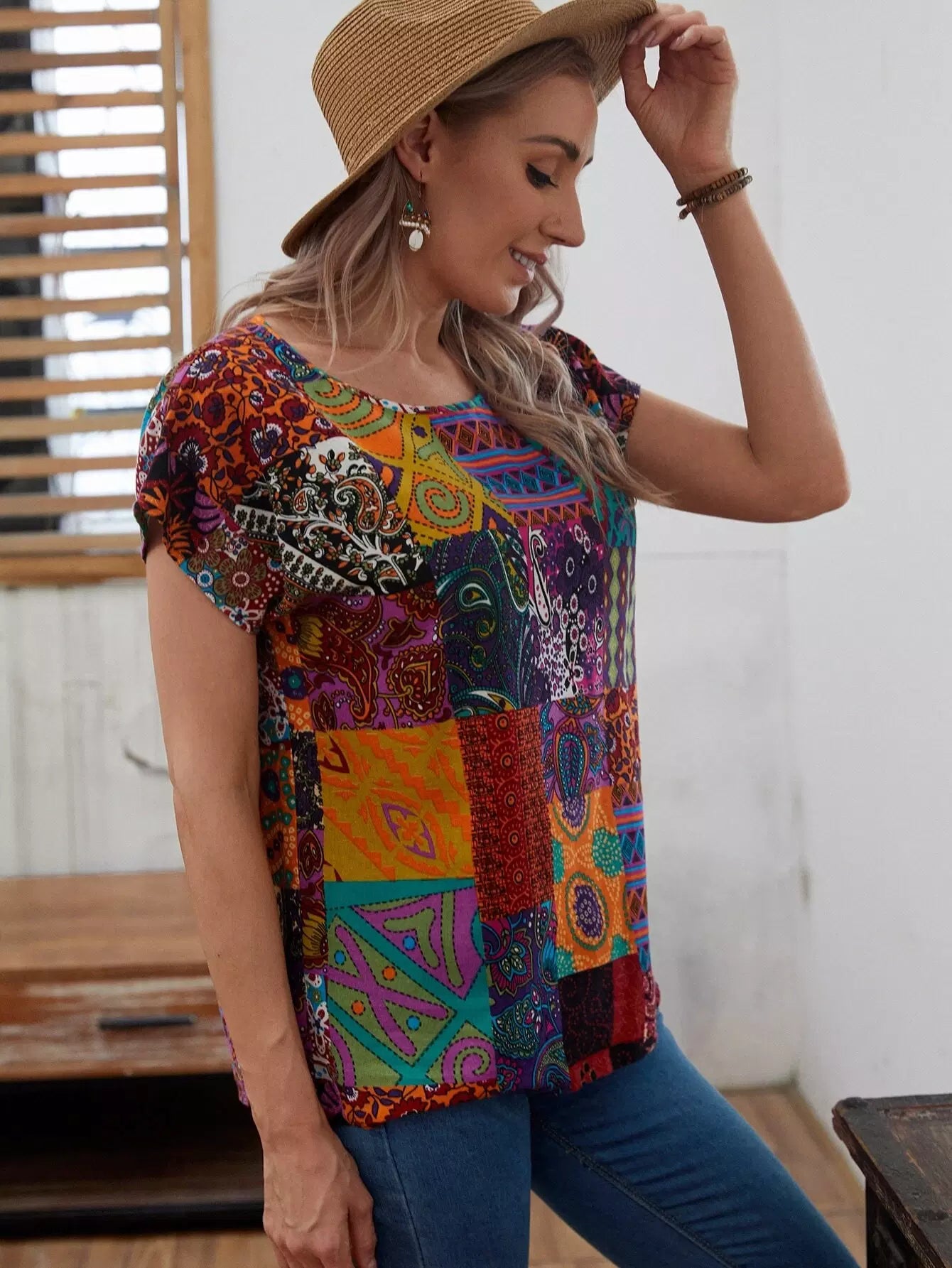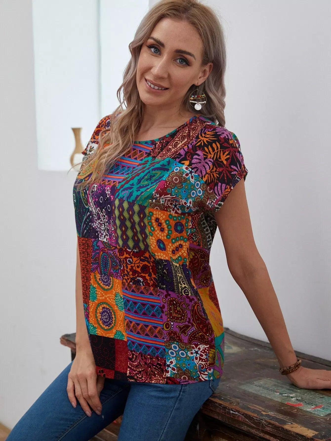 Patchwork Print Batwing Sleeve Top