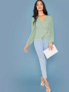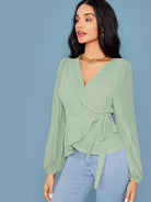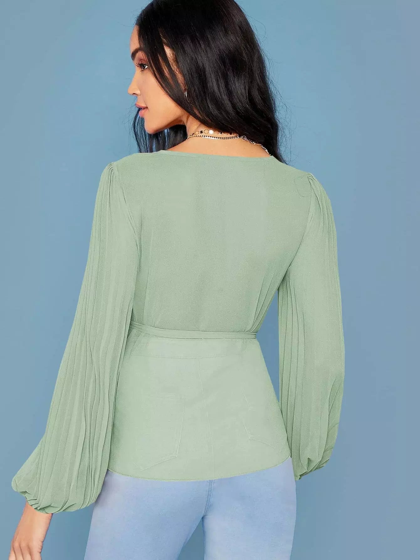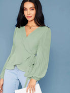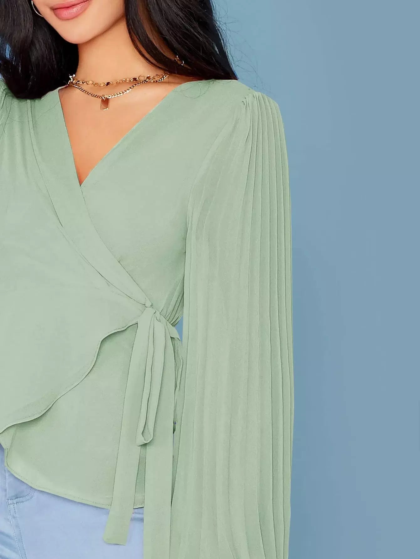 Pleated Lantern Sleeve Tie Side Wrap Top