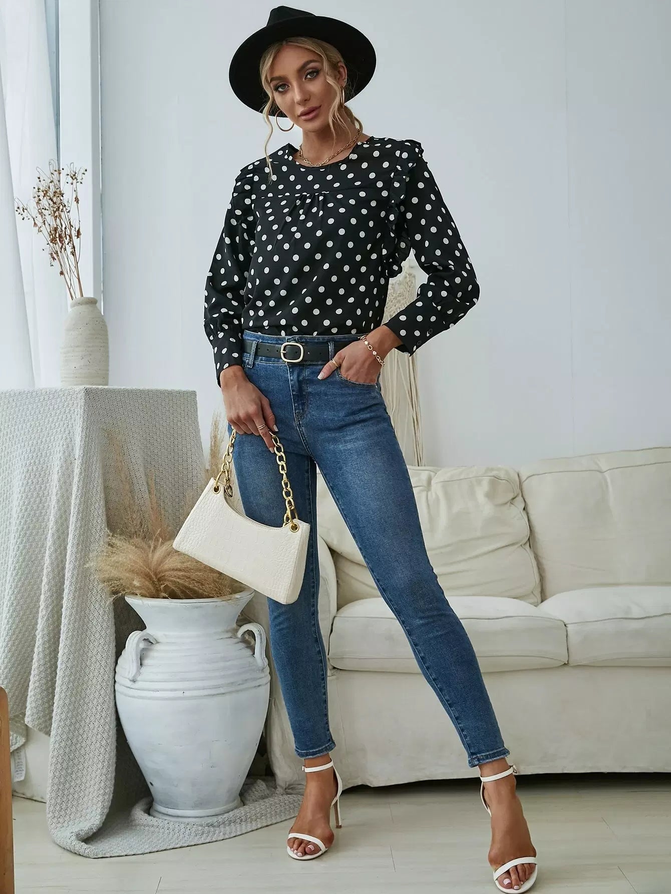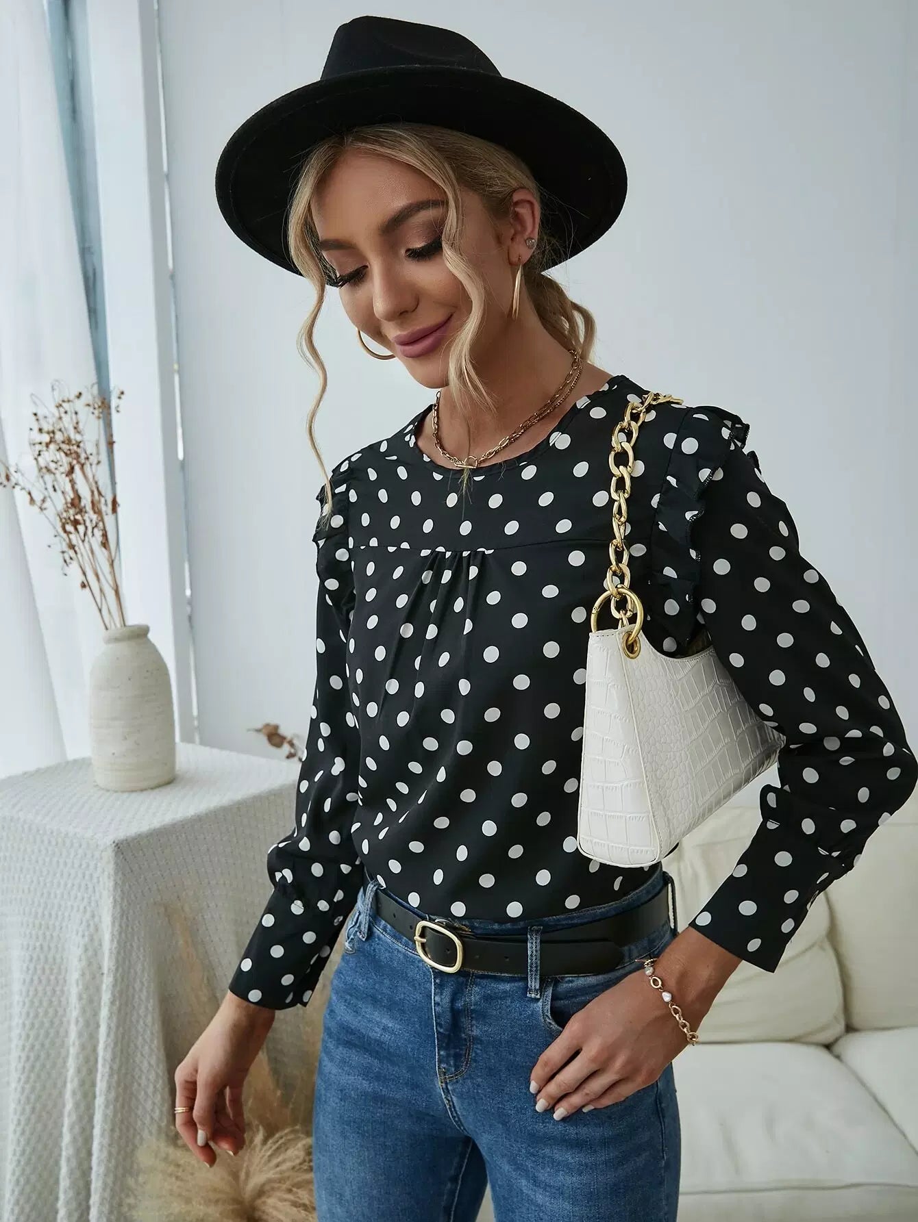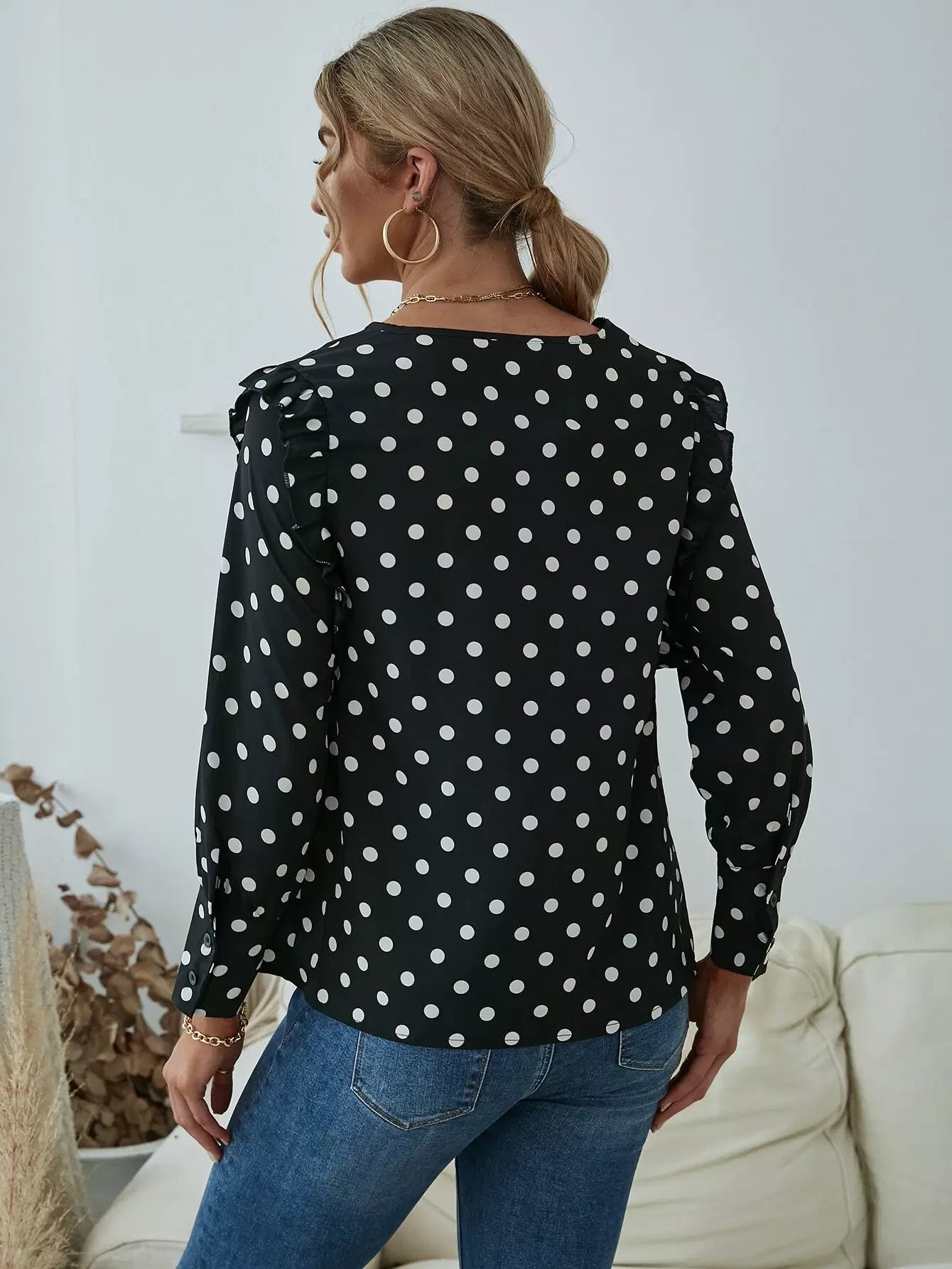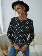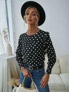 Polka Dot Print Frill Trim Crew Neck Blouse