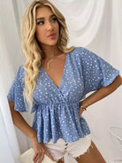 Polka Dot Surplice Neck Butterfly Sleeve Peplum Blouse