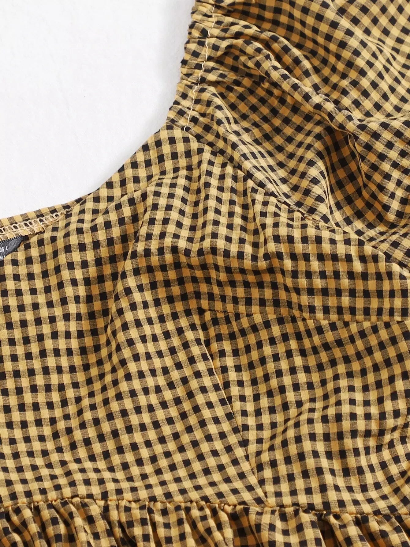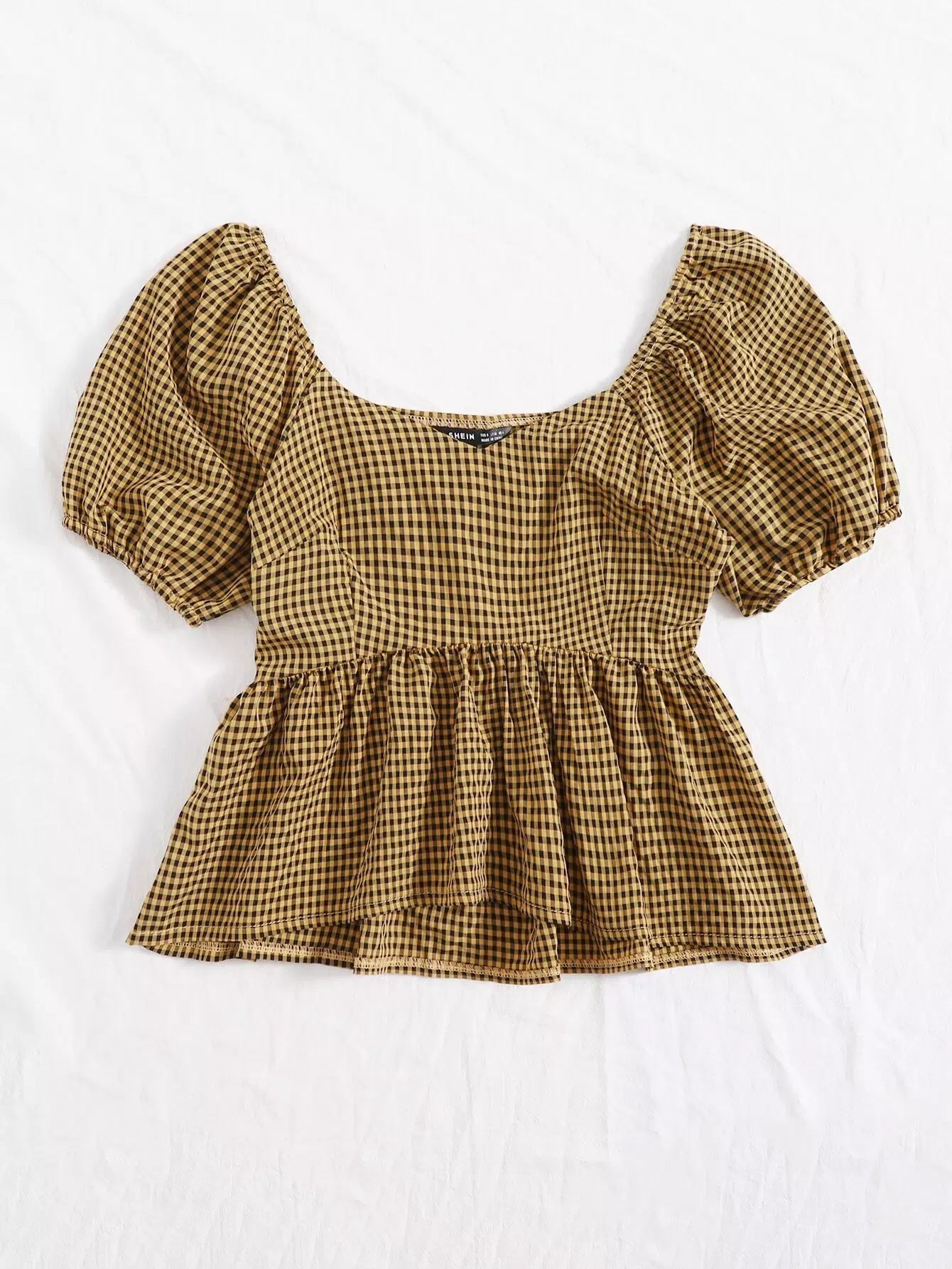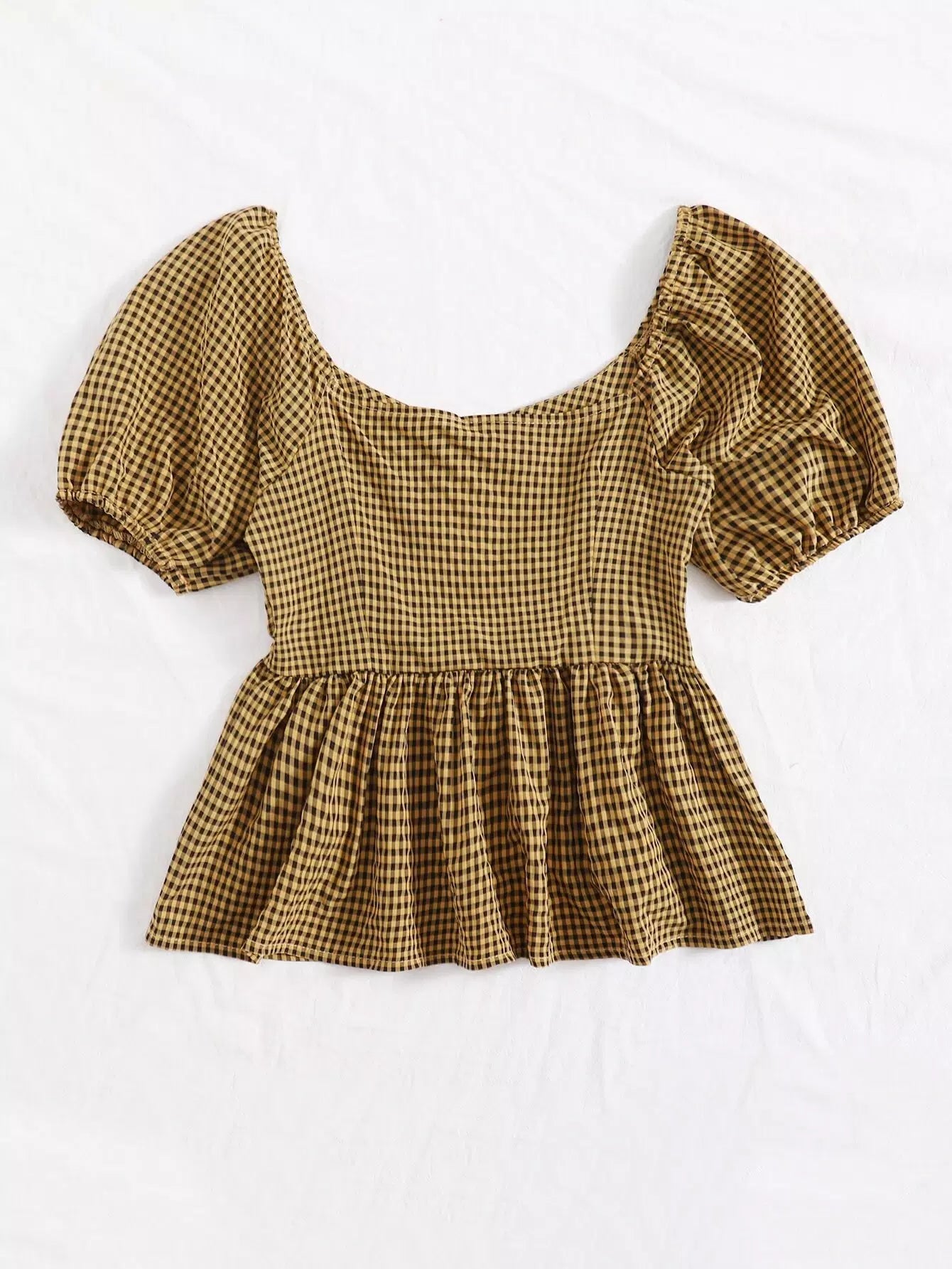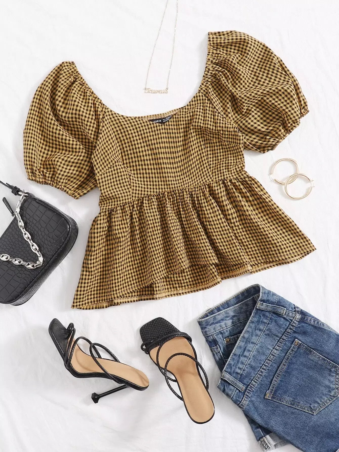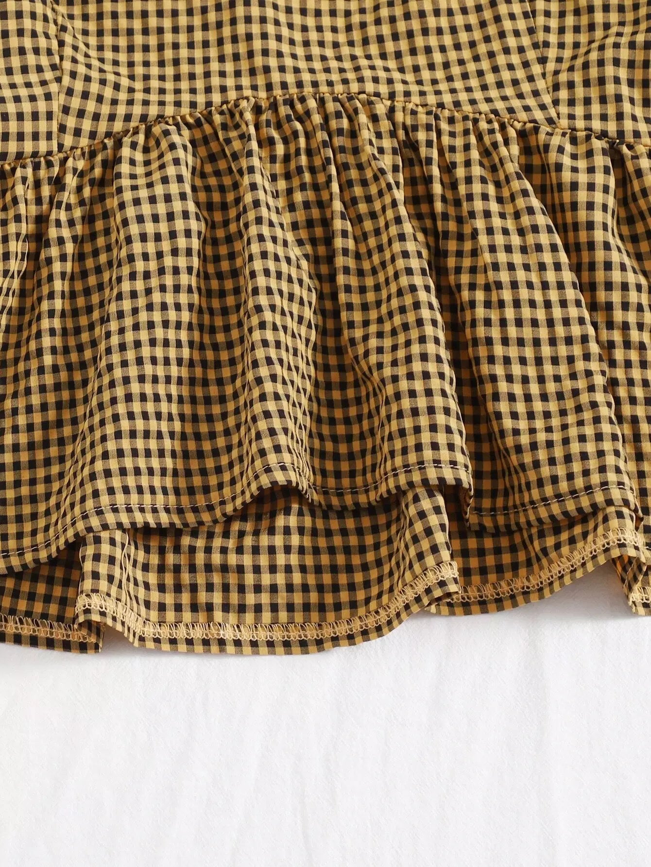 Puff Sleeve Ruffle Hem Gingham Blouse