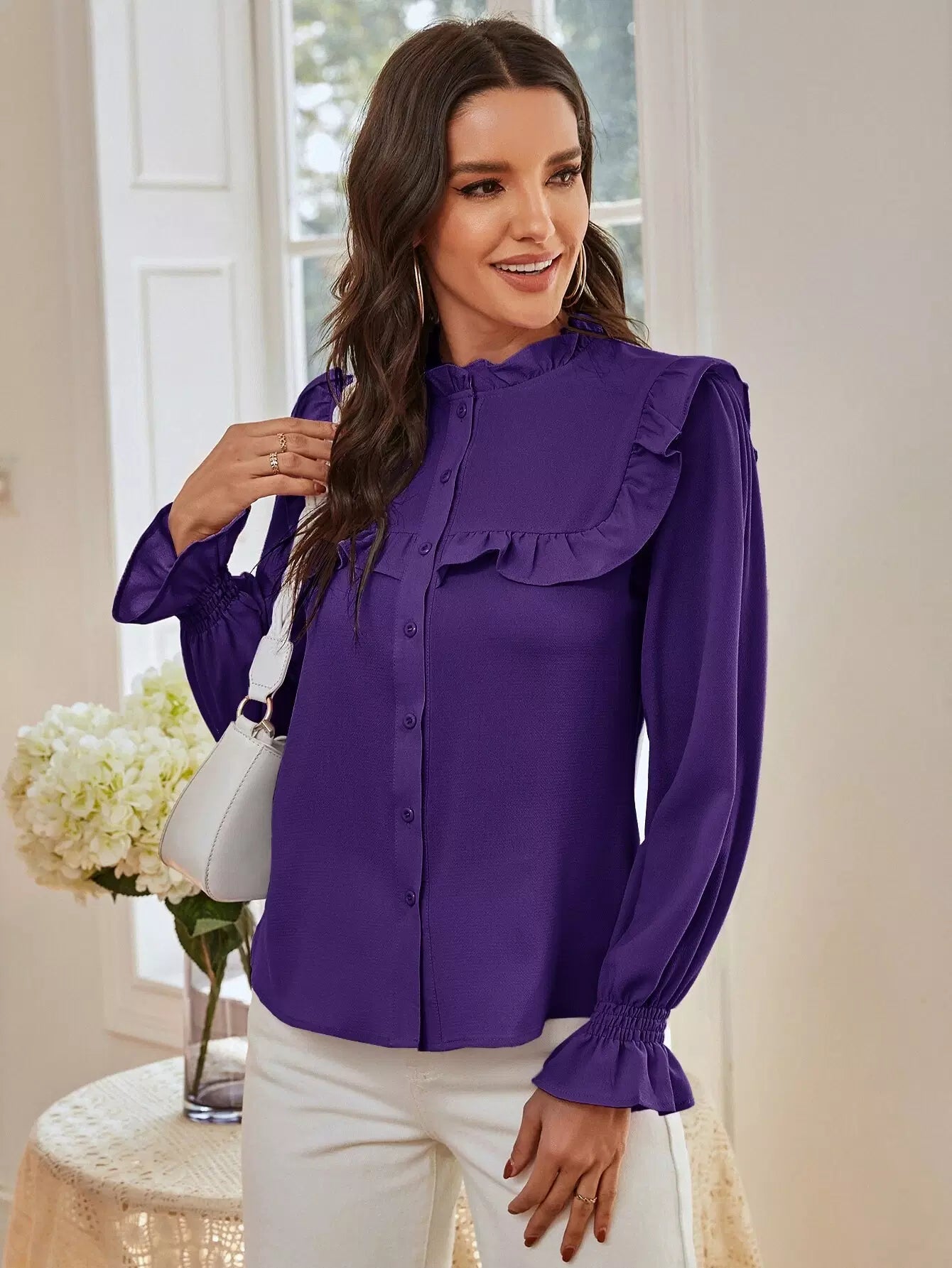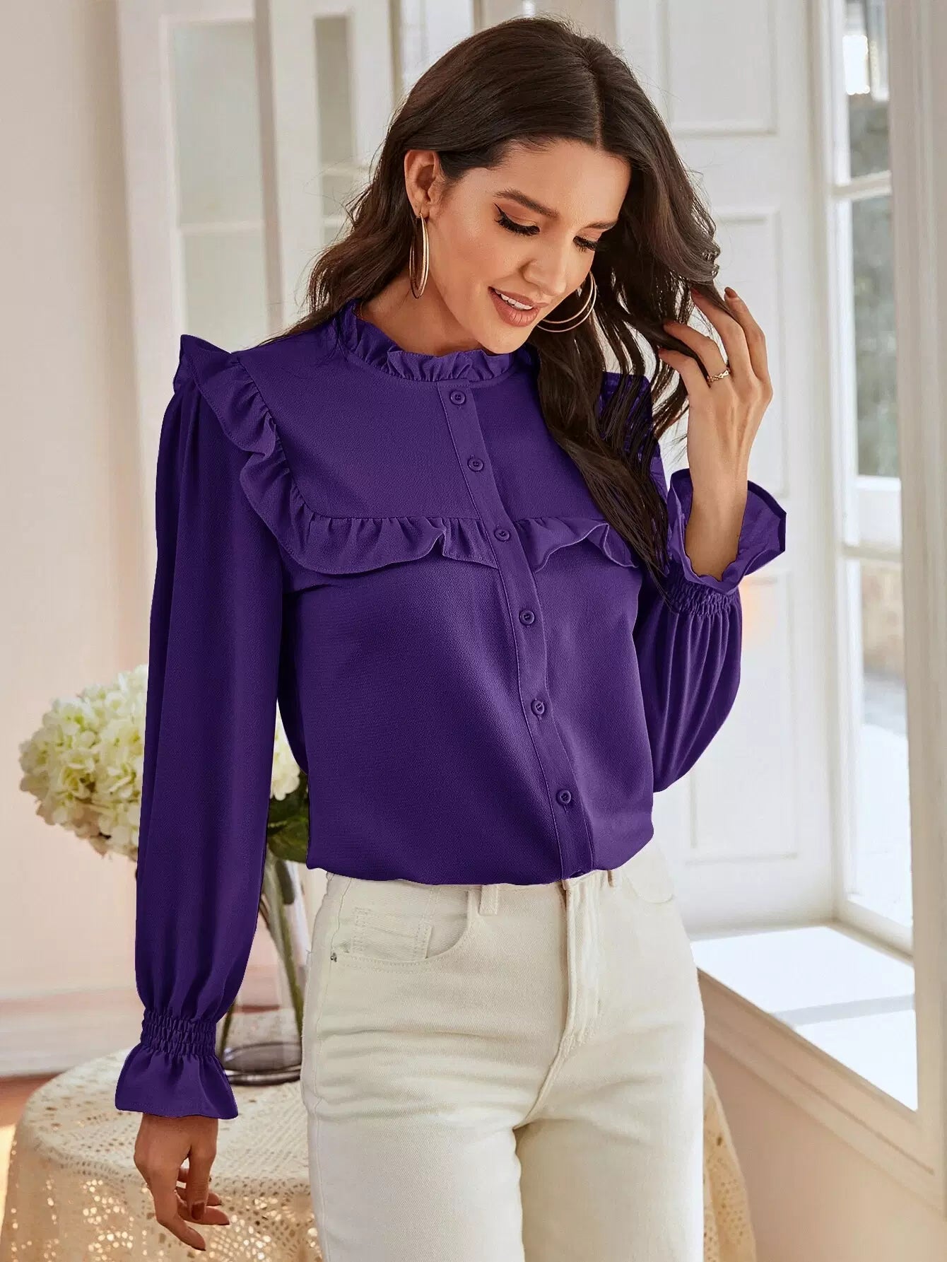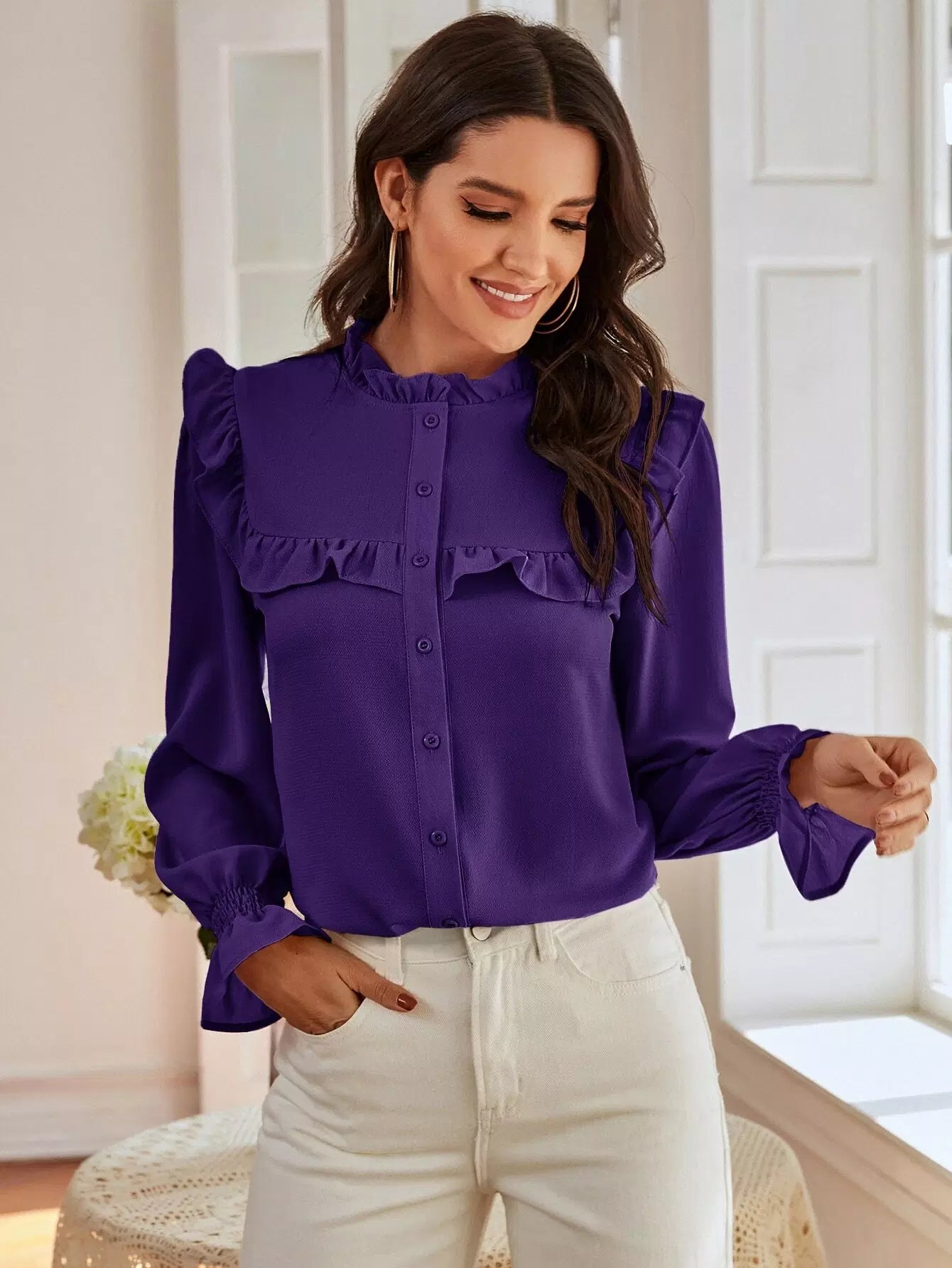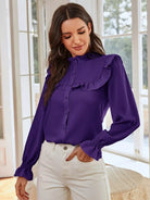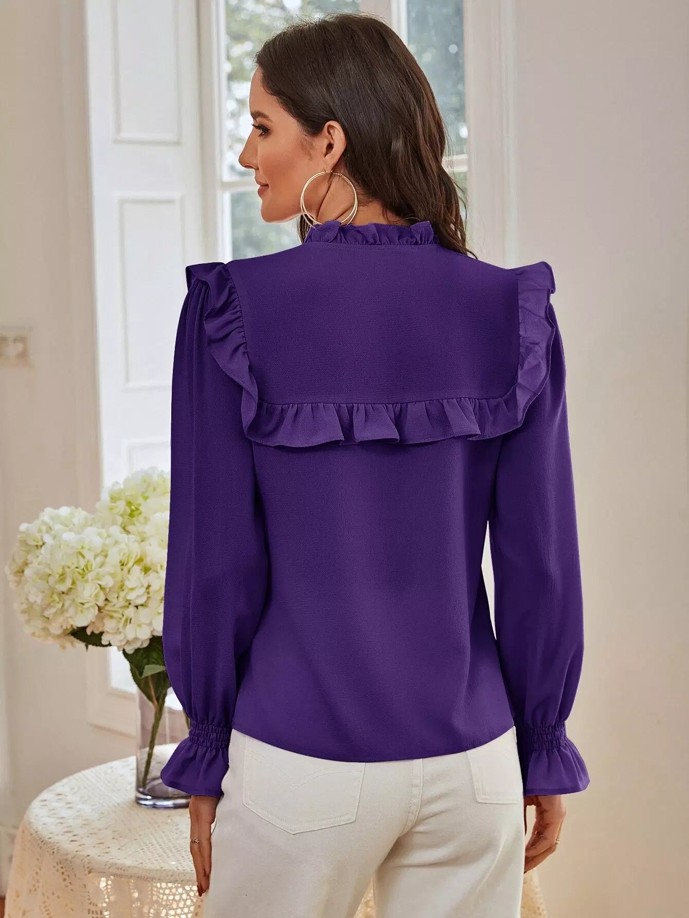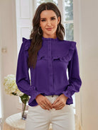 Ruffle Neck Flounce Sleeve Solid Blouse