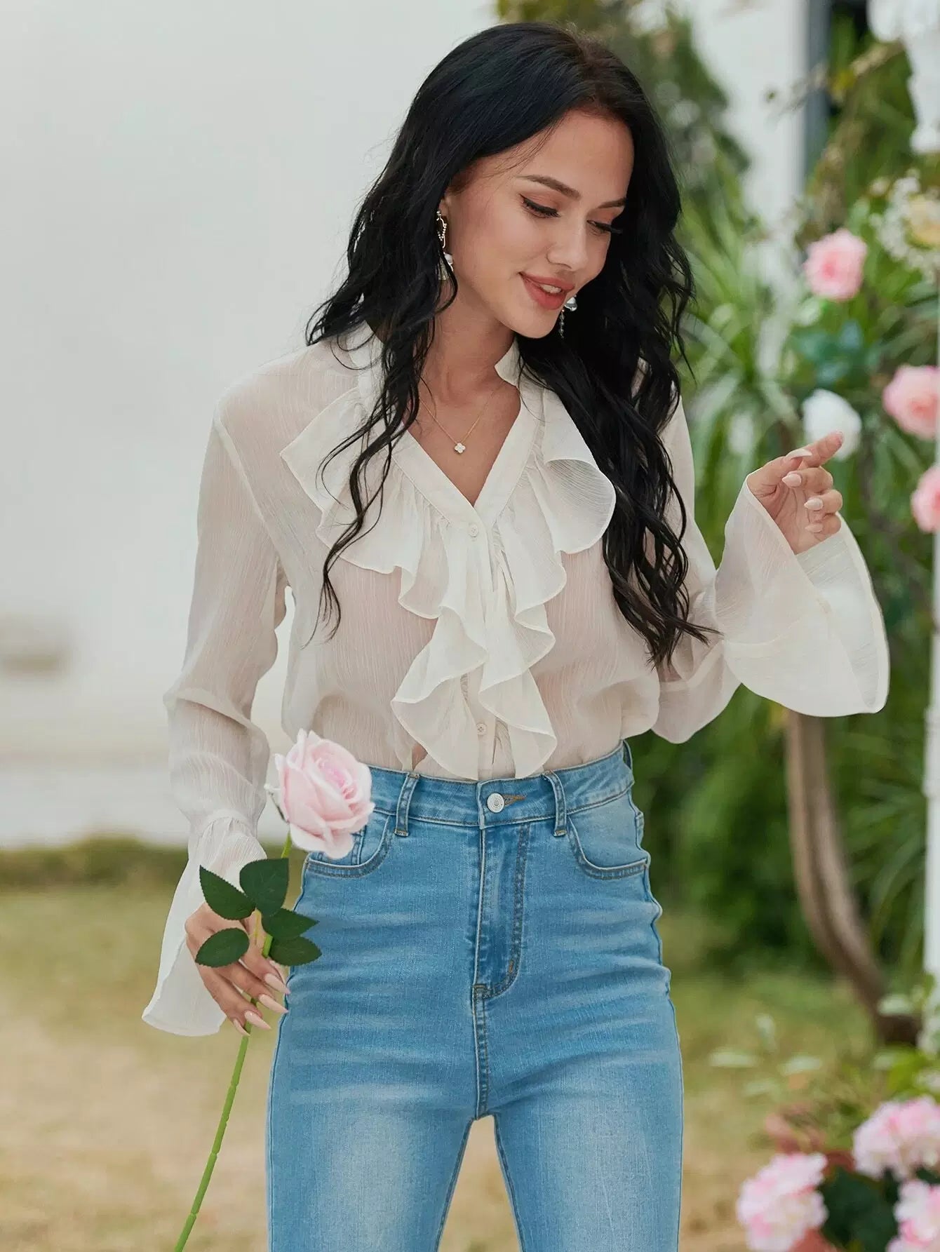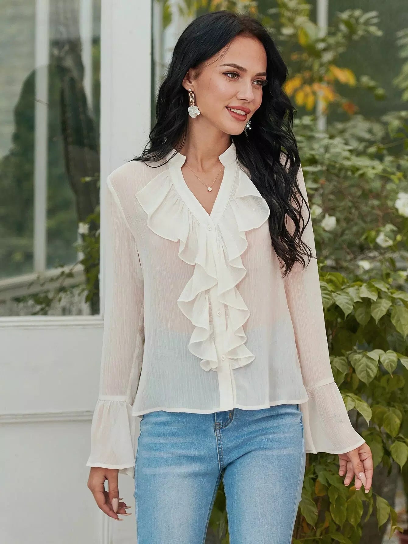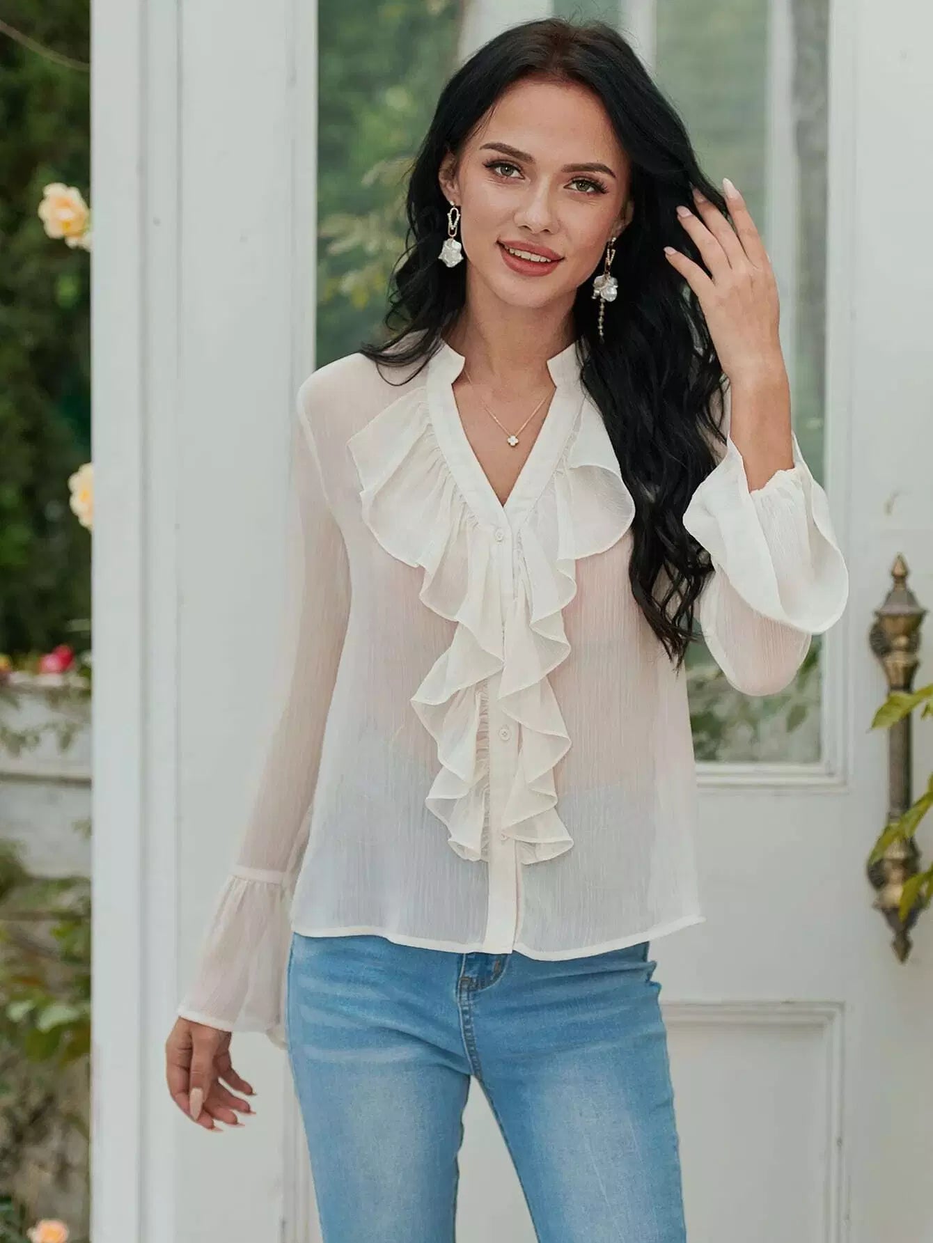 Women - Ruffle Trim Button Up Chiffon Blouse