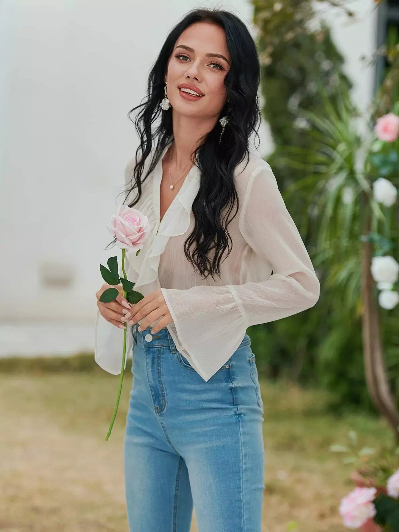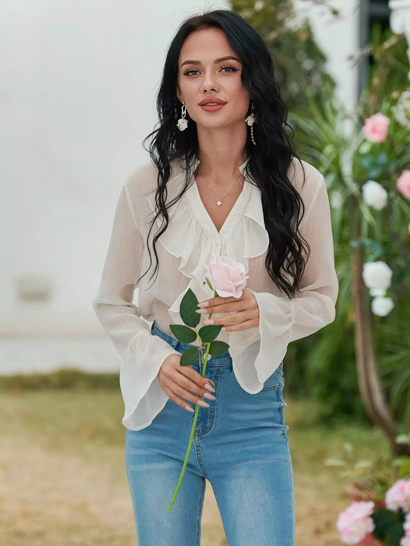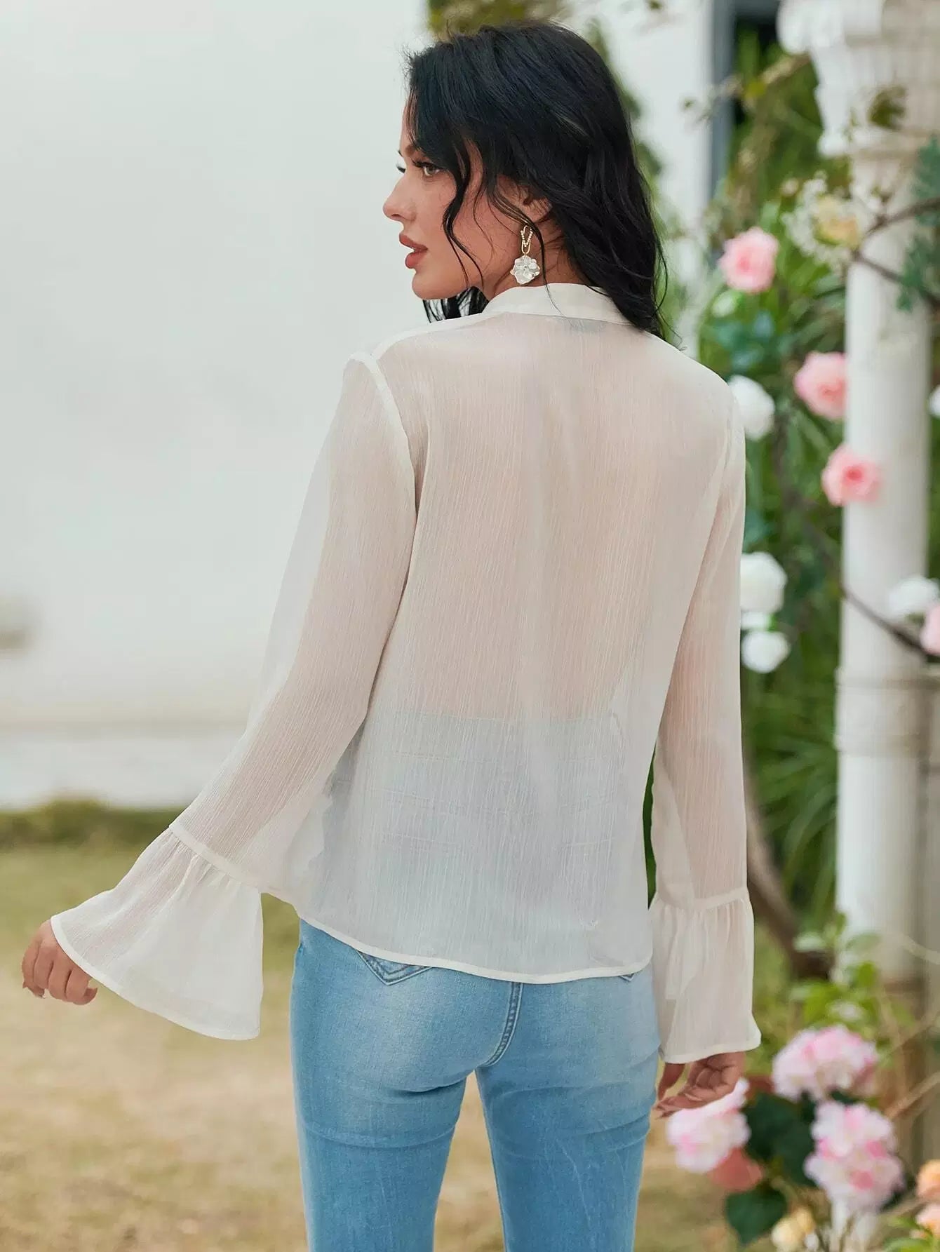 Women - Ruffle Trim Button Up Chiffon Blouse