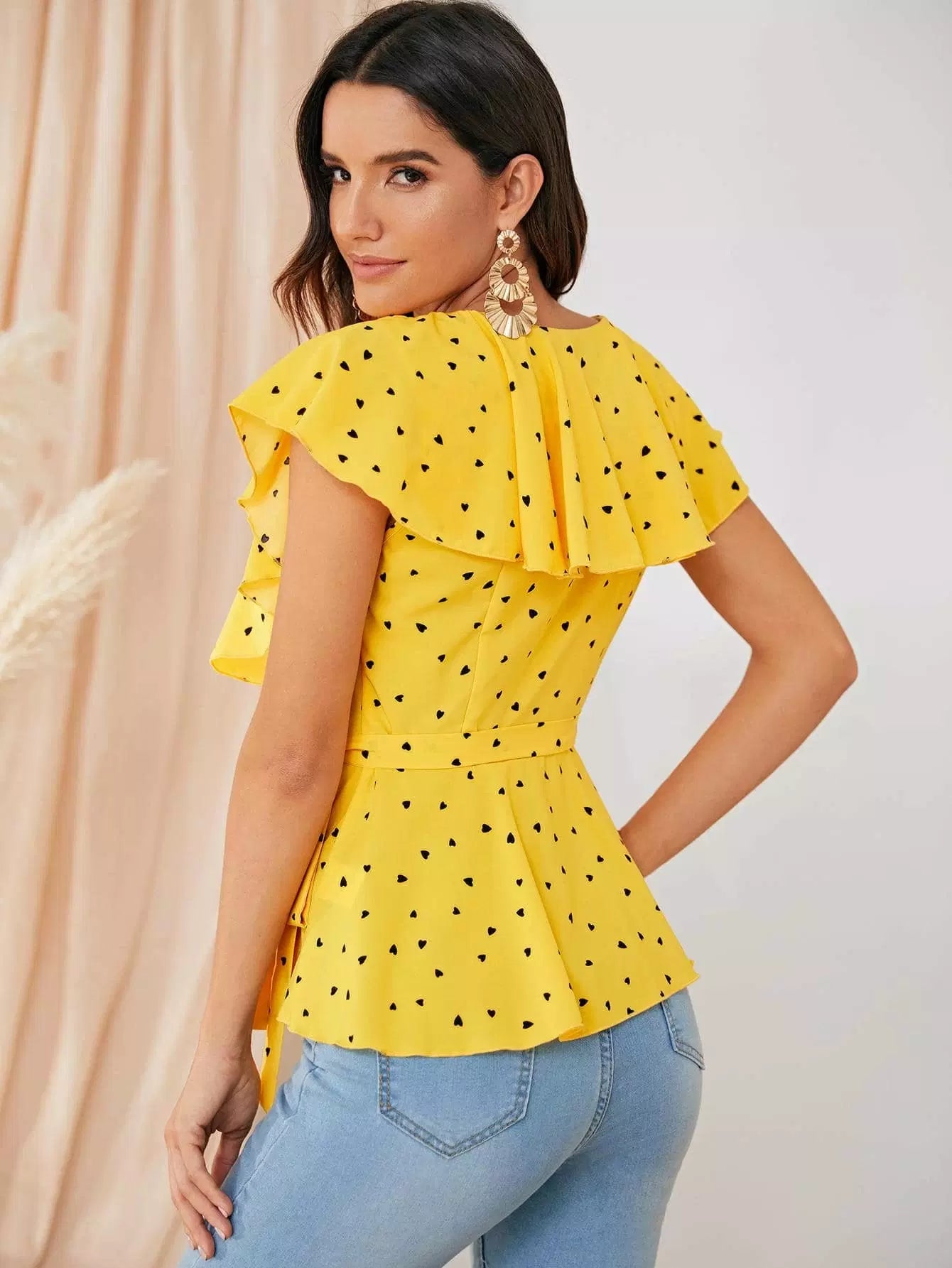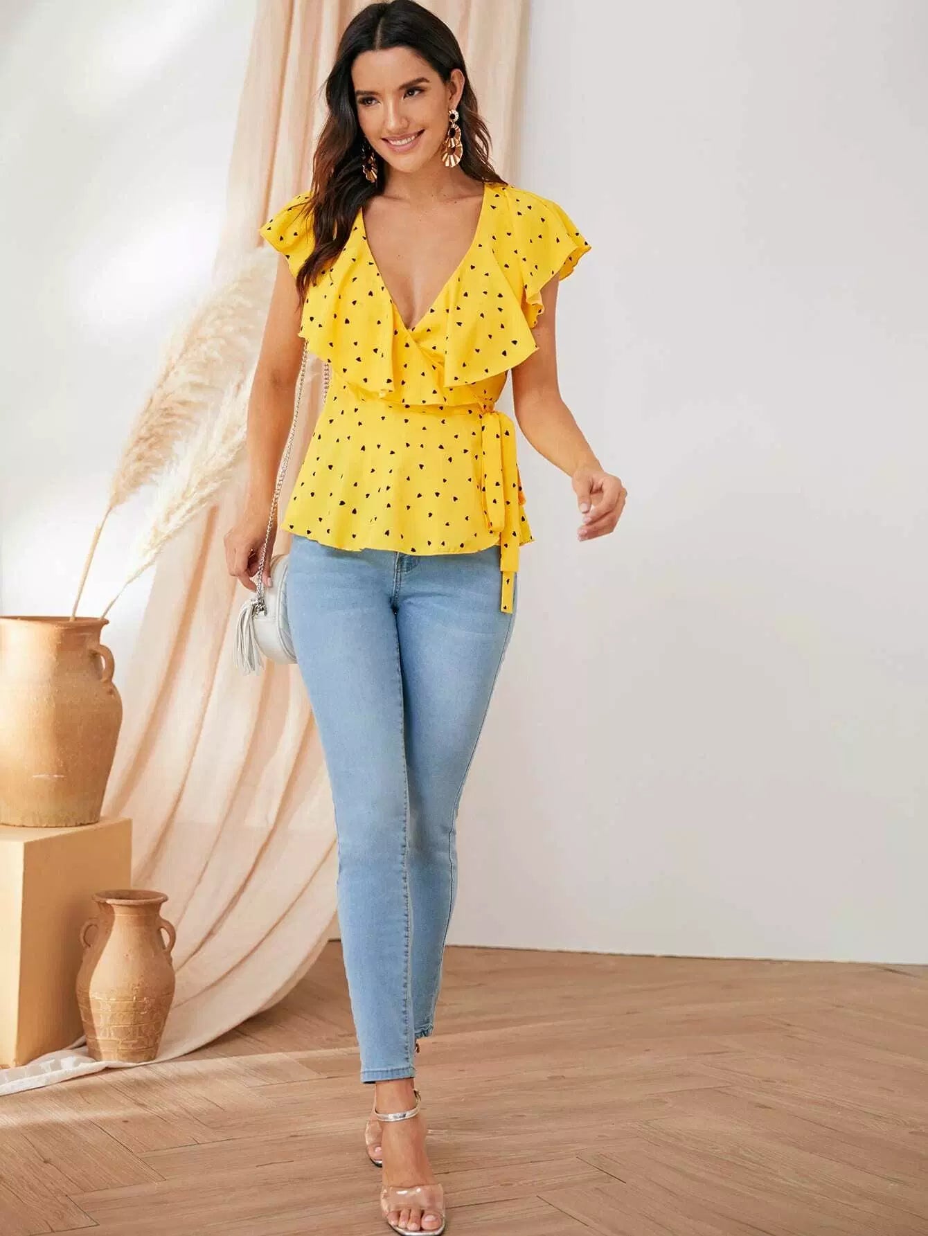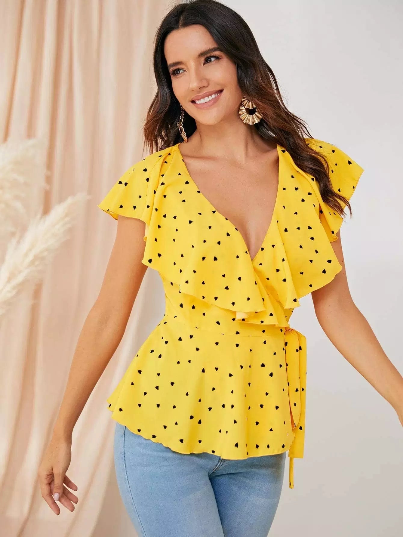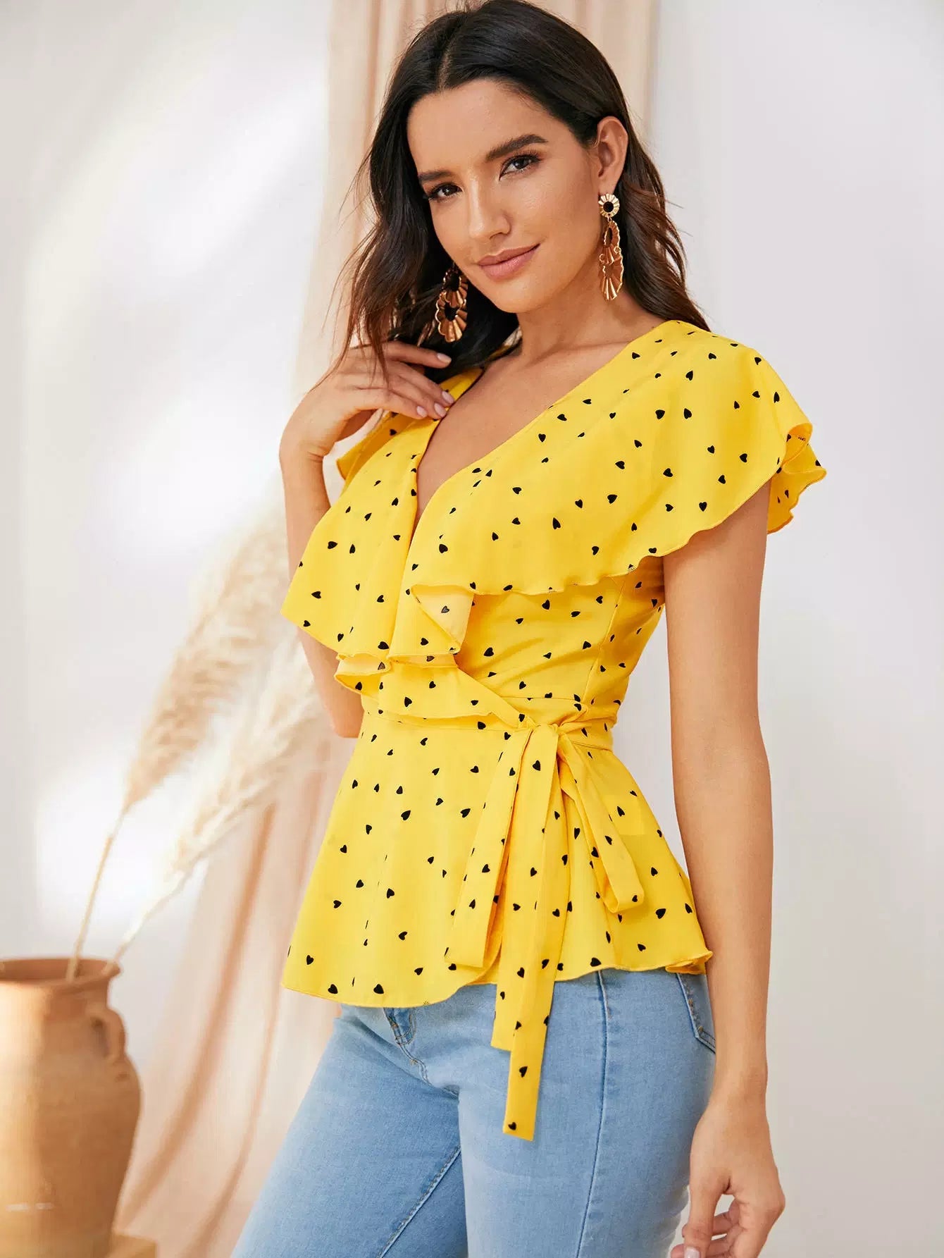 Ruffle Trim Confetti Heart Print Wrap Knot Top