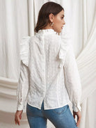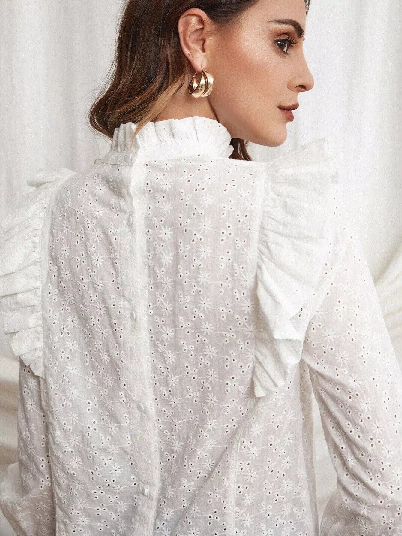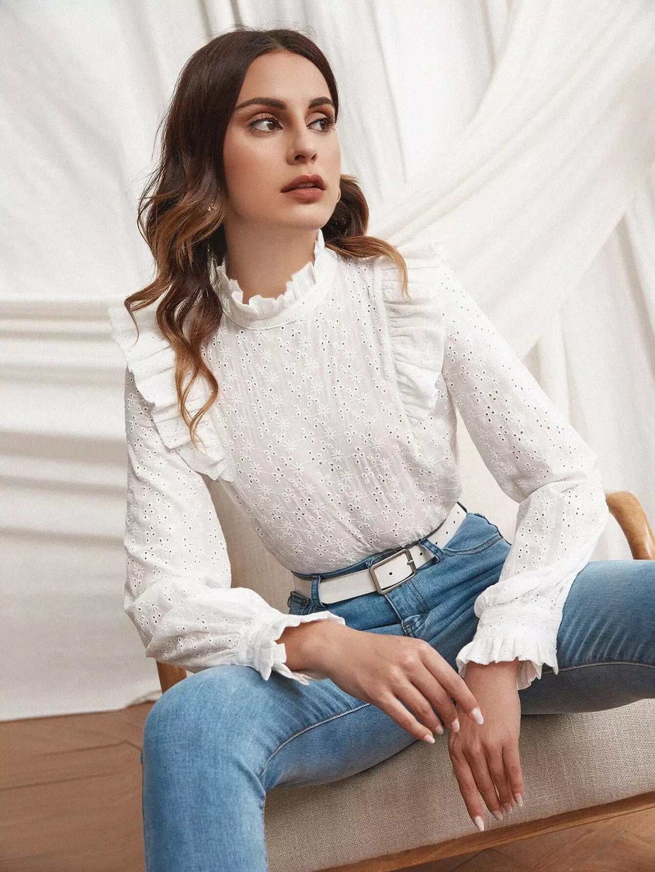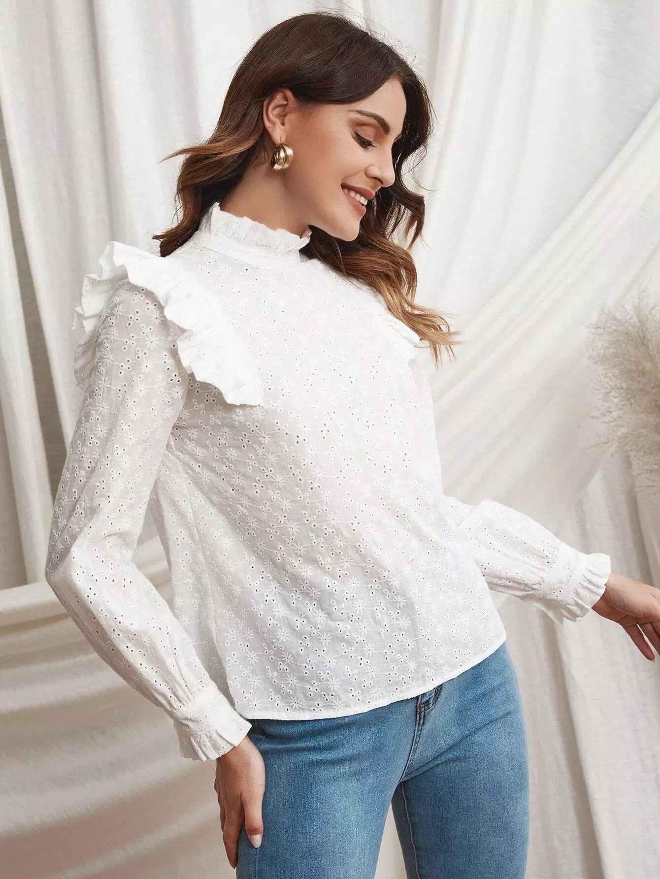 Ruffle Trim Flounce Sleeve Schiffy Embroidered Top