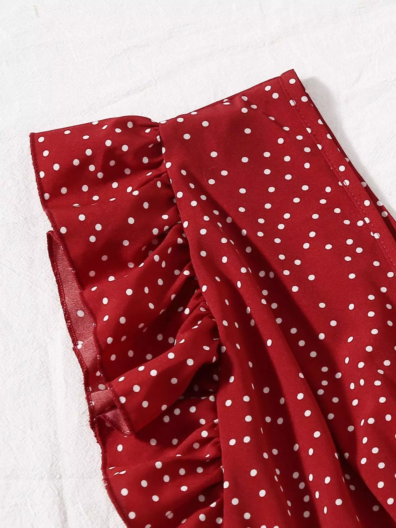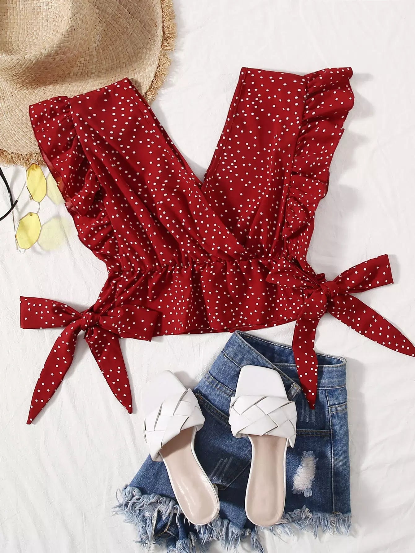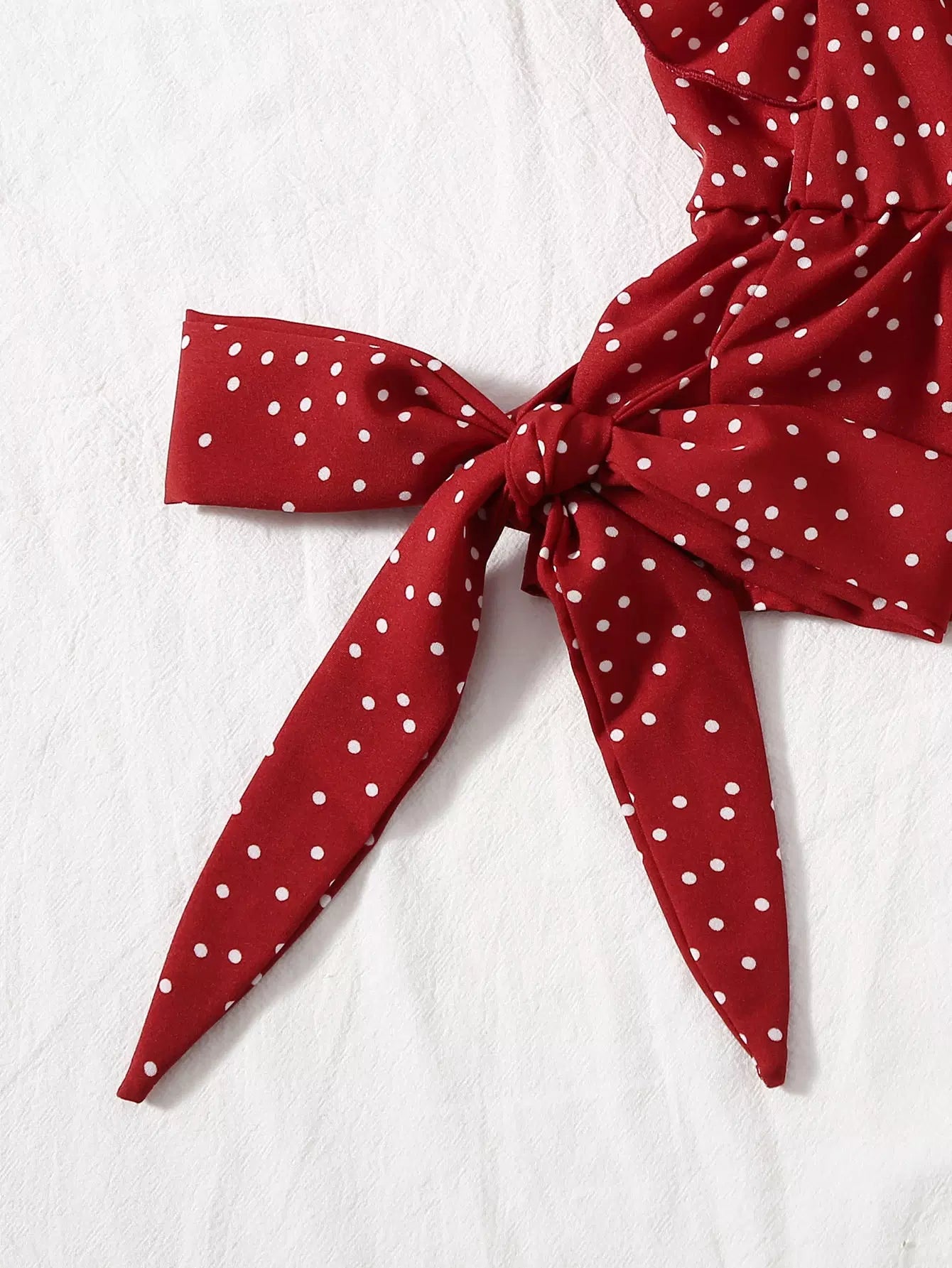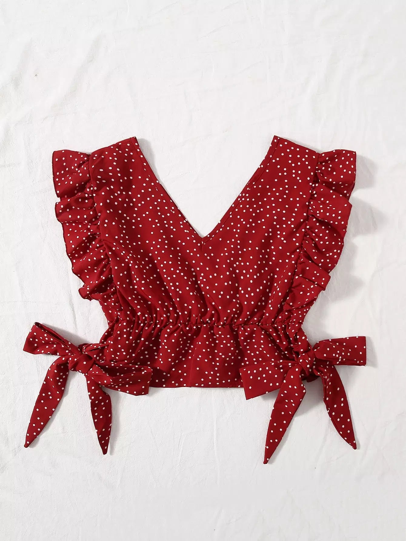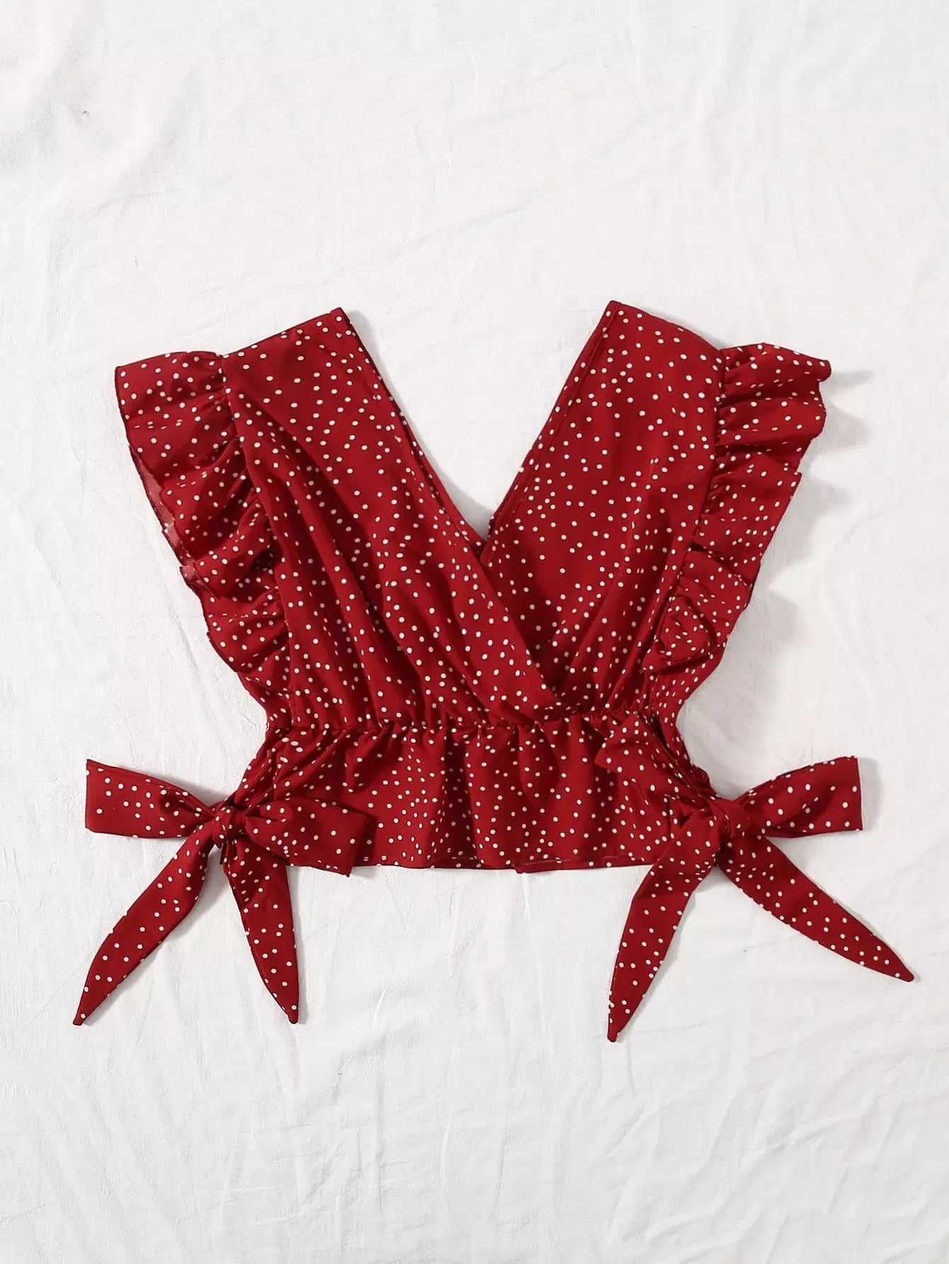 Ruffle Trim Surplice Neck Knot Polka Dot Top
