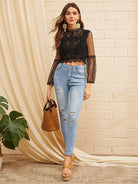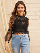 Sheer Mesh Sleeve Guipure Lace Crop Blouse