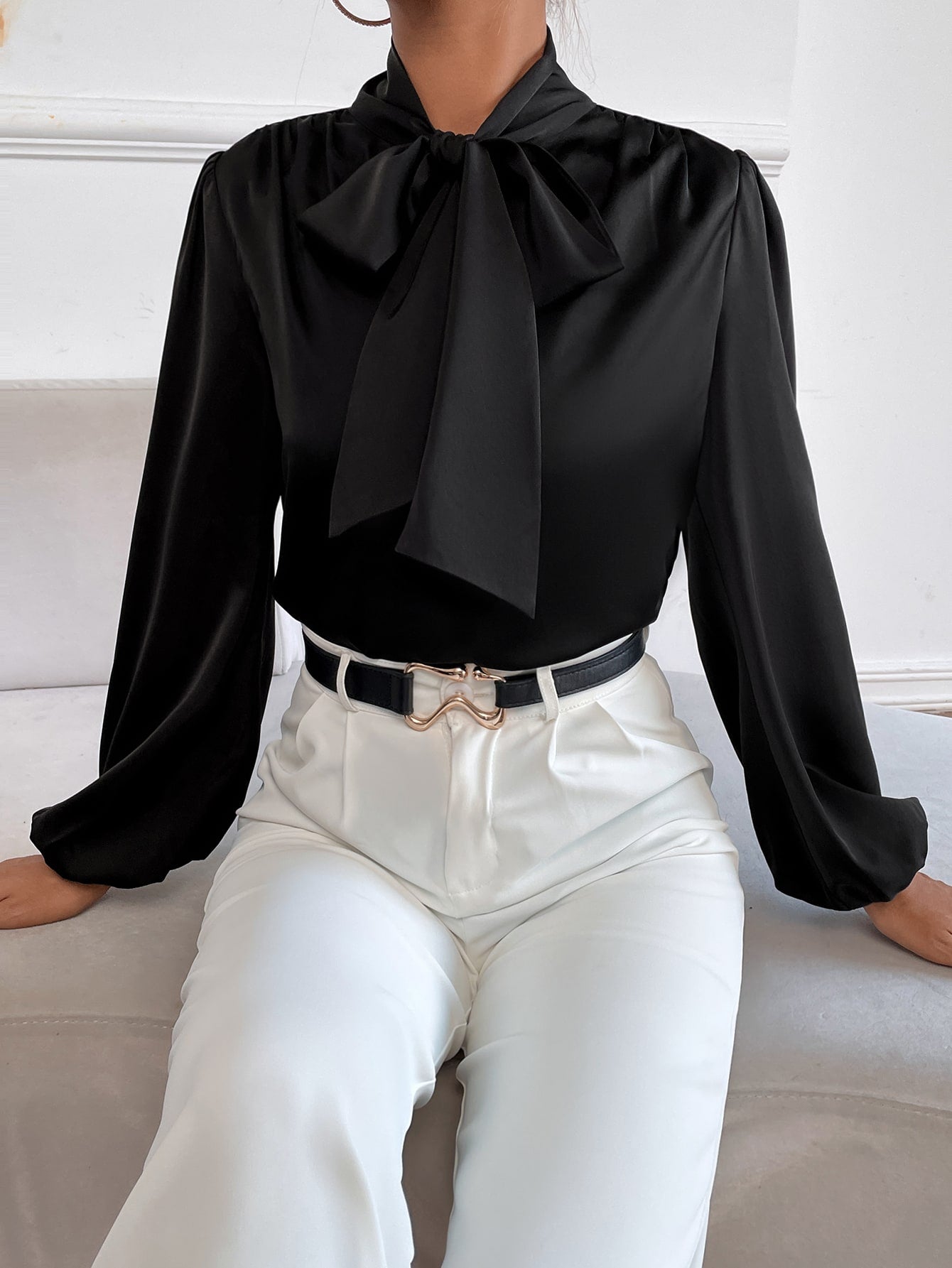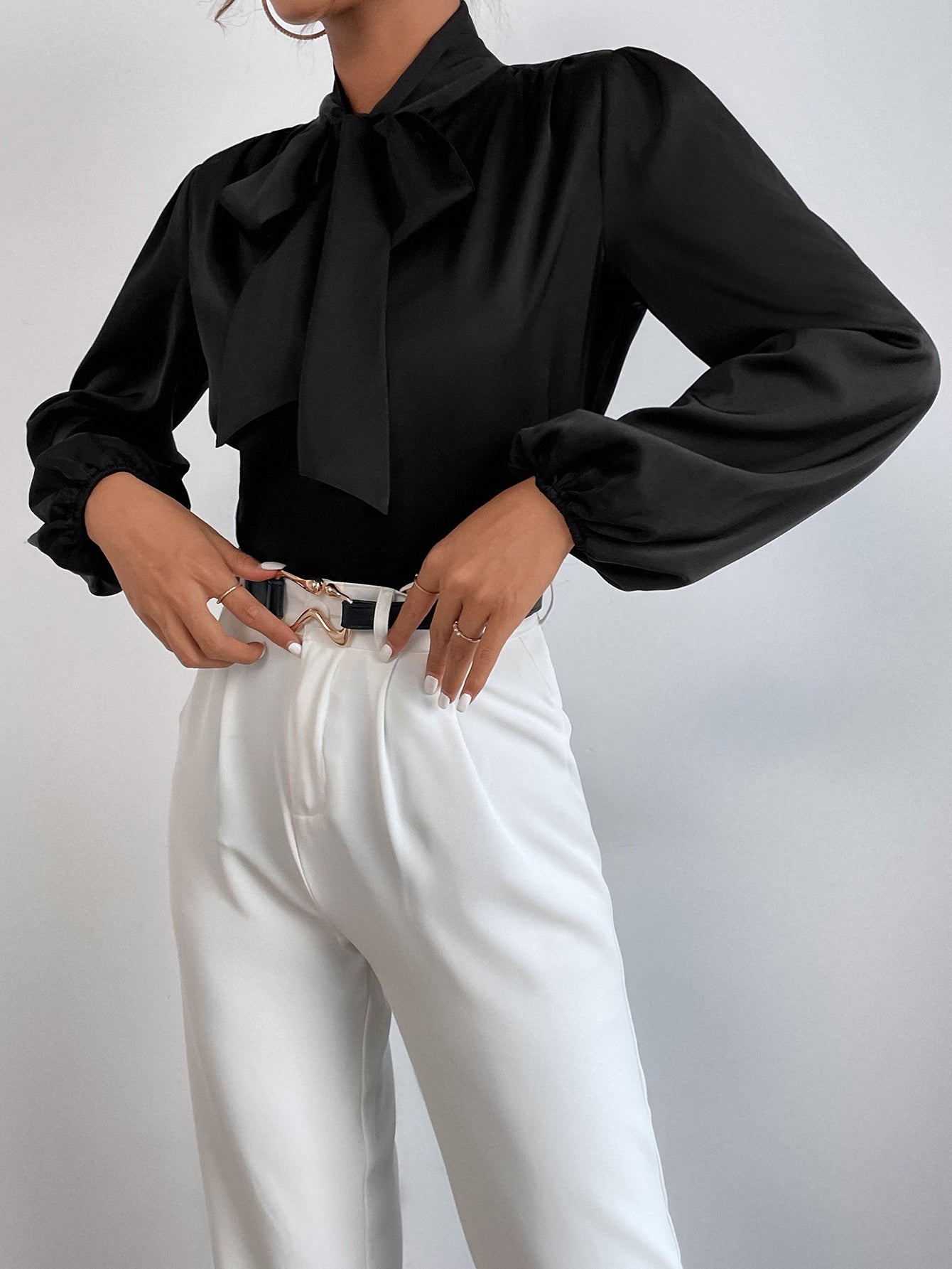 women SHEIN BAE Satin Tie Neck Bishop Sleeve Blouse
