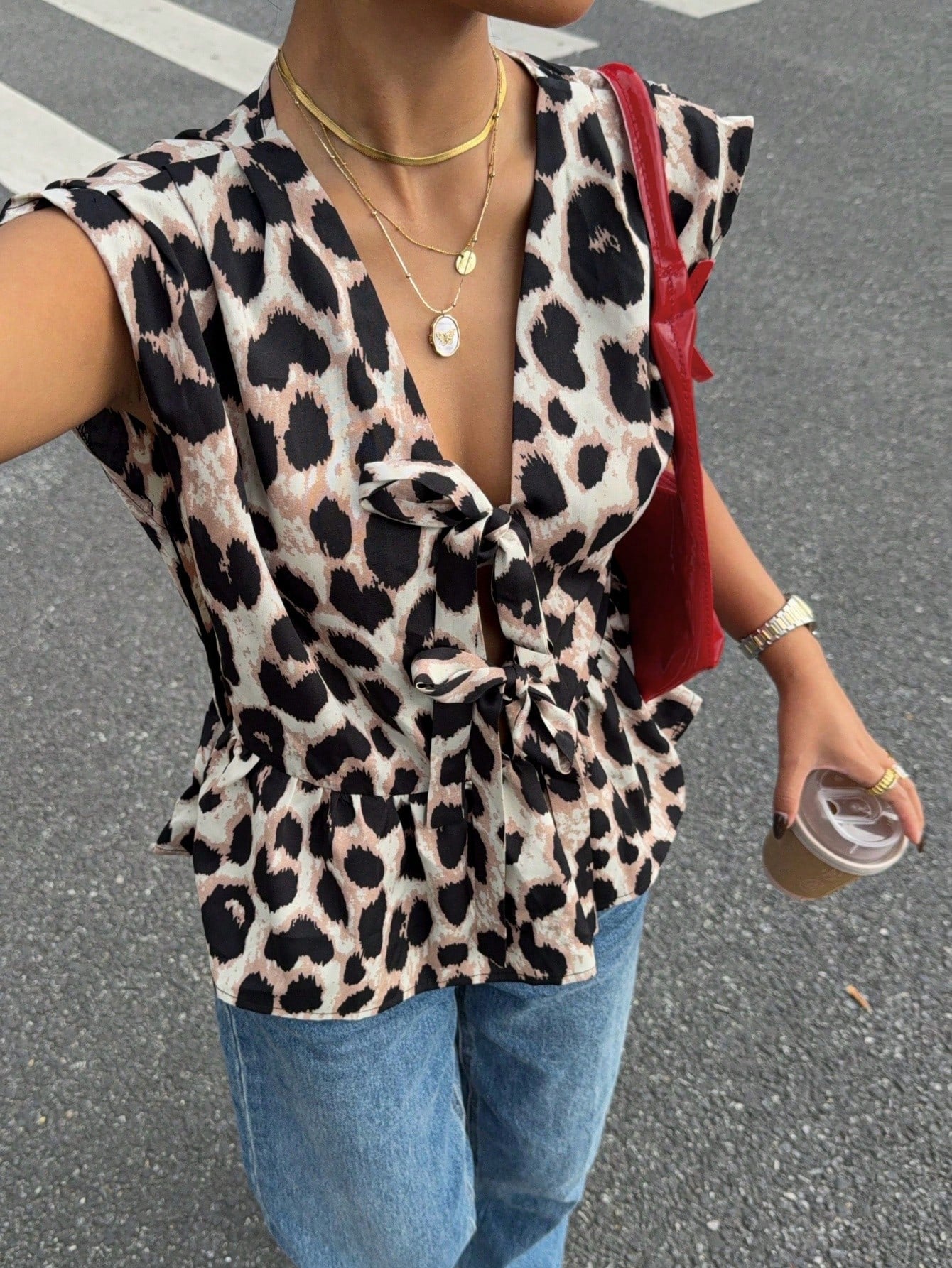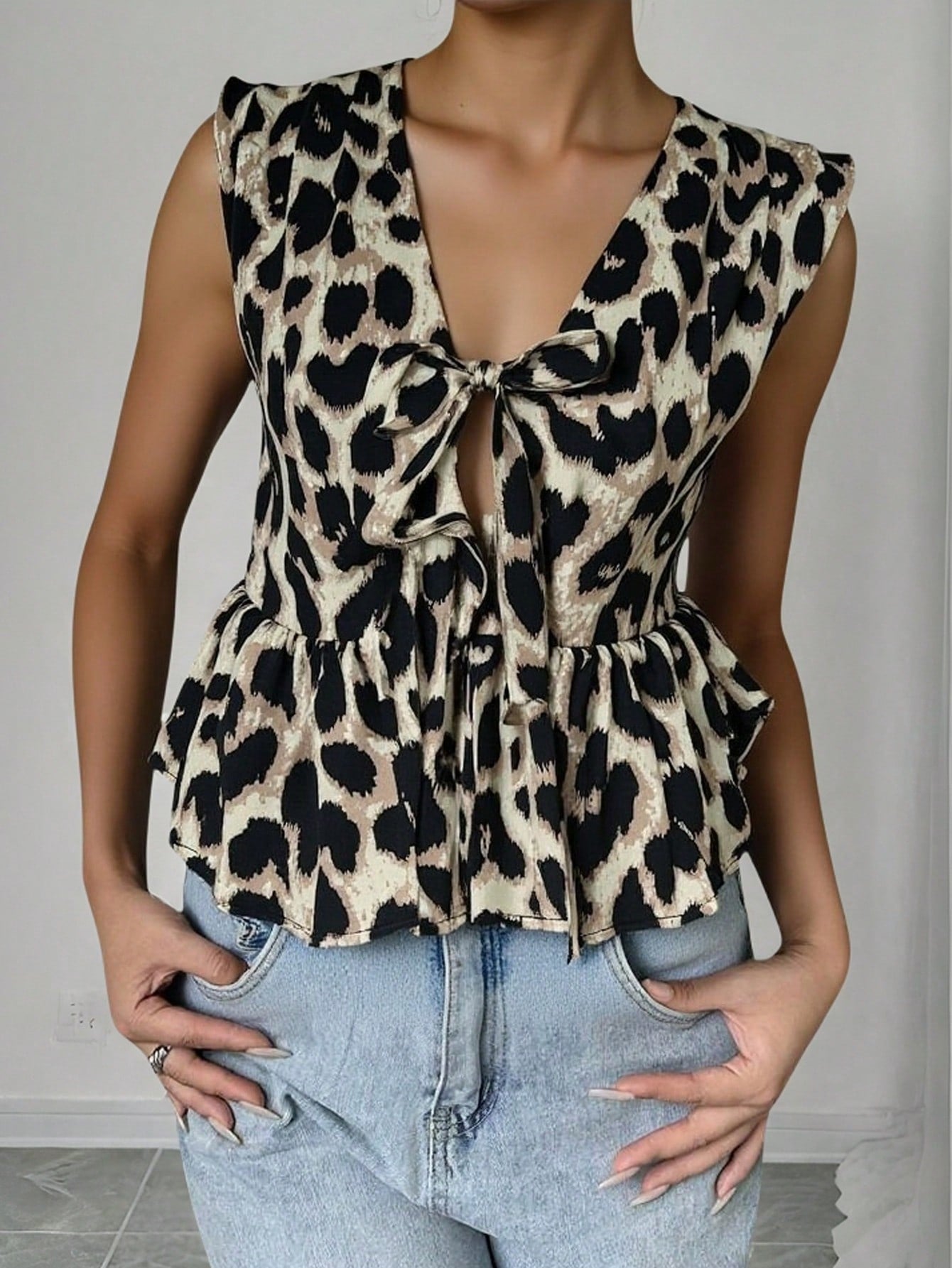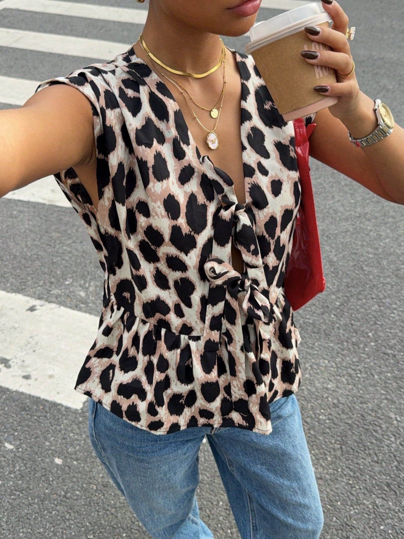 SHEIN Essnce Women's Leopard Print Tie Front Ruffle Hem Sleeveless Shirt With Animal Print