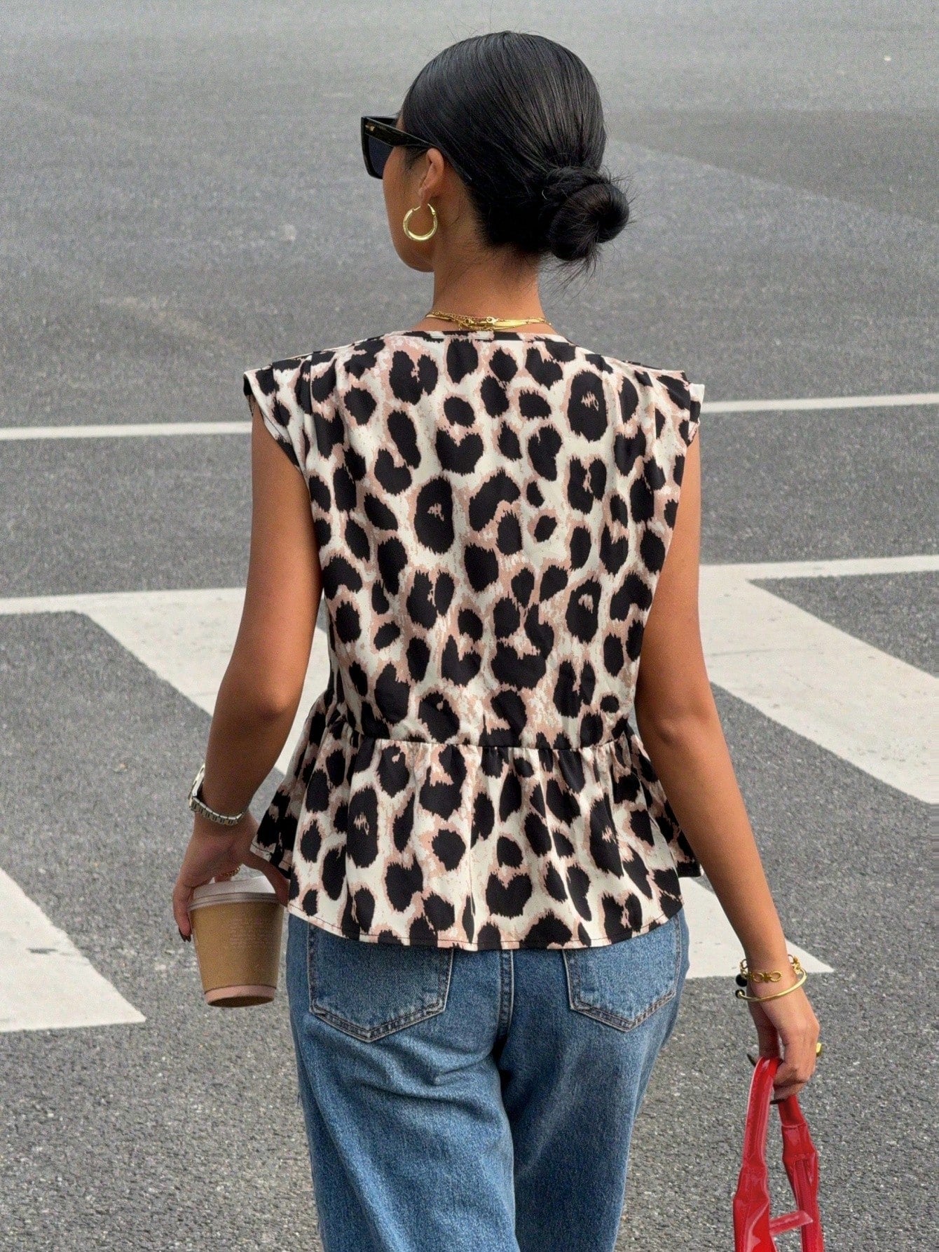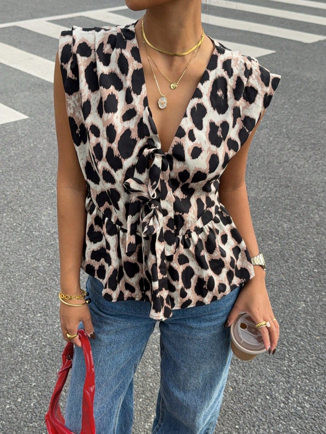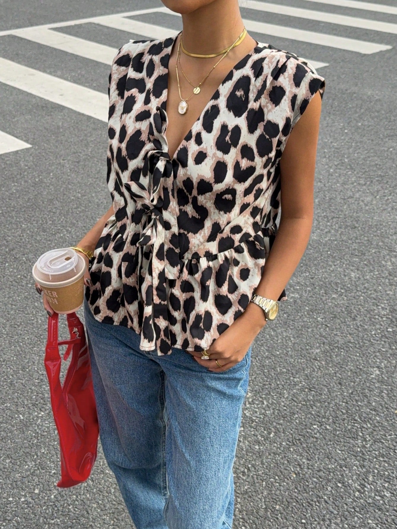 SHEIN Essnce Women's Leopard Print Tie Front Ruffle Hem Sleeveless Shirt With Animal Print