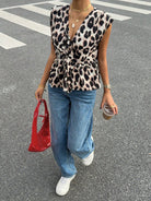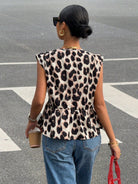 women SHEIN Essnce Women's Leopard Print Tie Front Ruffle Hem Sleeveless Shirt With Animal Print