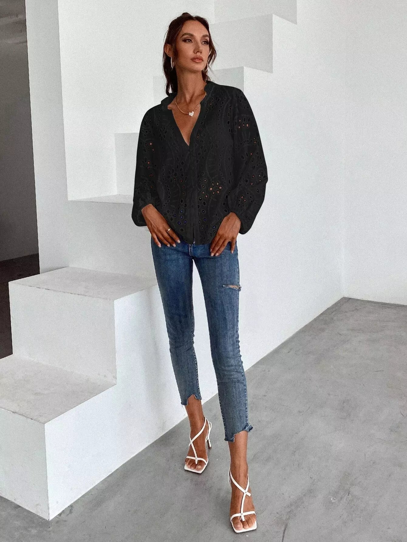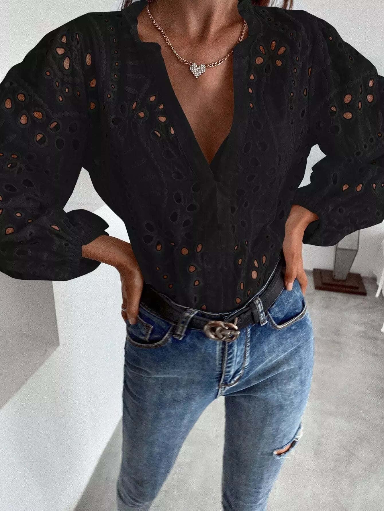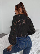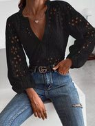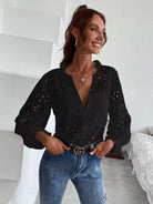 Solid Eyelet Embroidery Notched Blouse