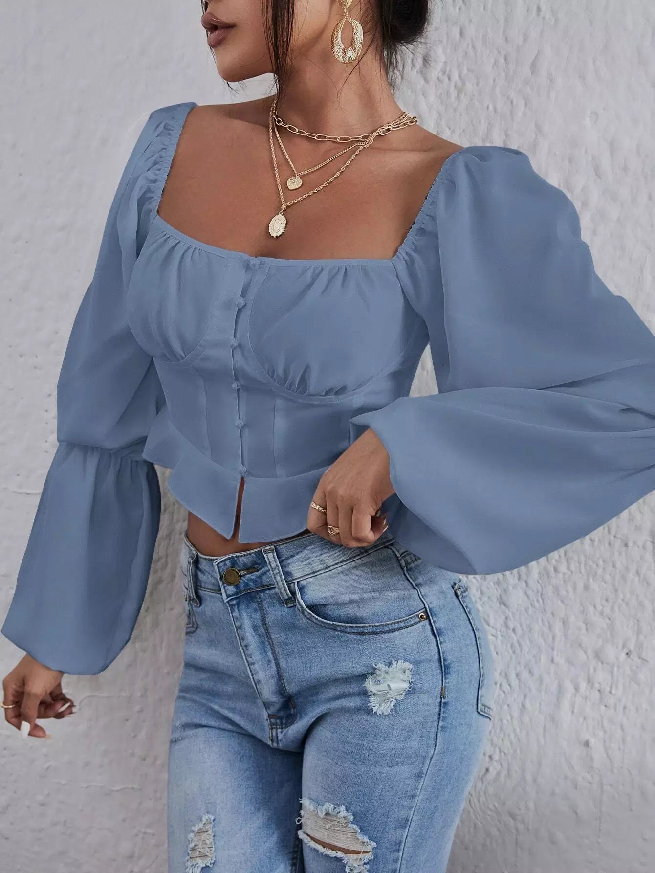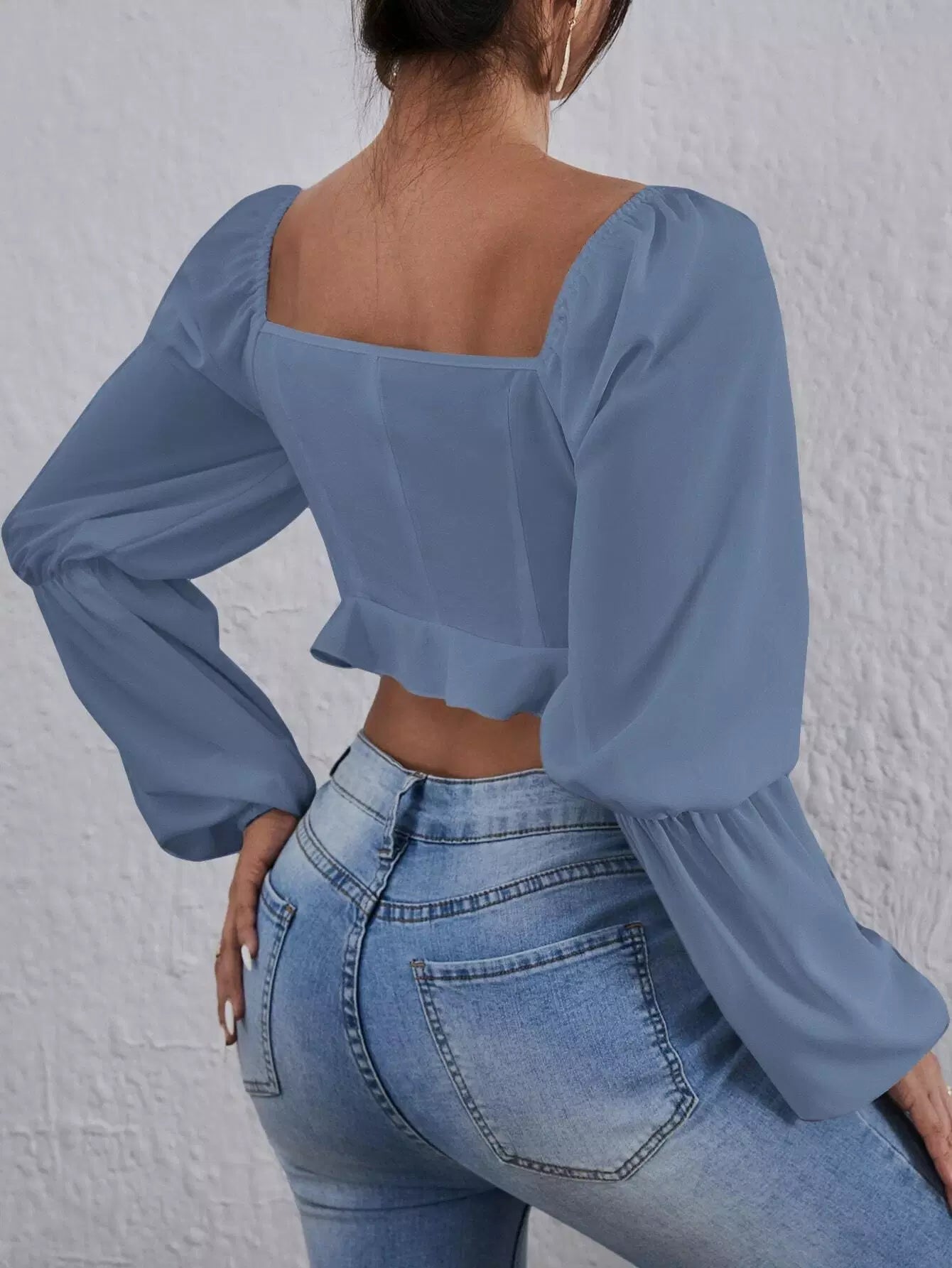 Square Neck Lantern Sleeve Ruched Crop Blouse