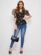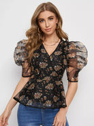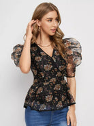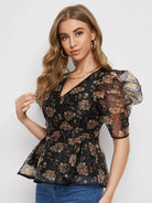 Surplice Neck Puff Sleeve Floral Organza Peplum Top
