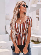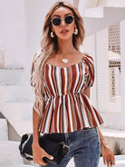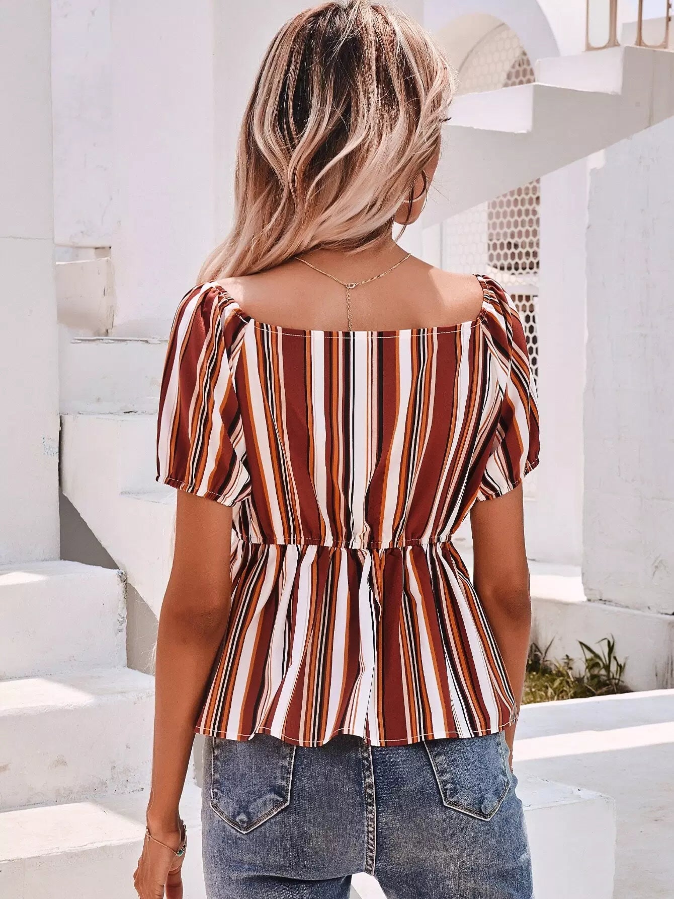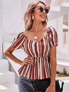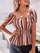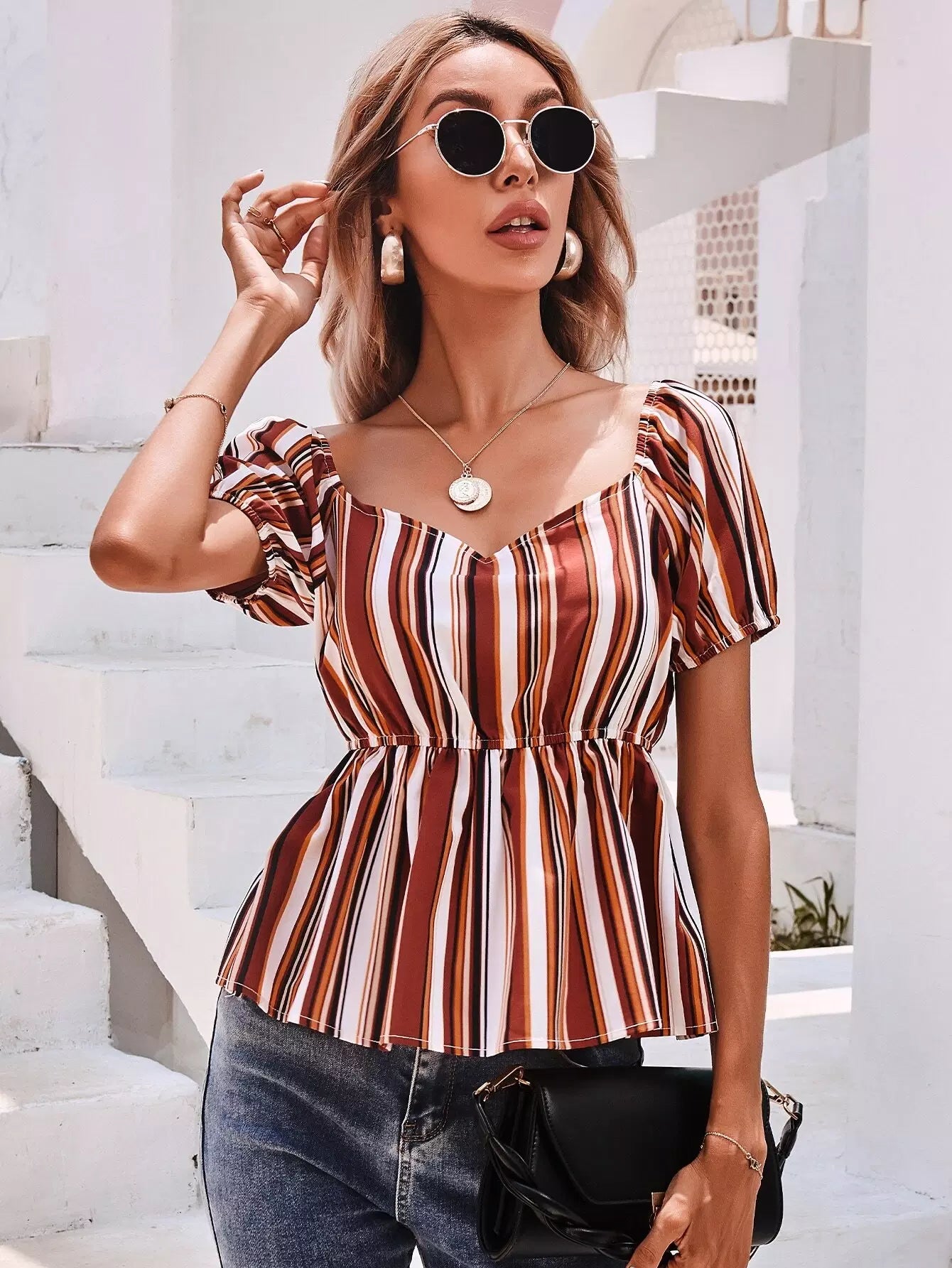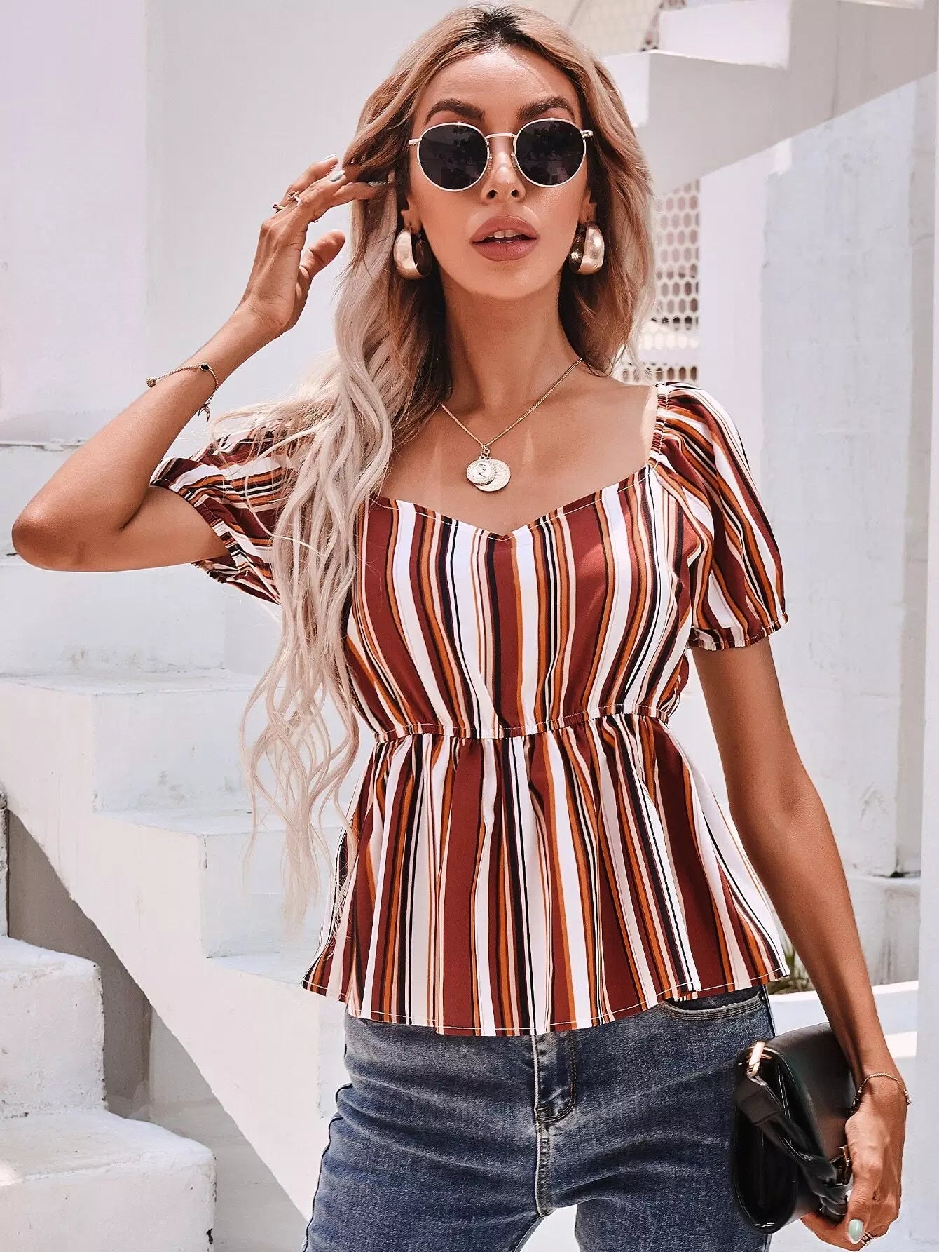 Sweetheart Neck Puff Sleeve Striped Print Peplum Top