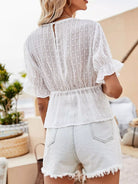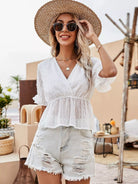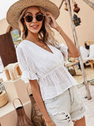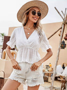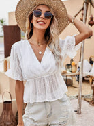 Women - Swiss Dot Flounce Sleeve Surplice Neck Peplum Blouse