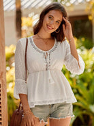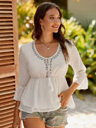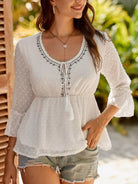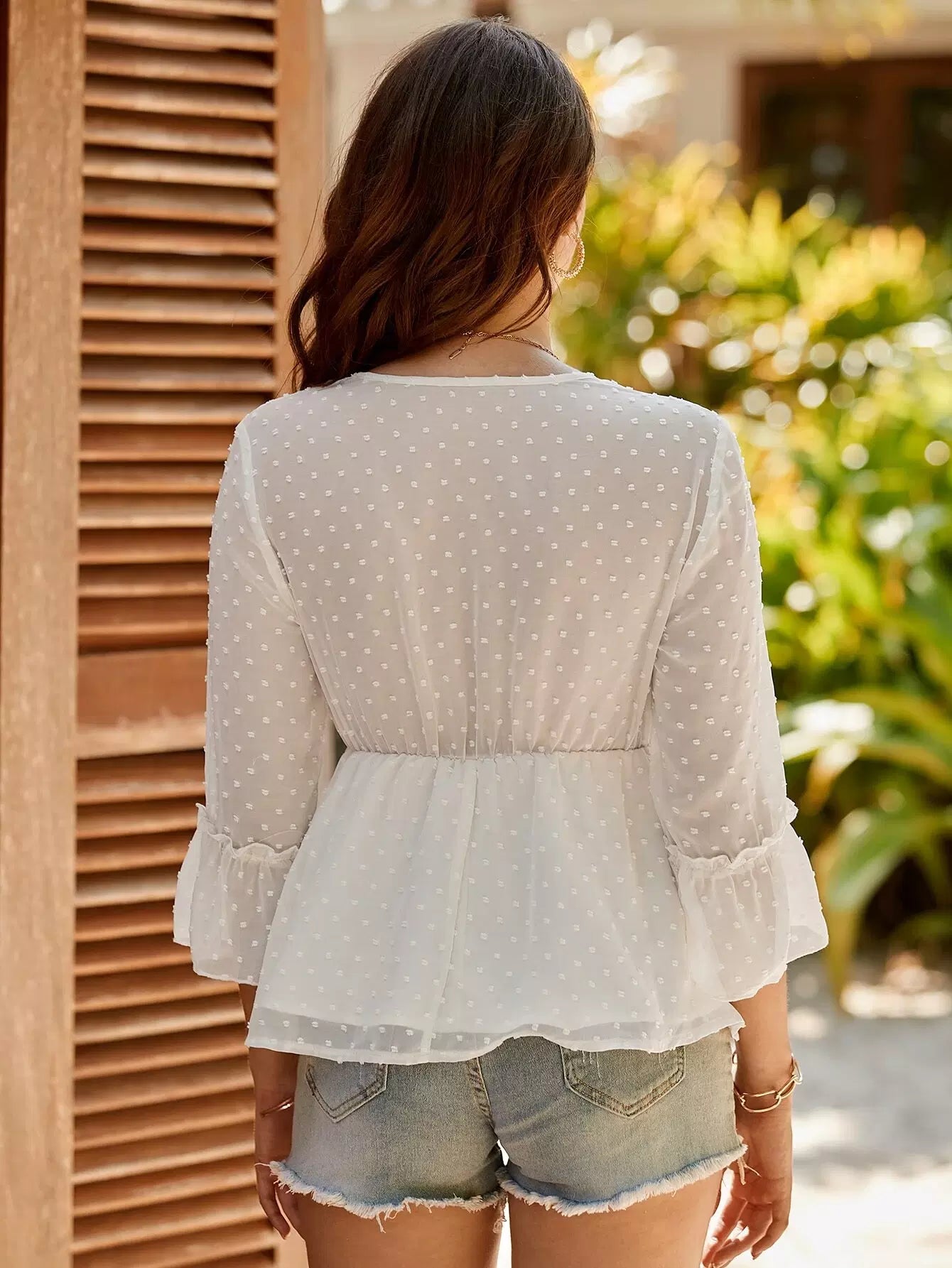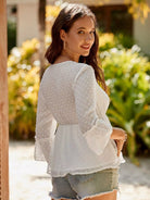 Swiss Dot Tassel Tie Neck Flounce Sleeve Peplum Blouse