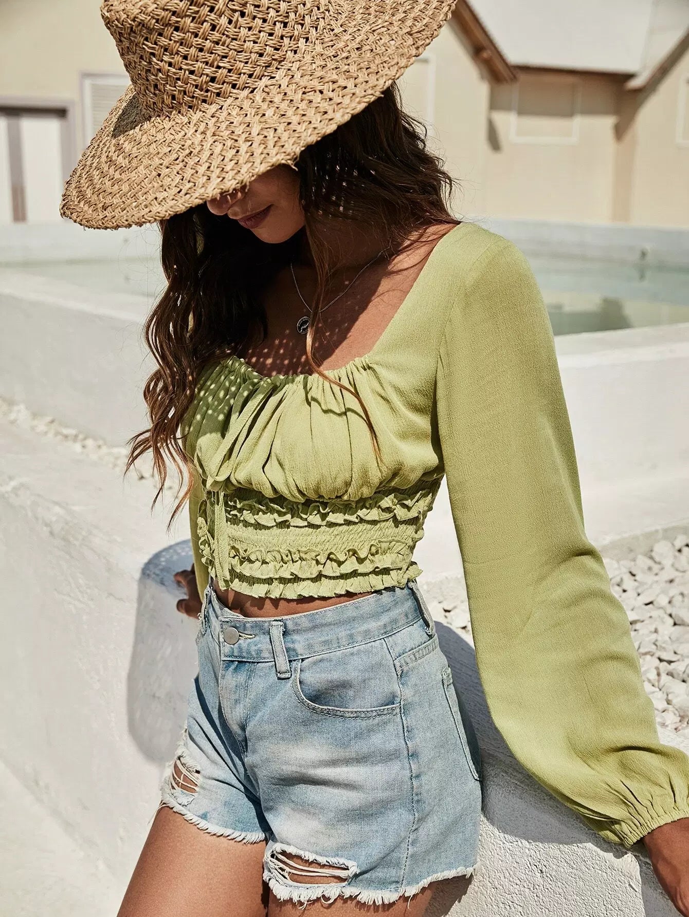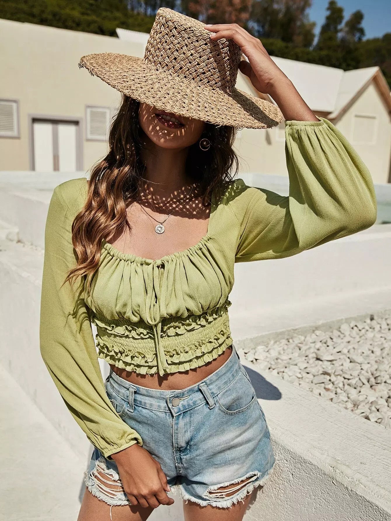 Tie Front Ruched Bust Shirred Crop Blouse