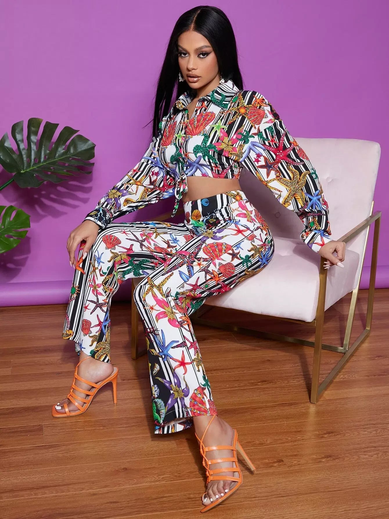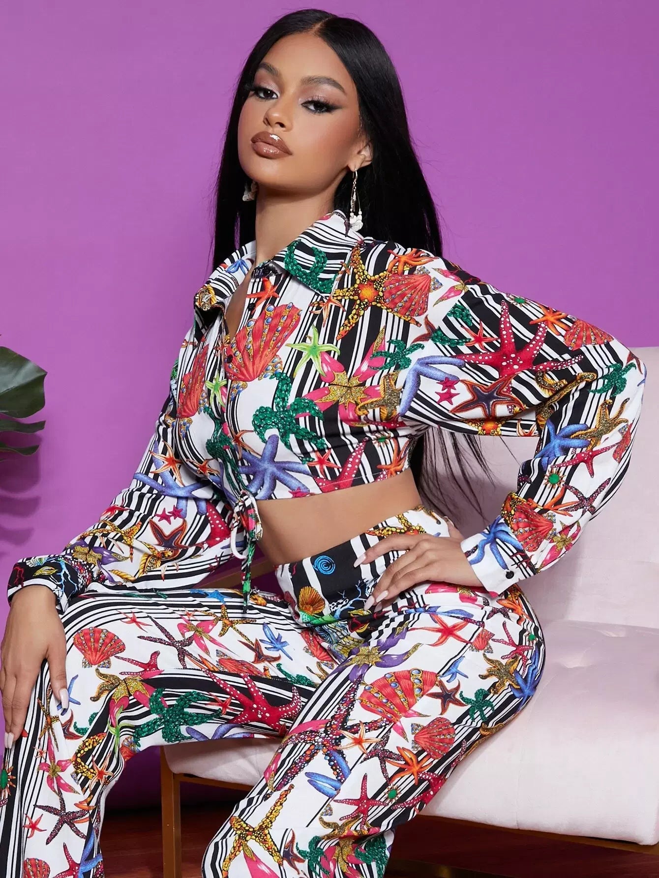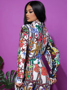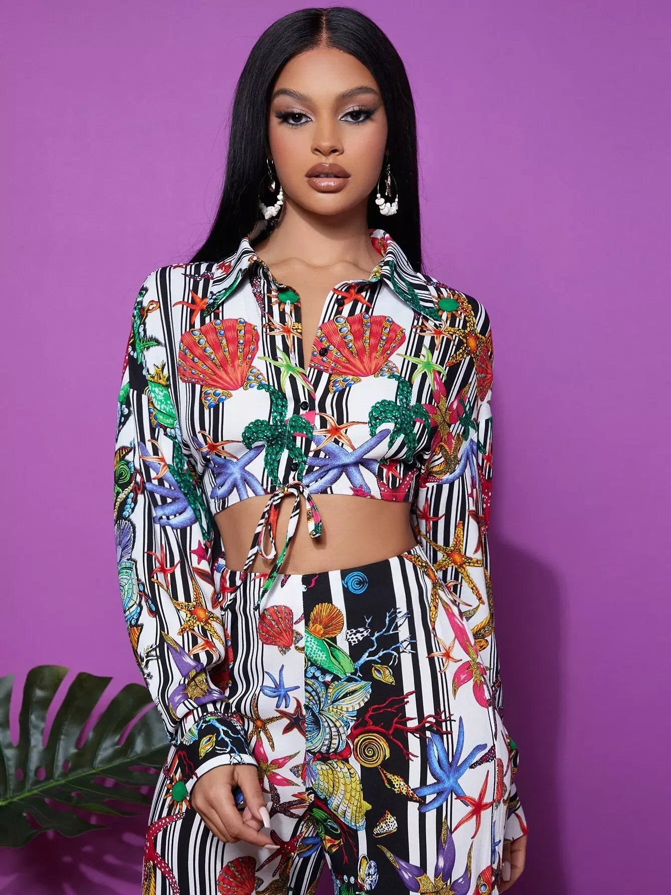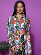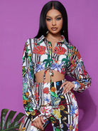 Tie Hem Graphic Print Striped Blouse