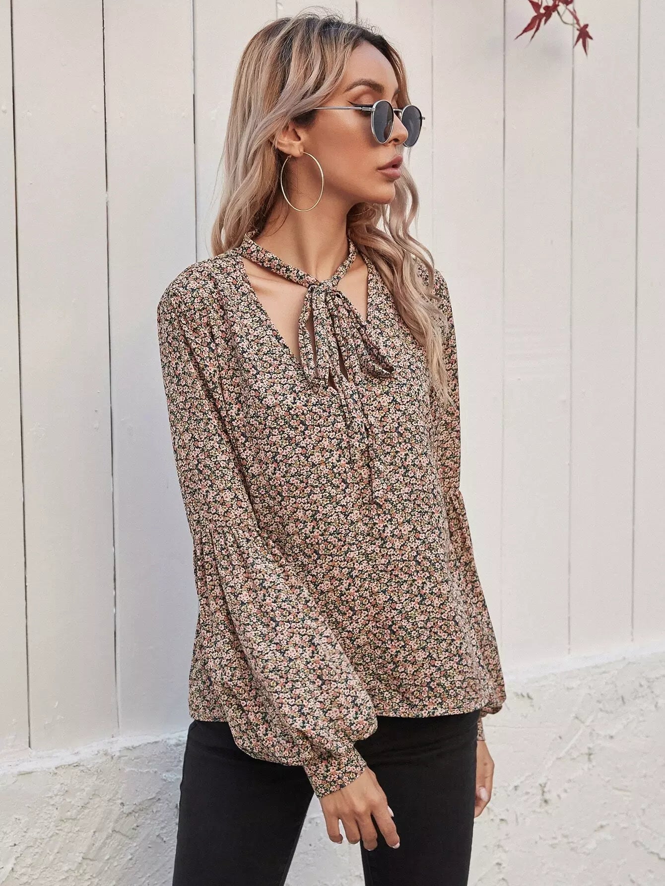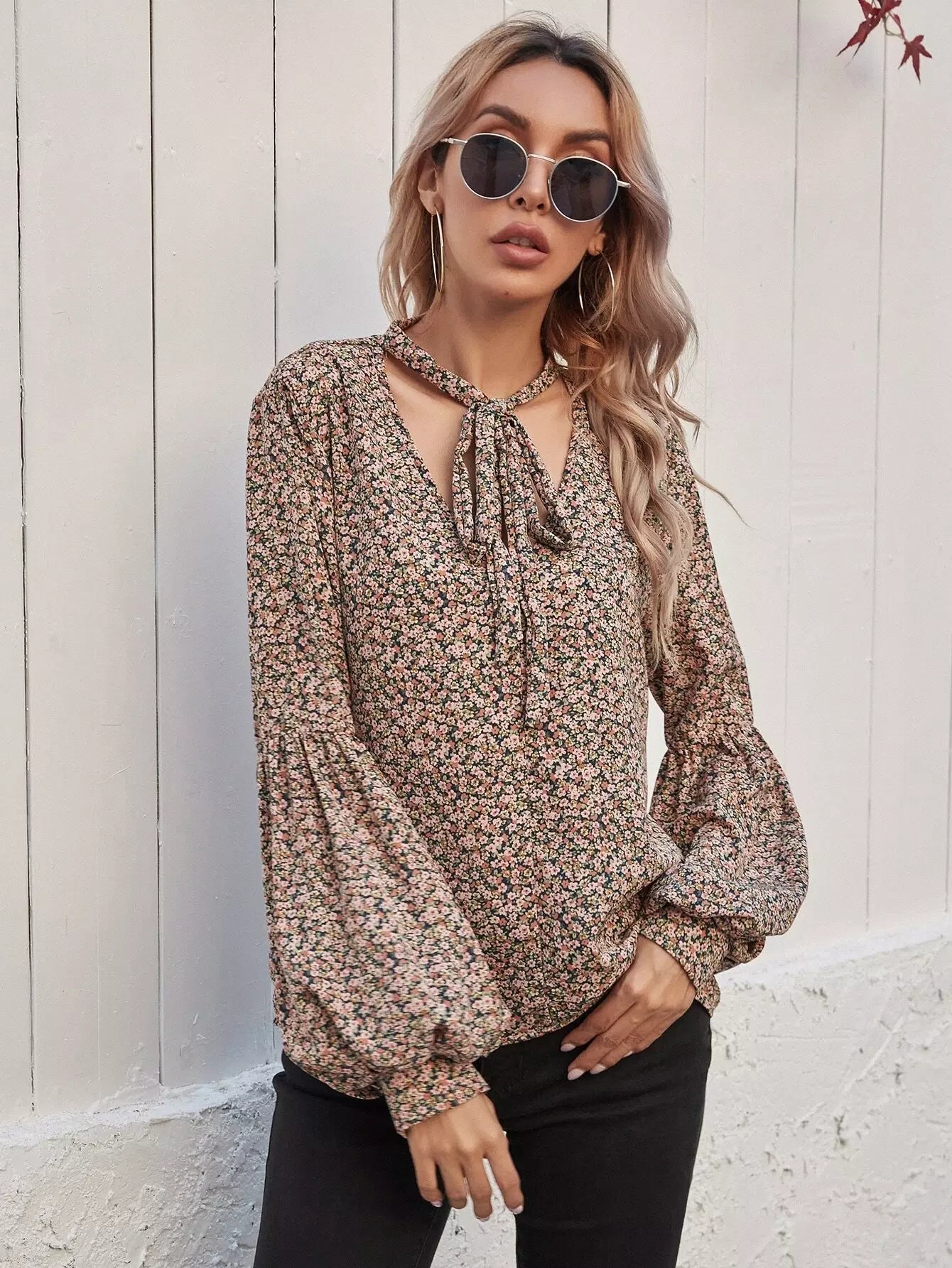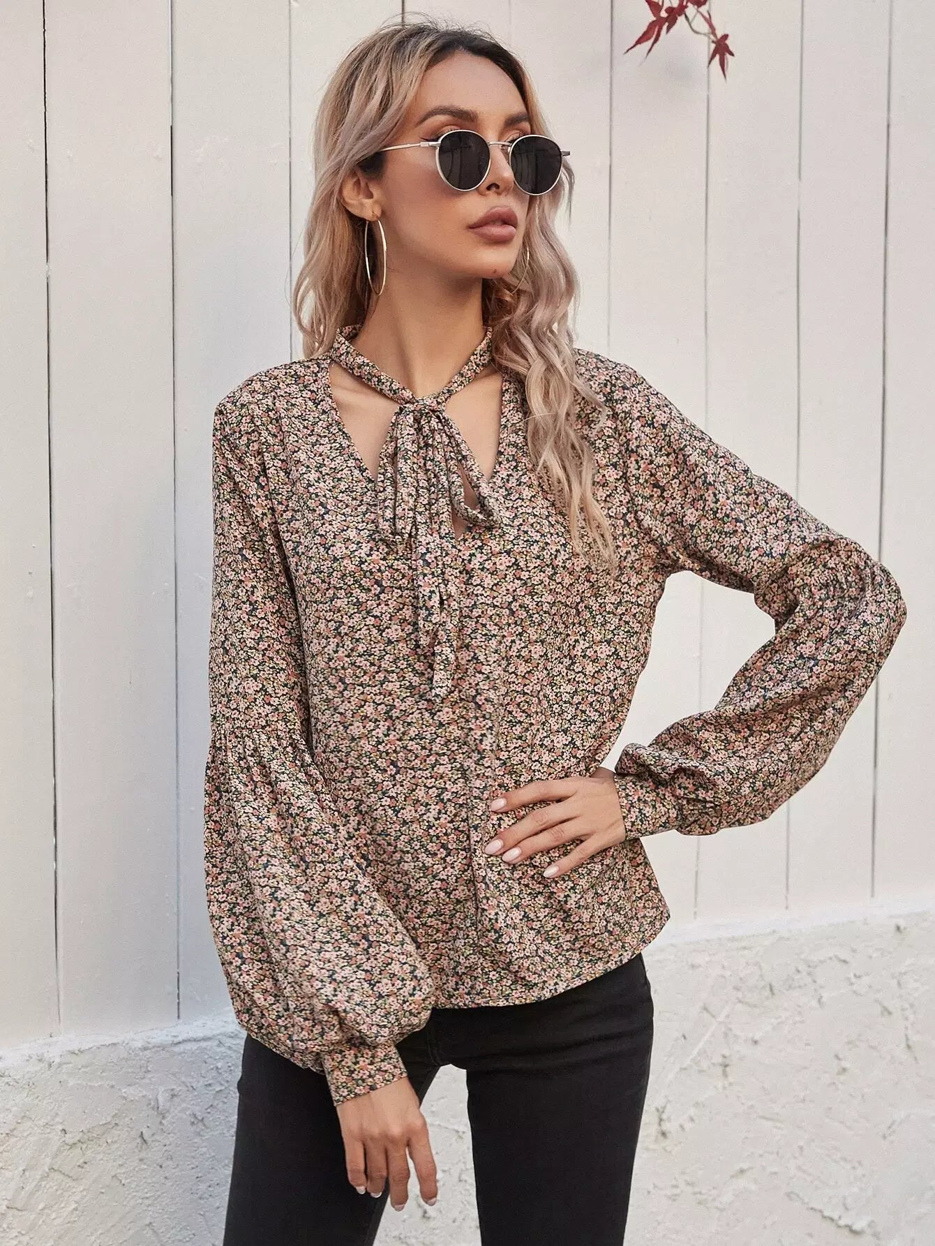 Tie Neck Ditsy Floral Bishop Sleeve Blouse