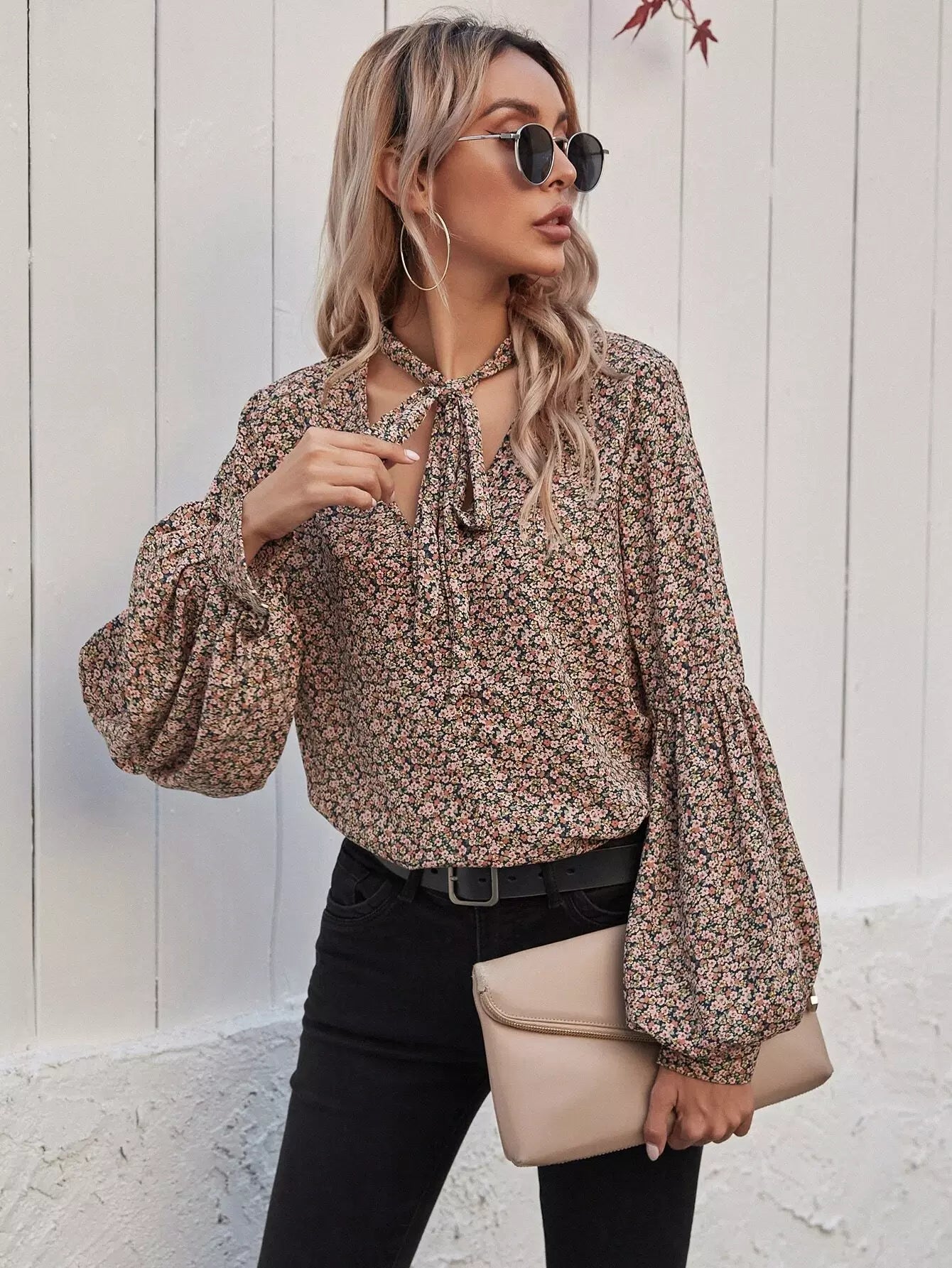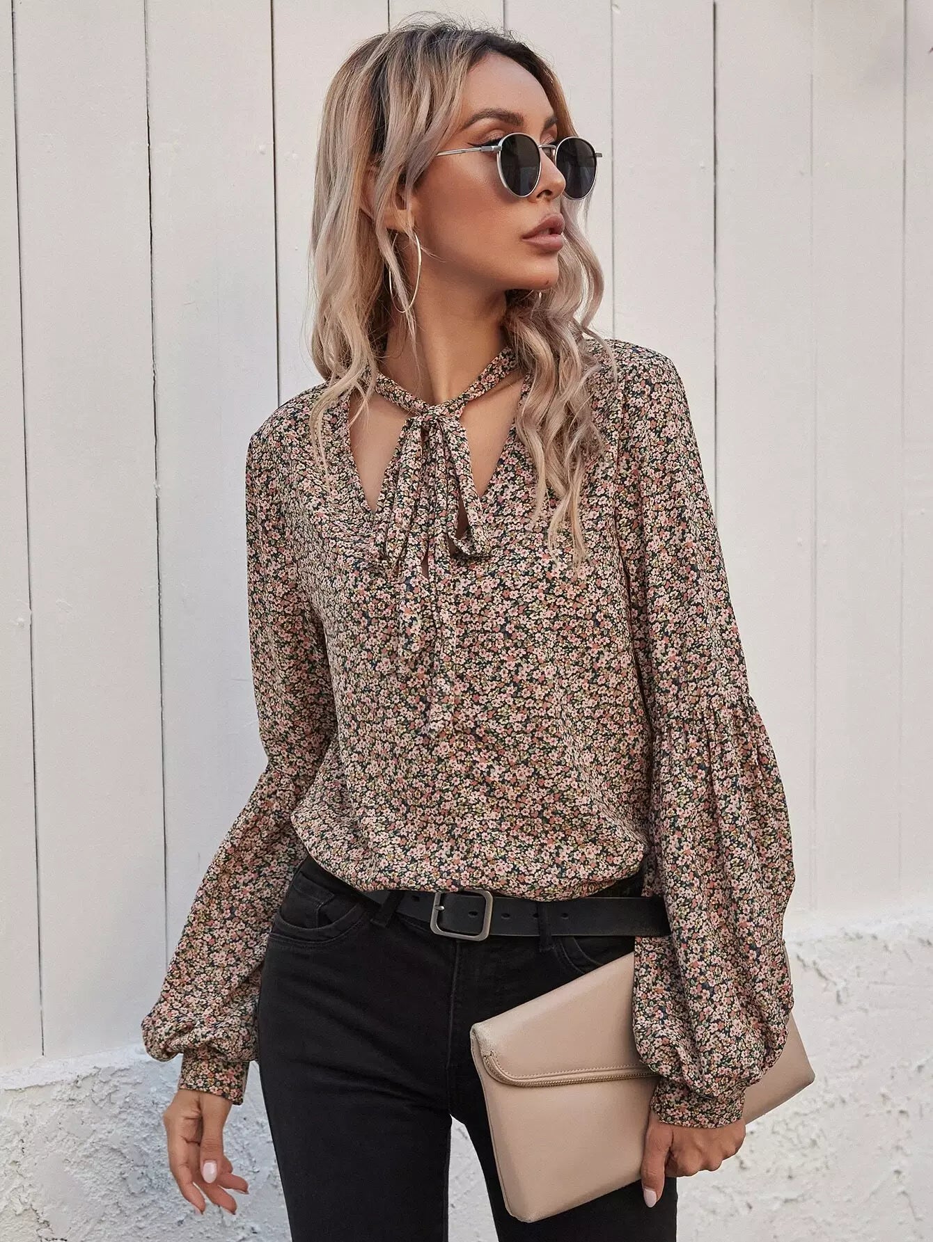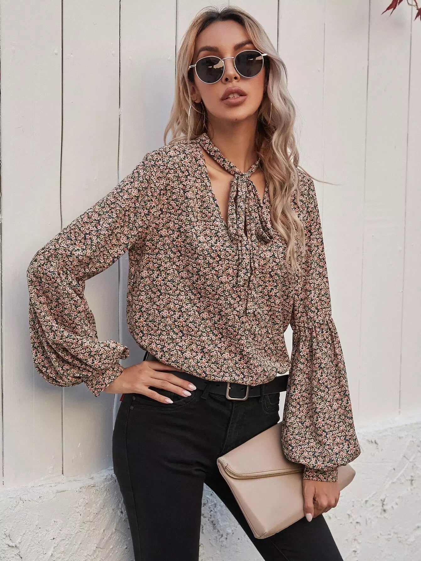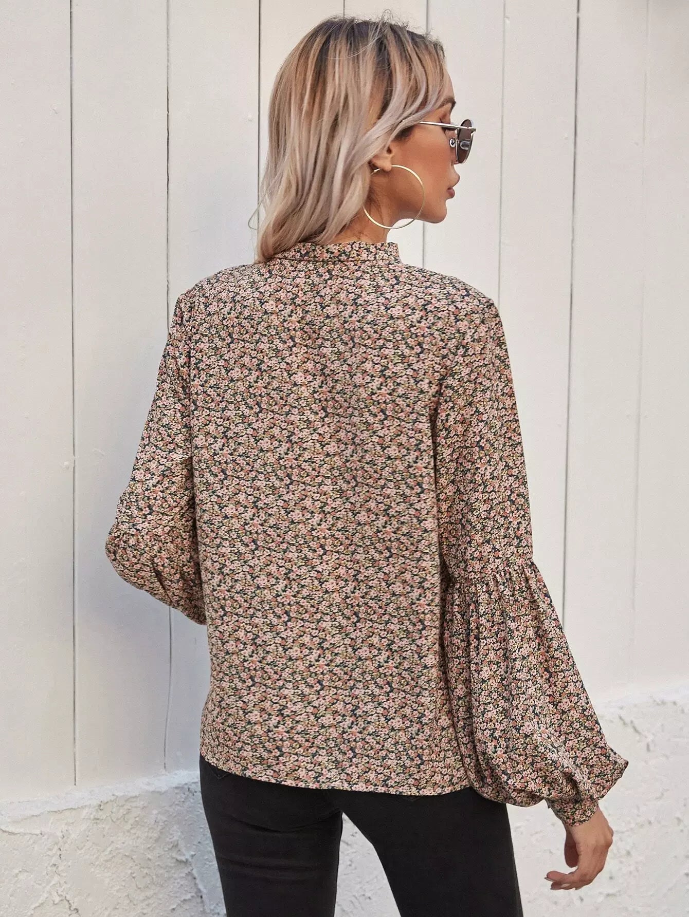 Tie Neck Ditsy Floral Bishop Sleeve Blouse