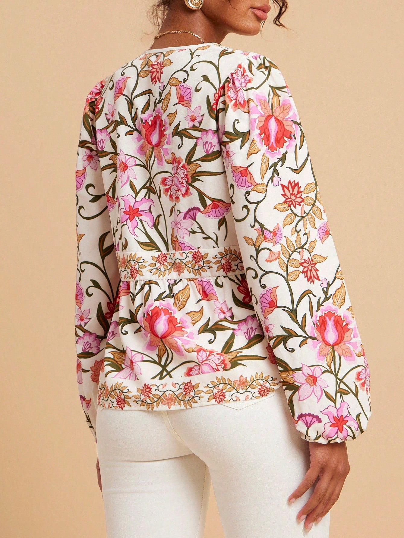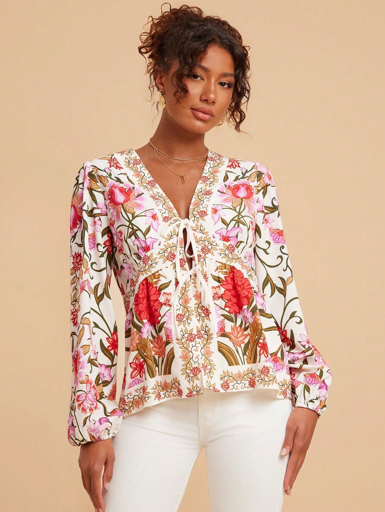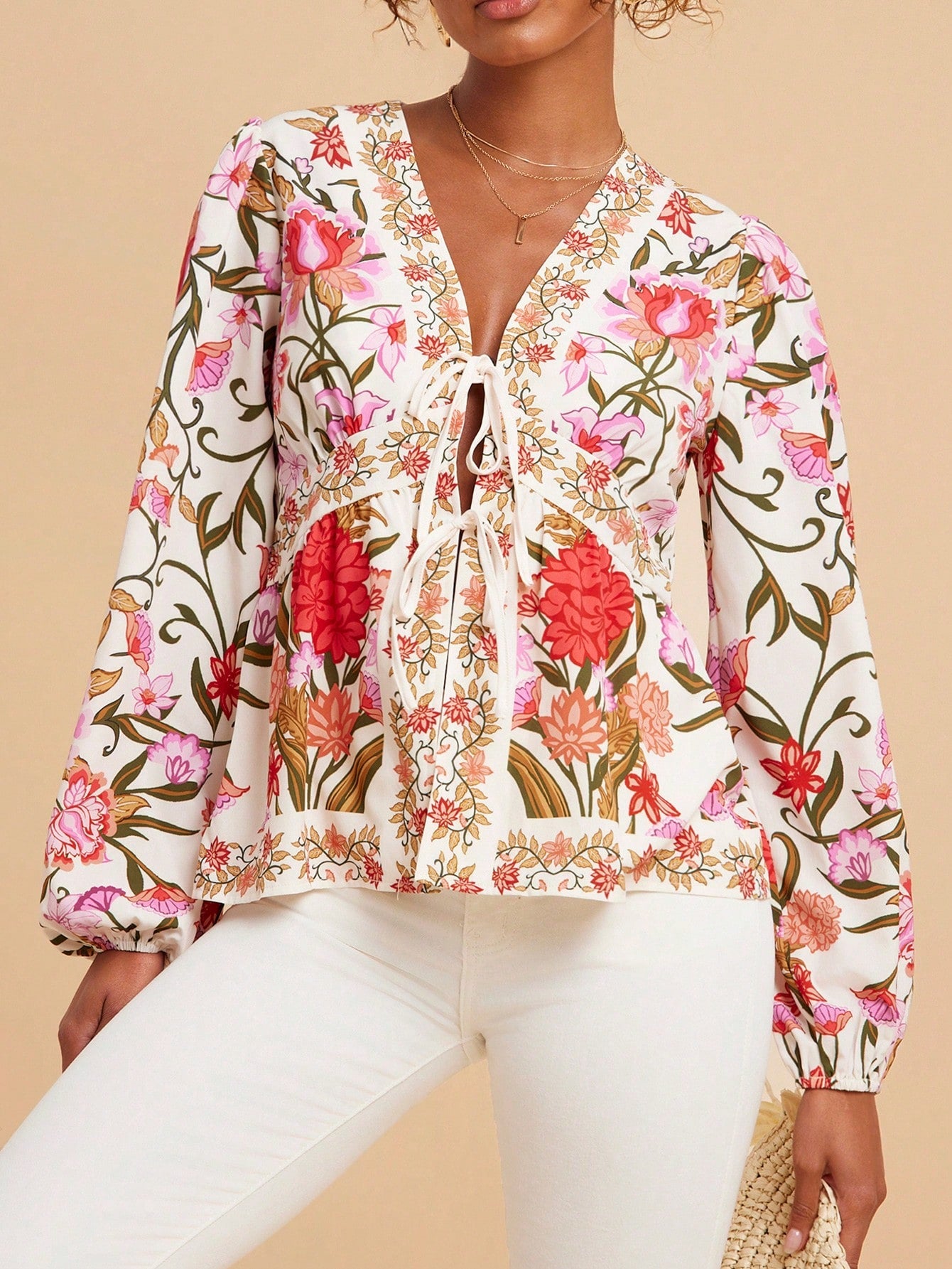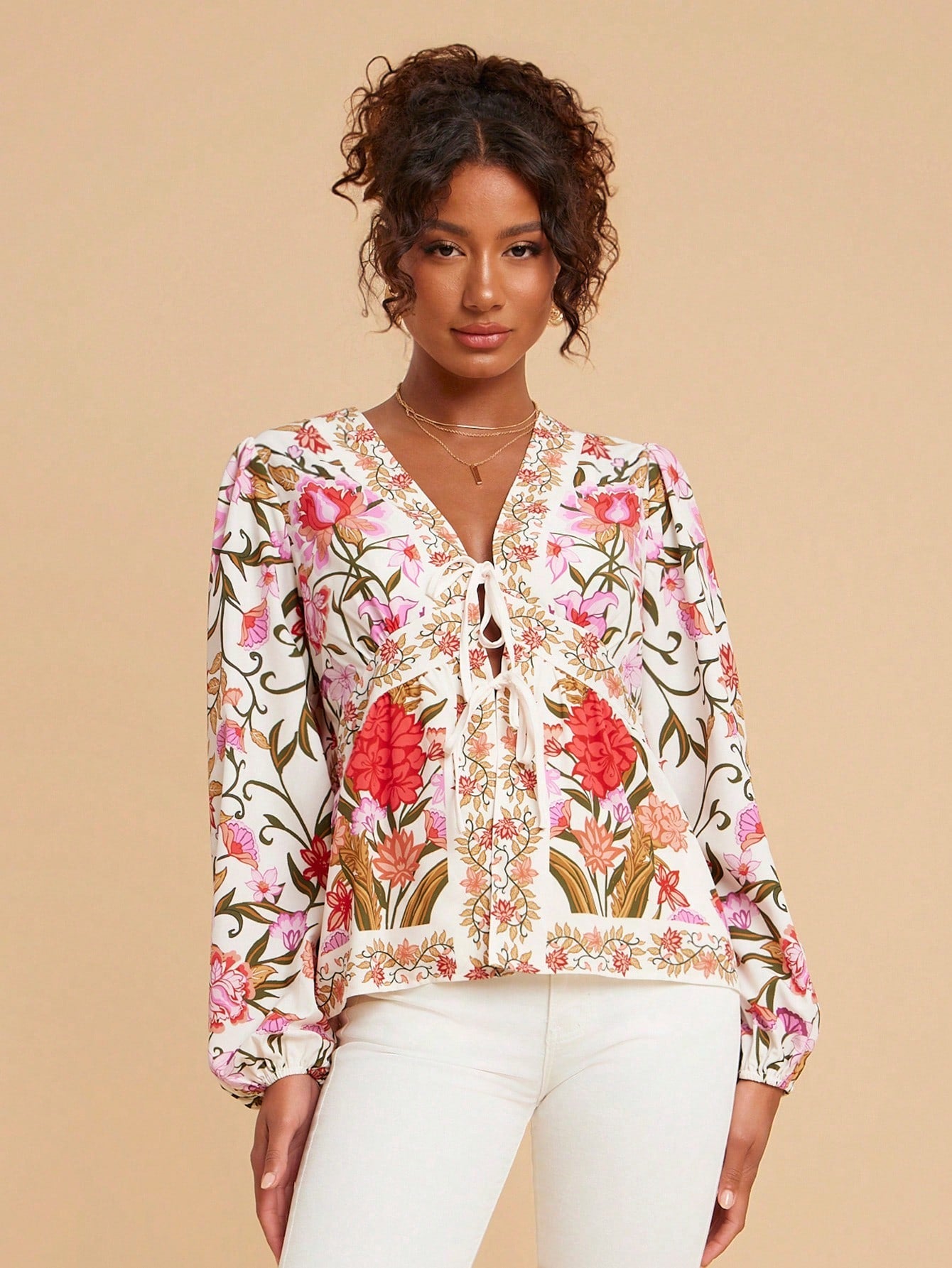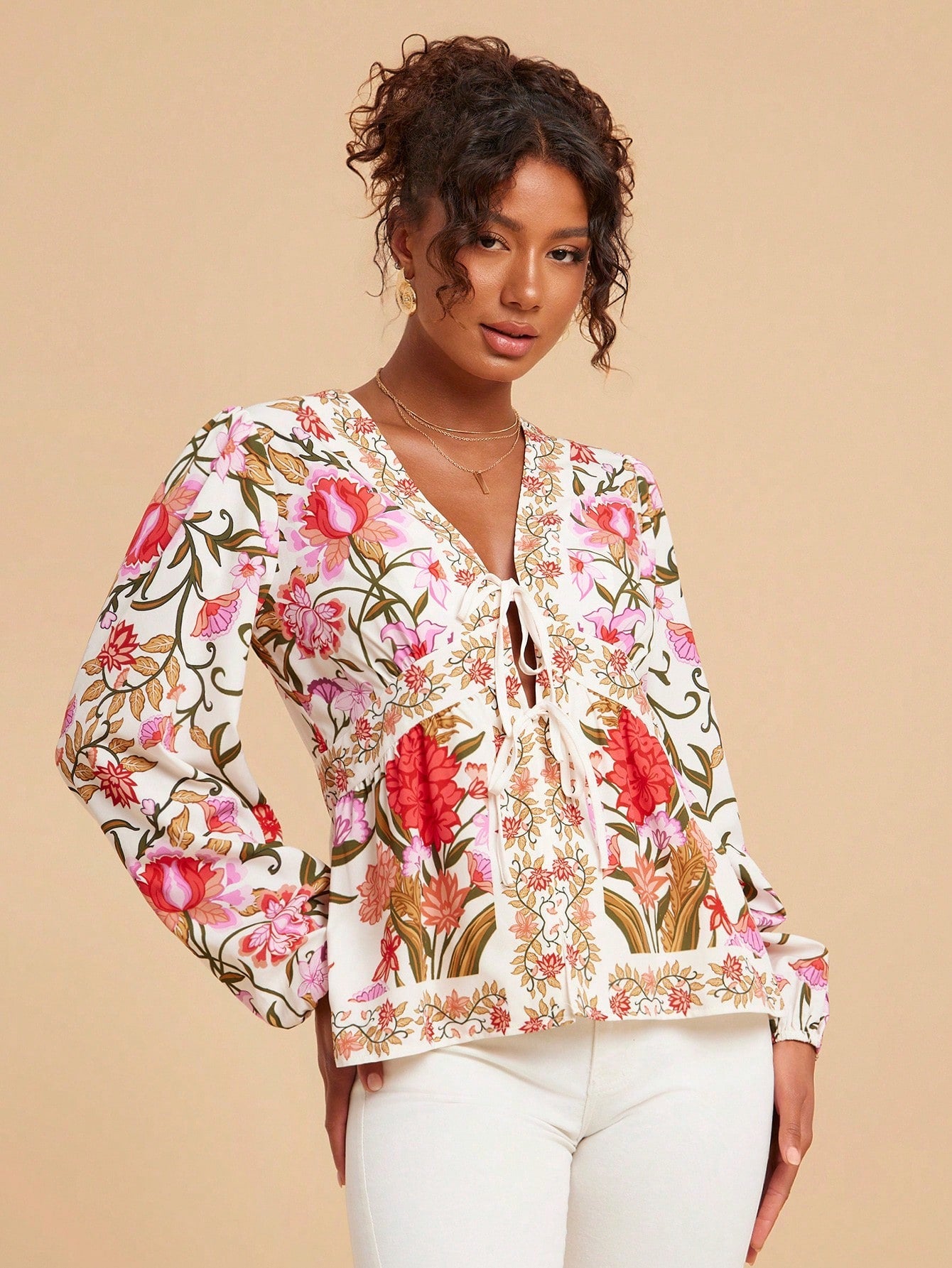 Travachic Women's Floral Print V-Neck Tie Front Casual Long Sleeve Shirt.Vacation,Vacation Style, Tie