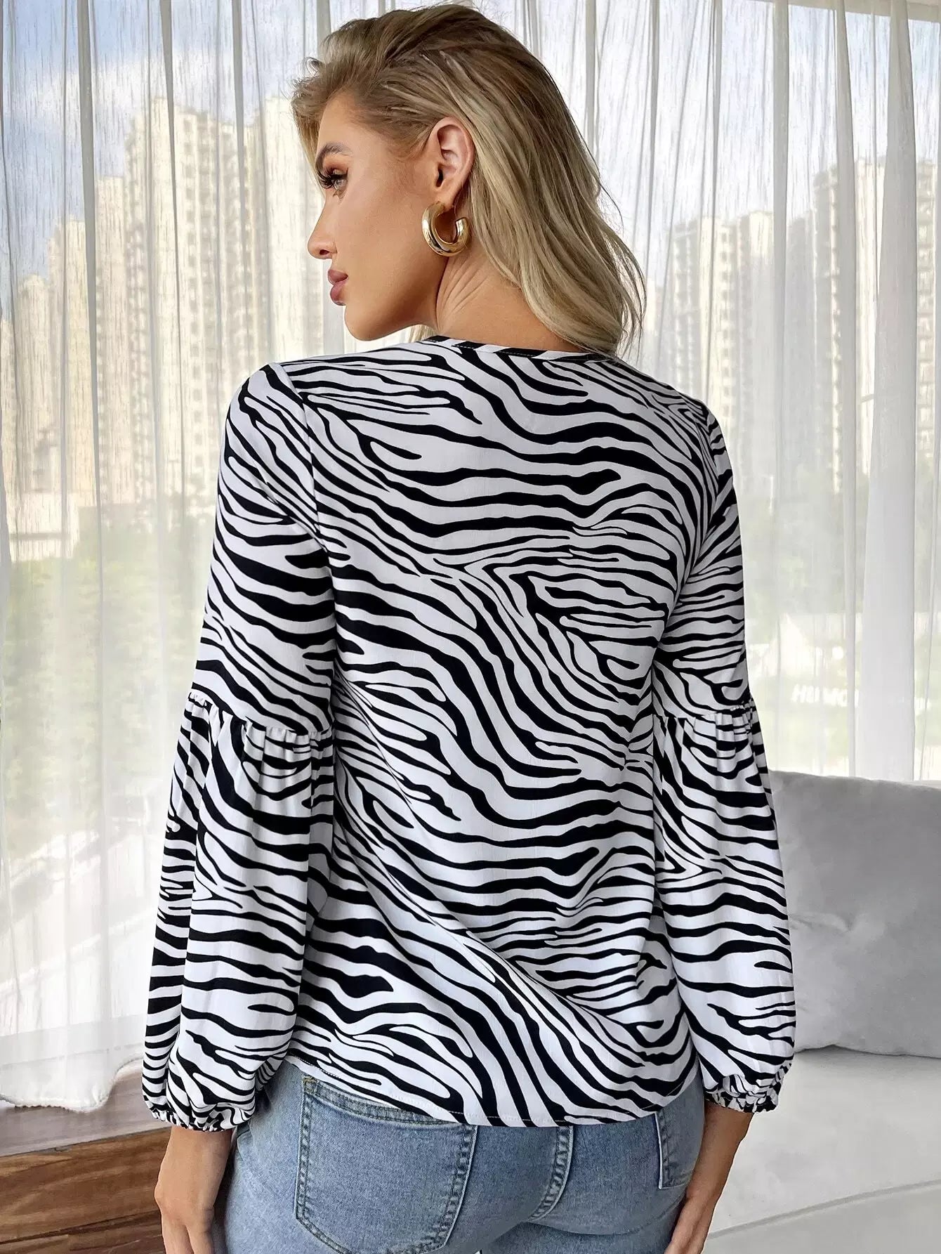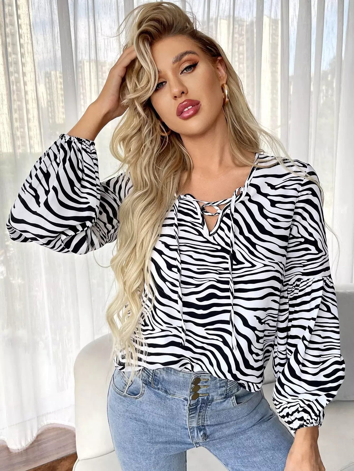 Zebra Striped Tie Neck Blouse