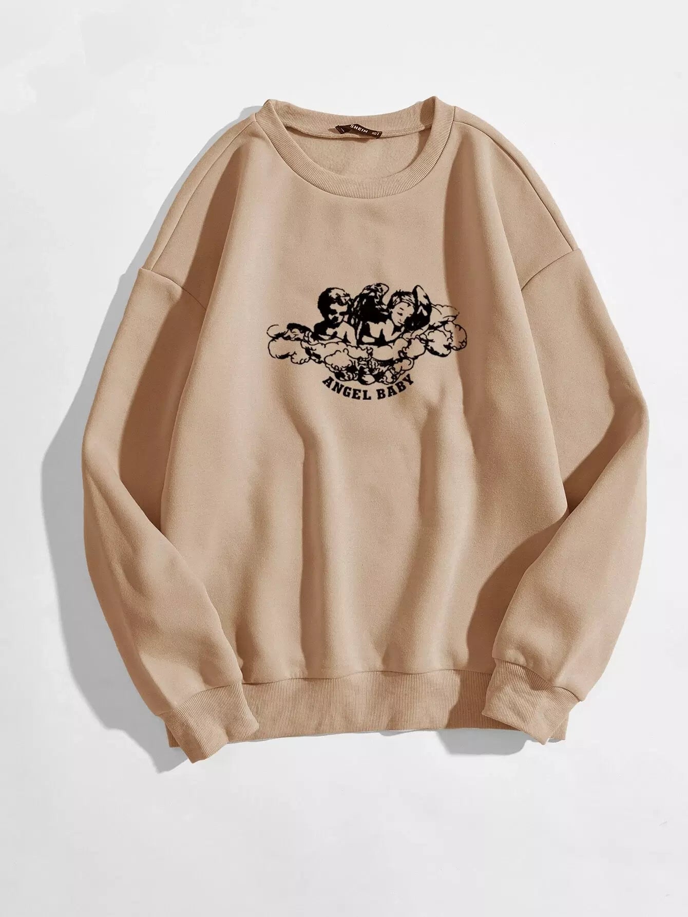 Angel & Letter Graphic Oversized Thermal Sweatshirt