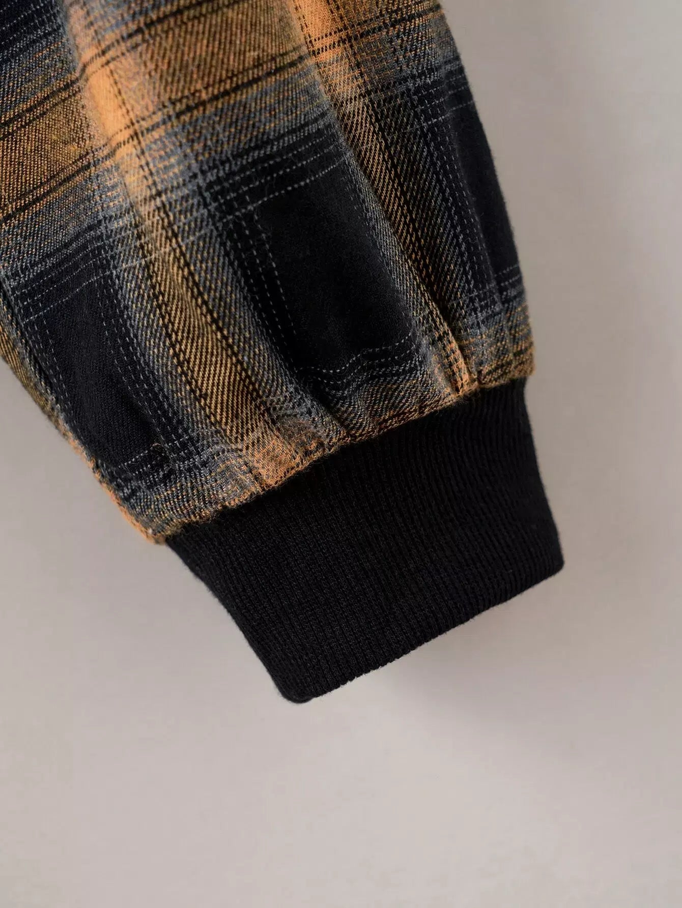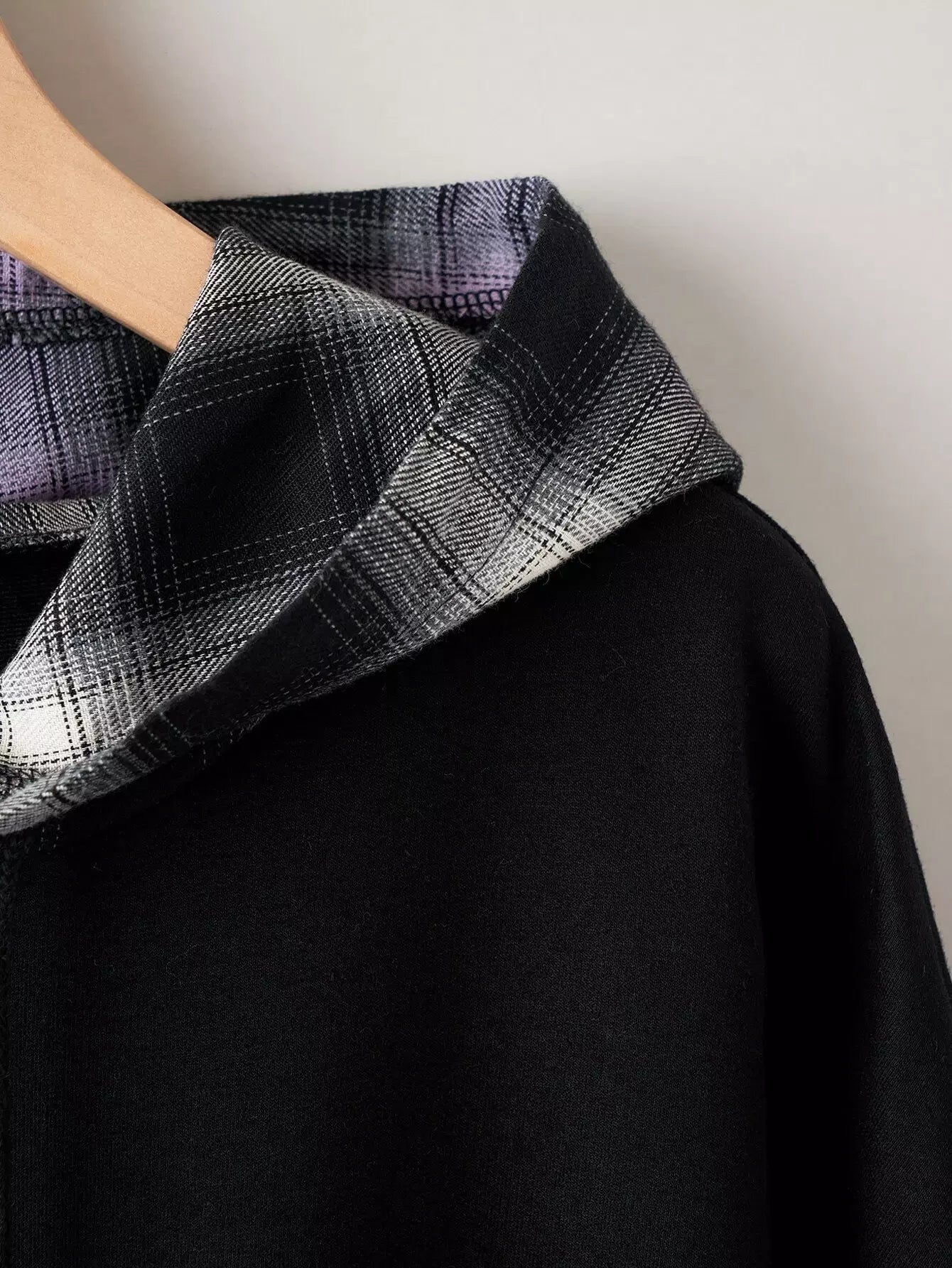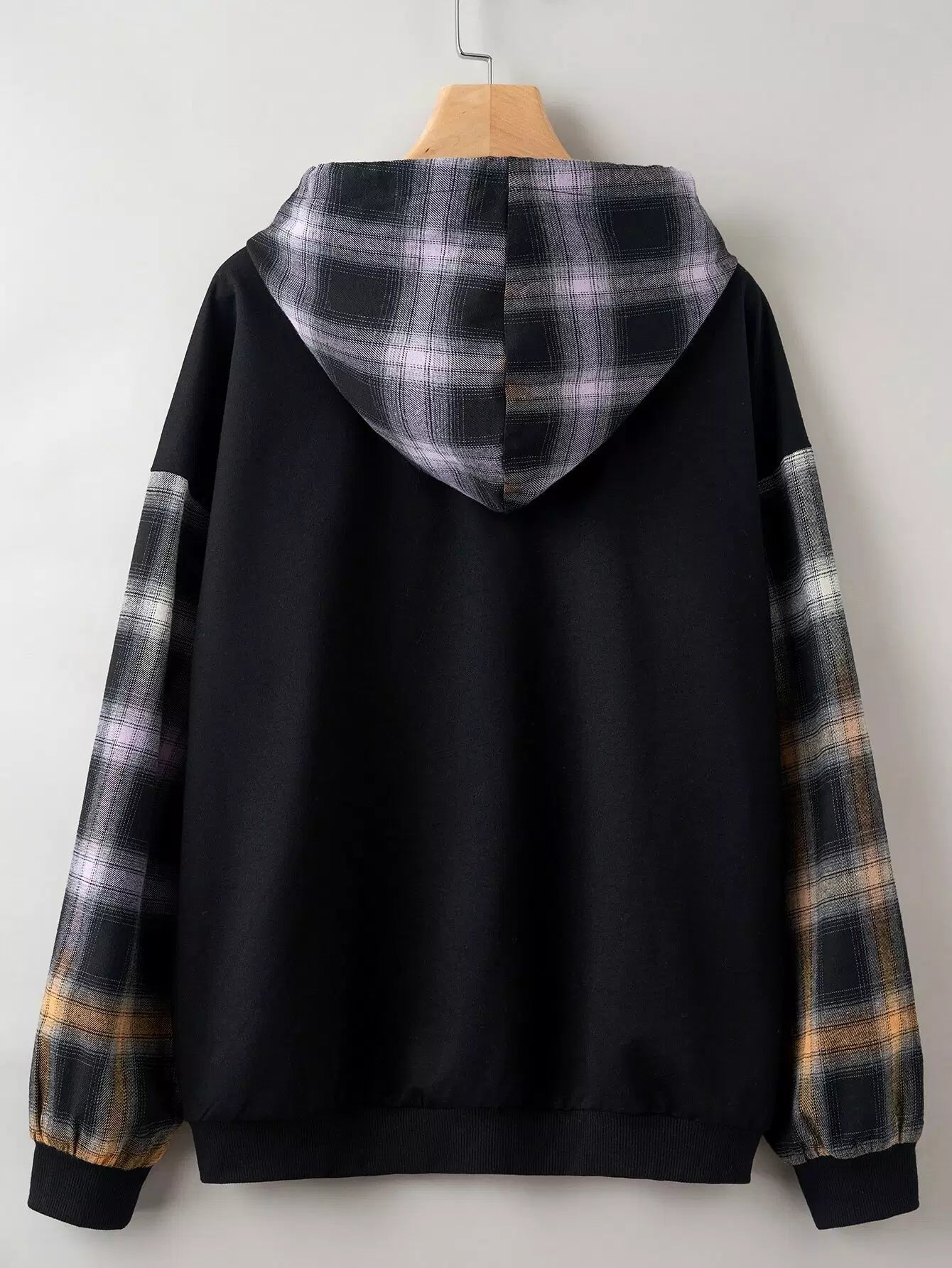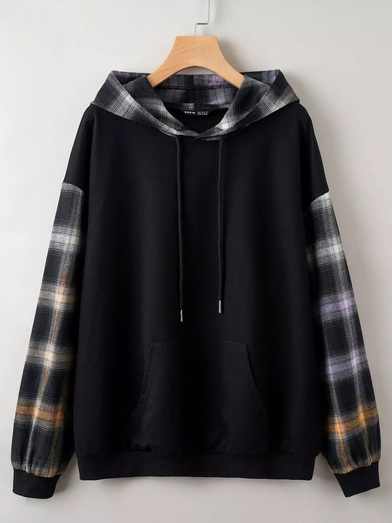 Contrast Plaid Kangaroo Pocket Drawstring Hoodie