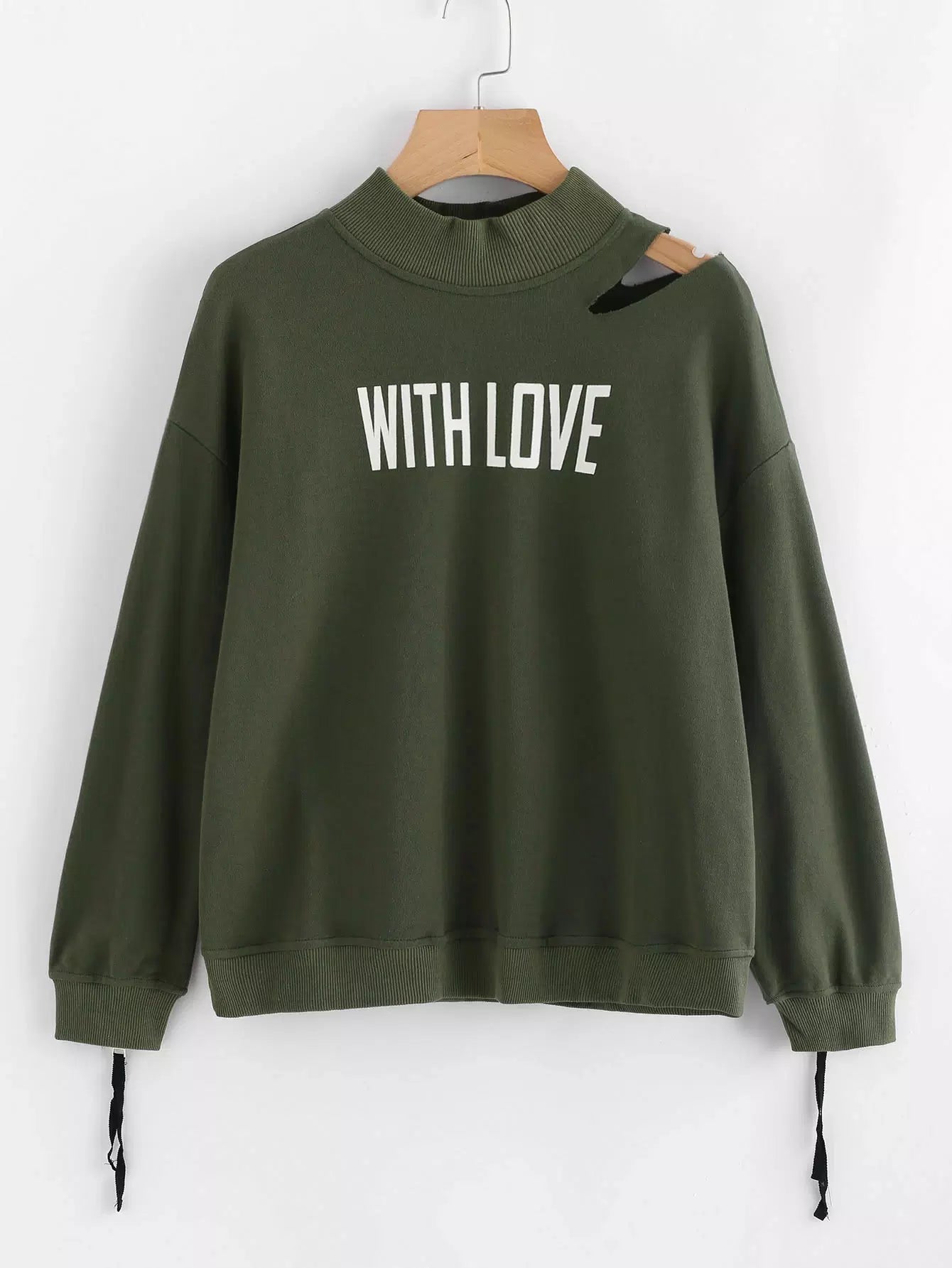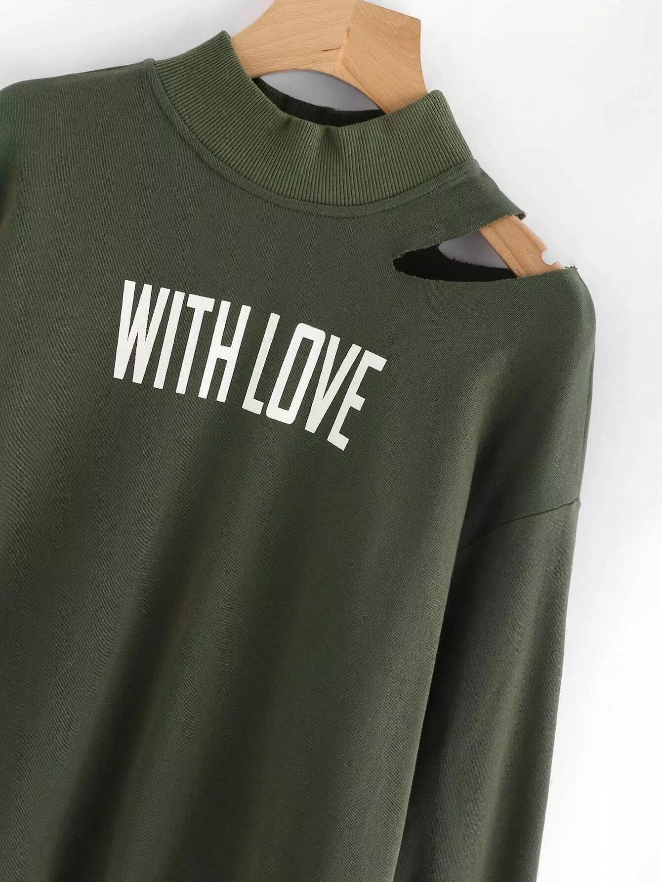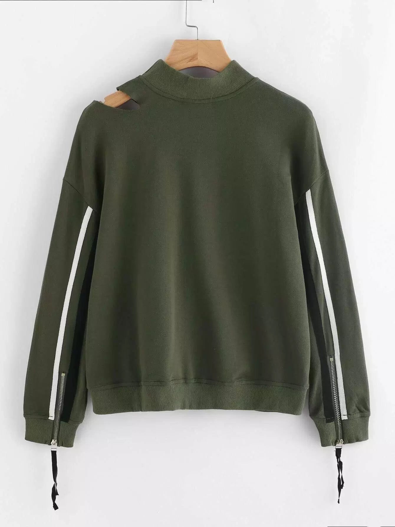 Cutout Shoulder Zip Cuff Graphic Sweatshirt