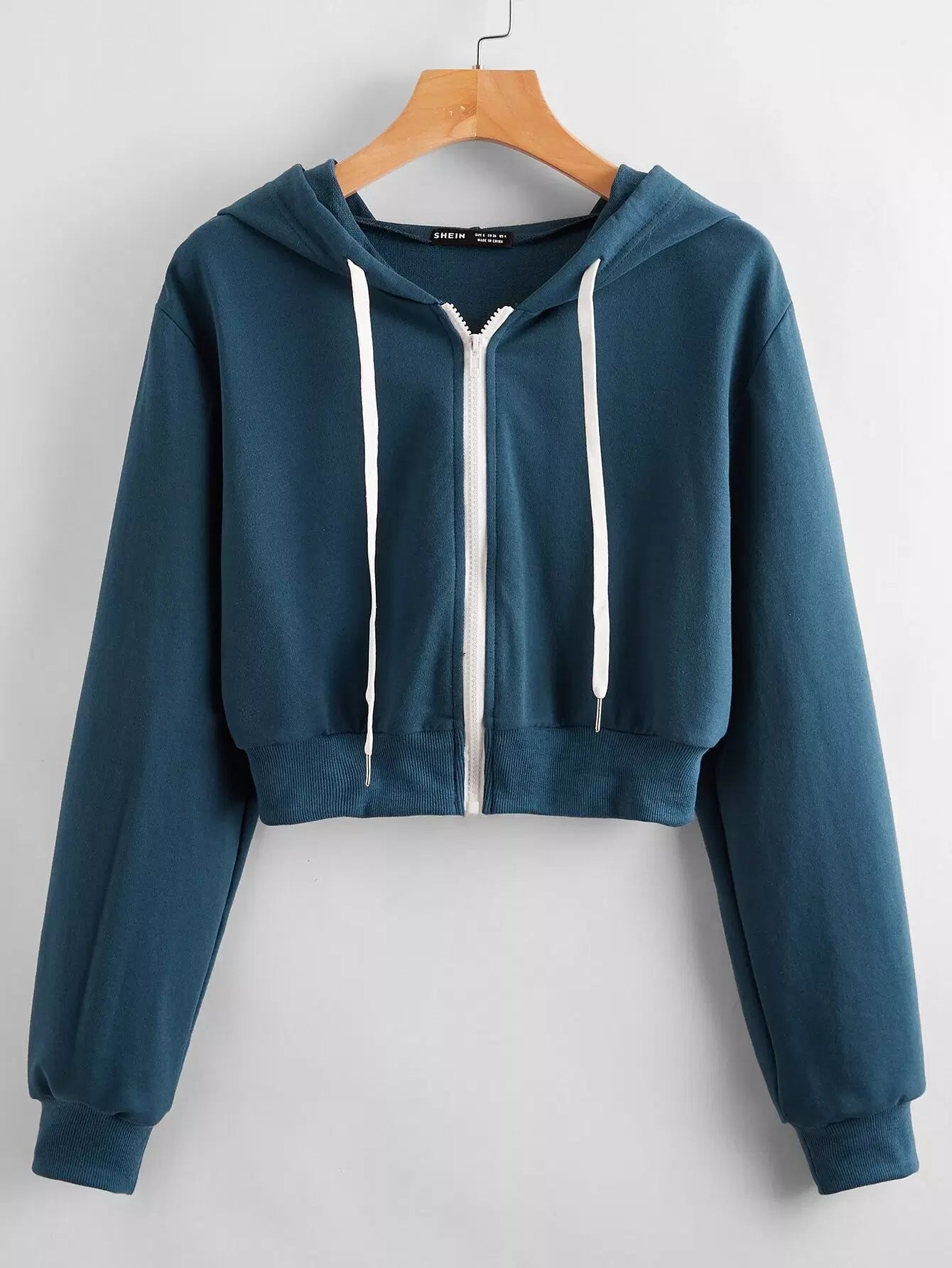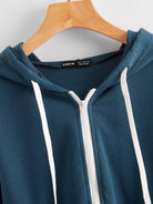 Drop Shoulder Zip Up Drawstring Crop Hoodie