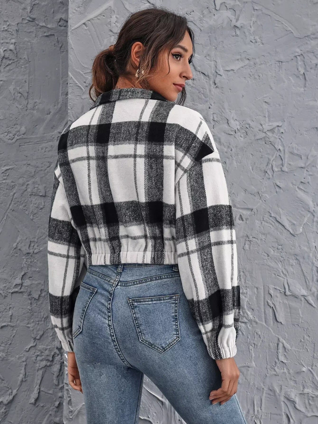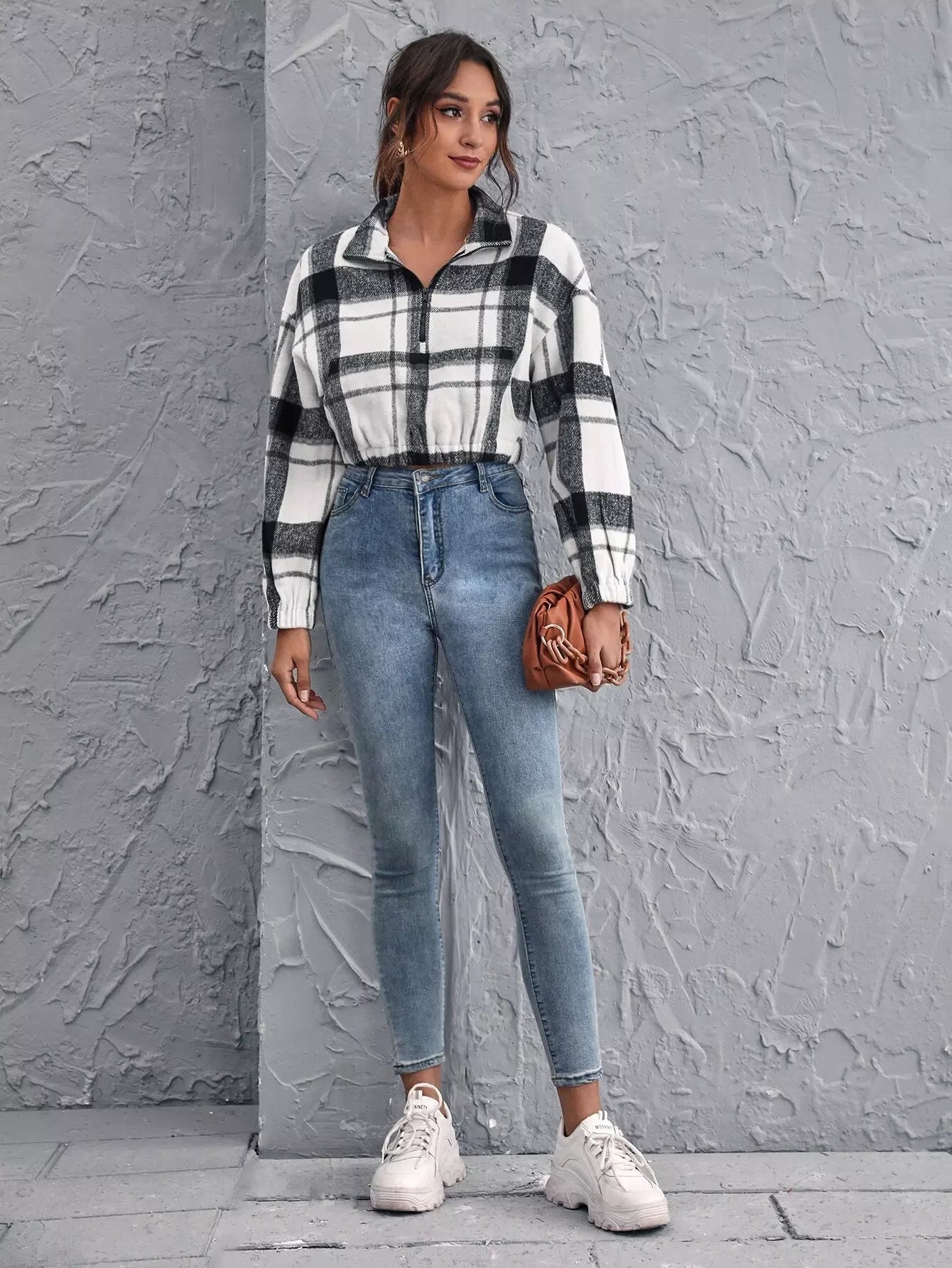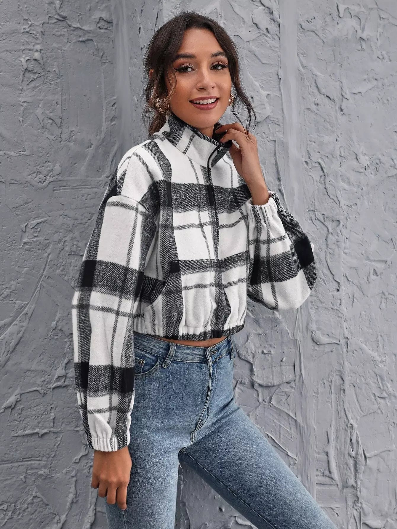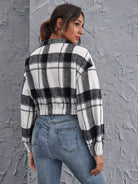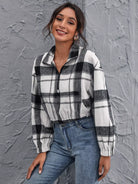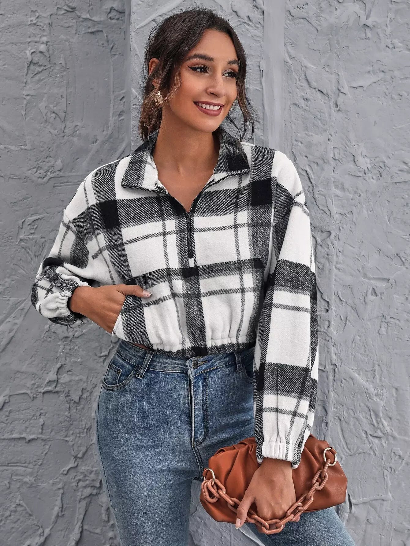 Drop Shoulder Zipper Half Placket Plaid Pullover