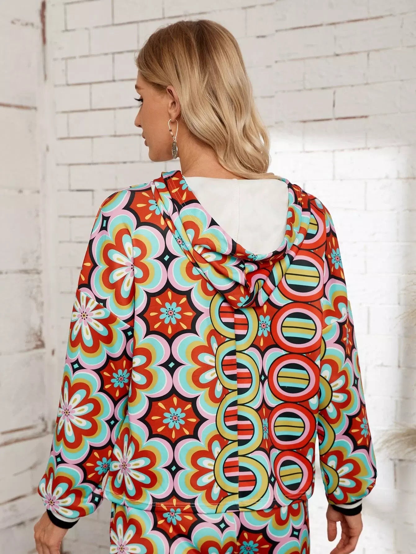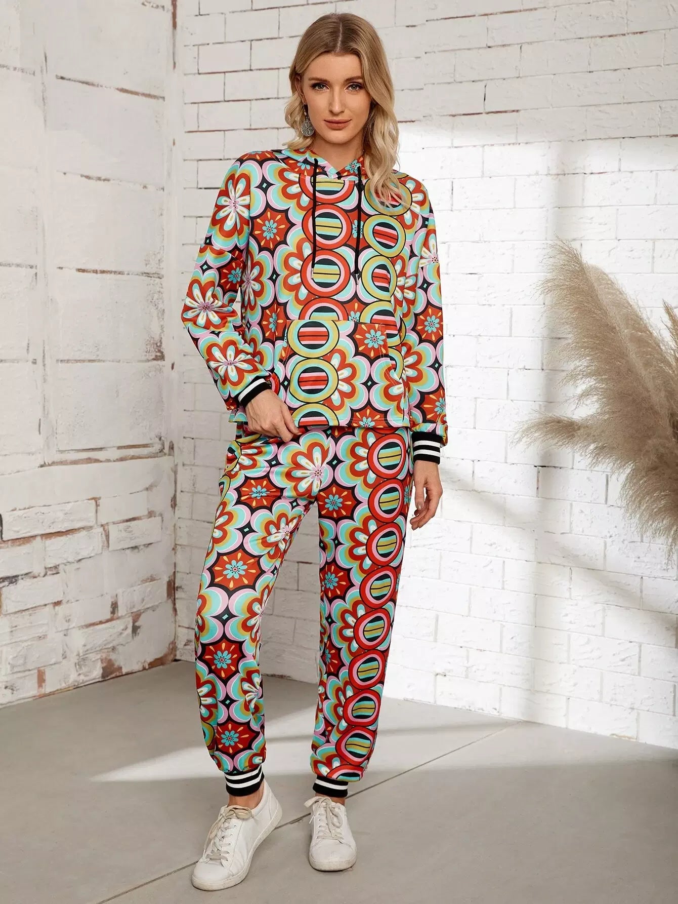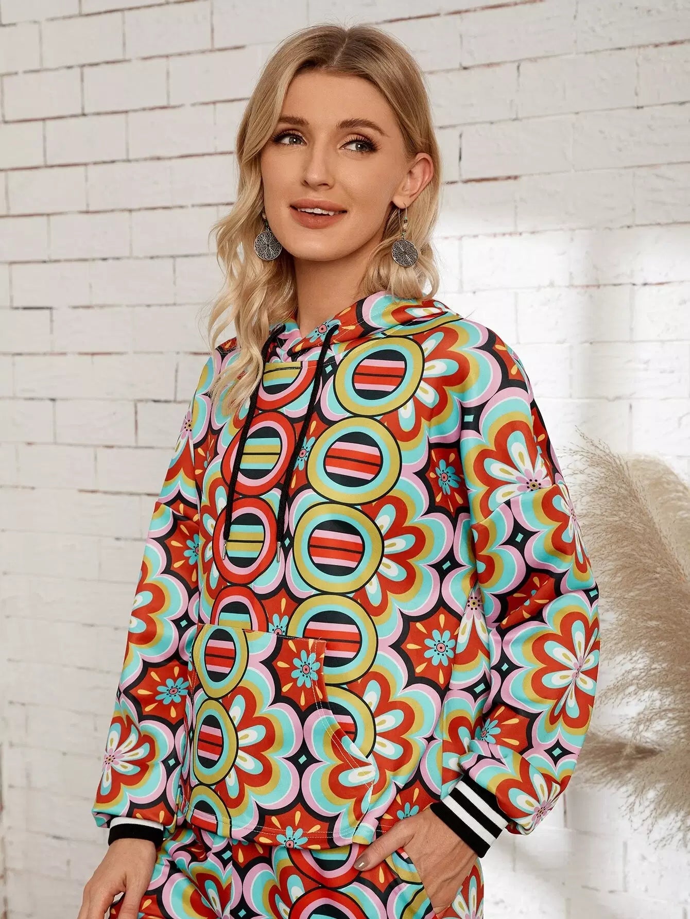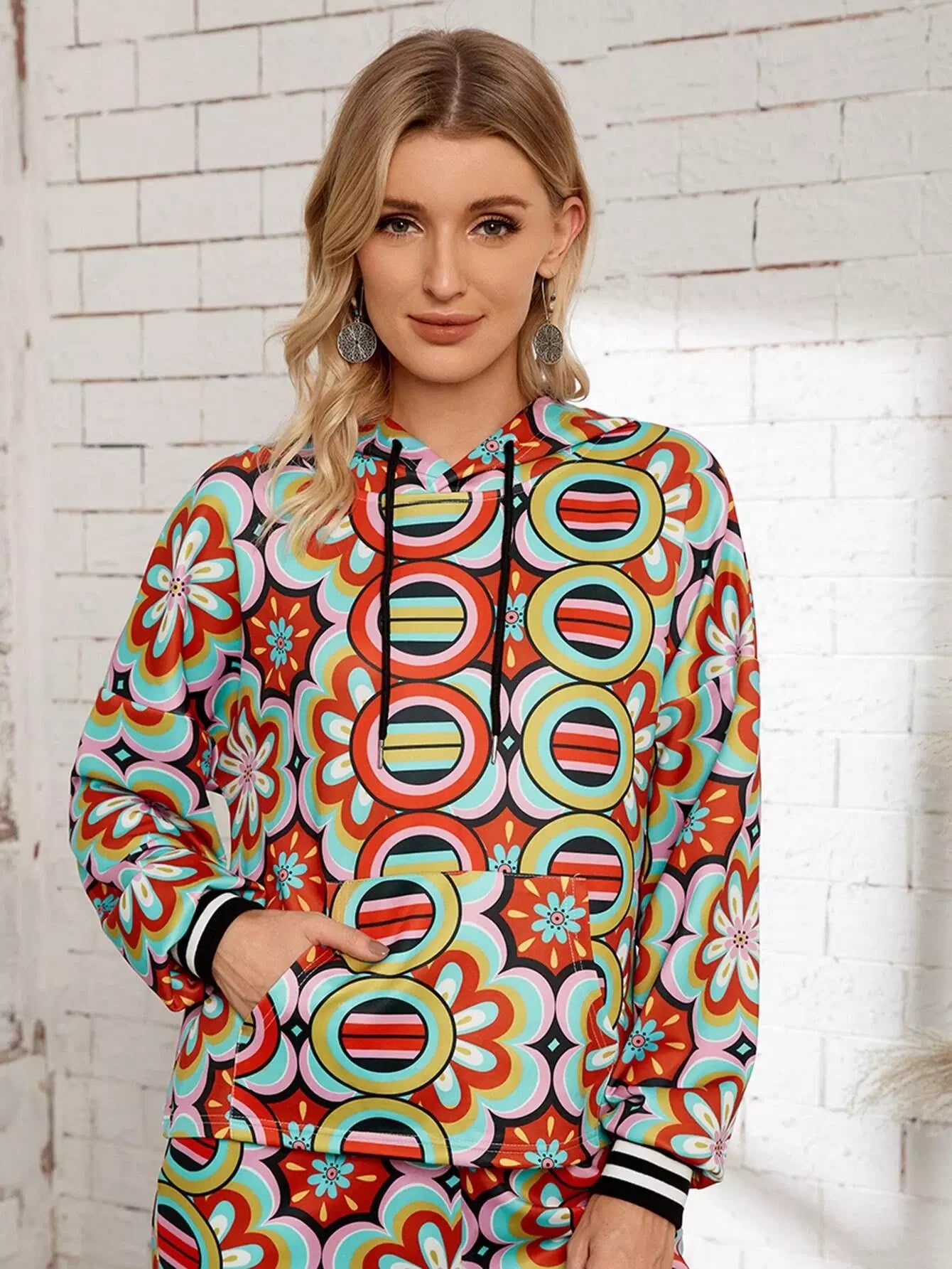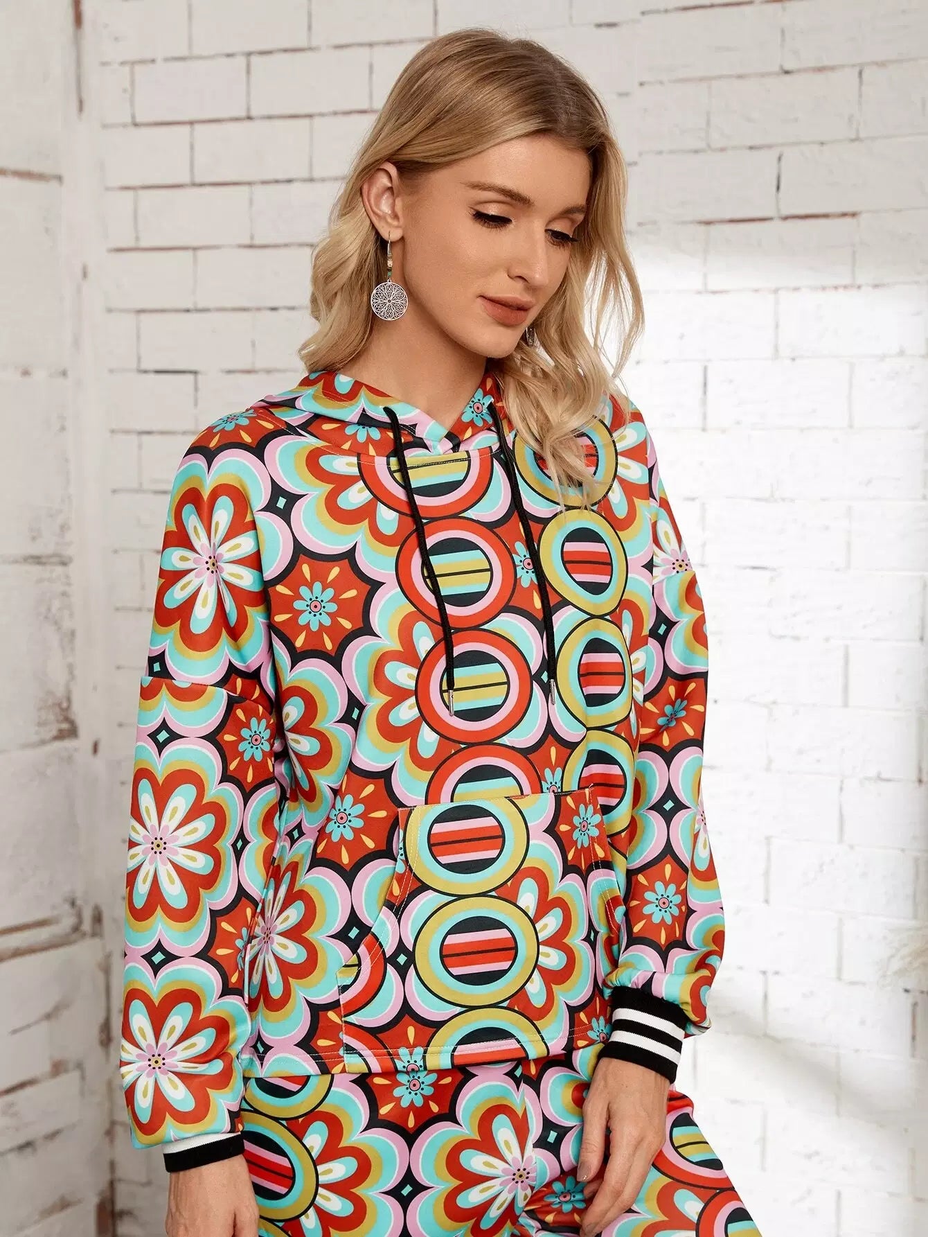 Floral Print Kangaroo Pocket Drop Shoulder Drawstring Hoodie