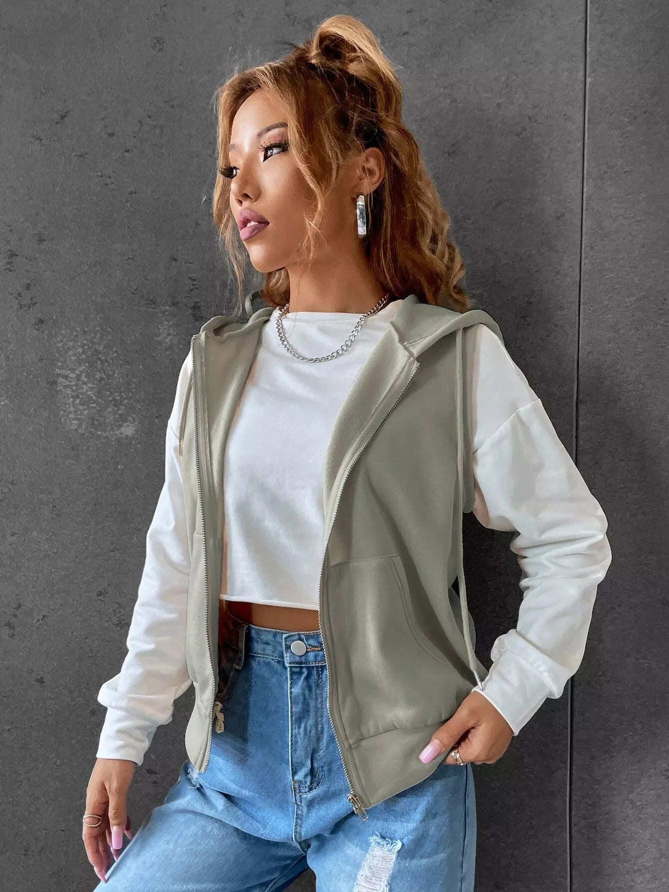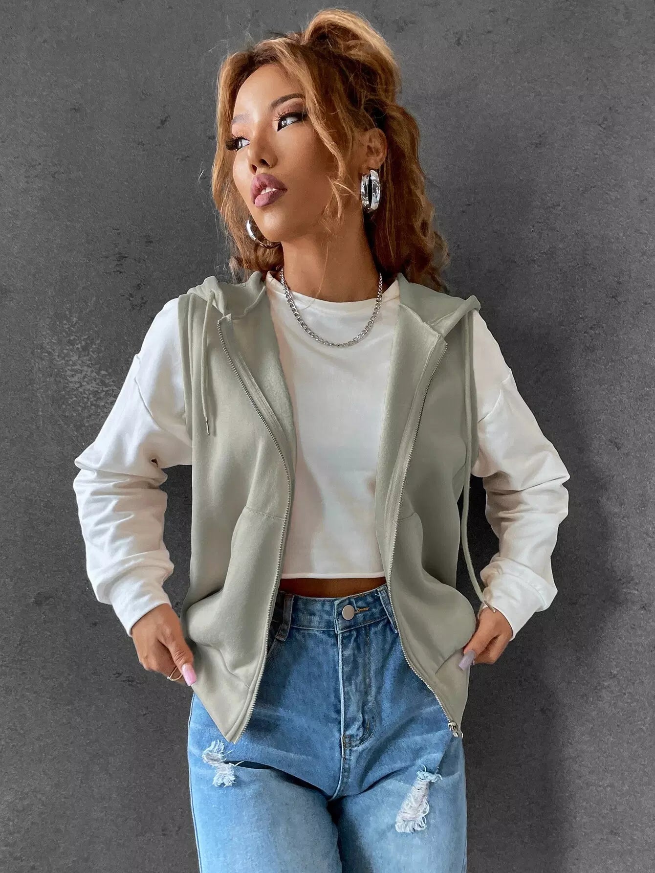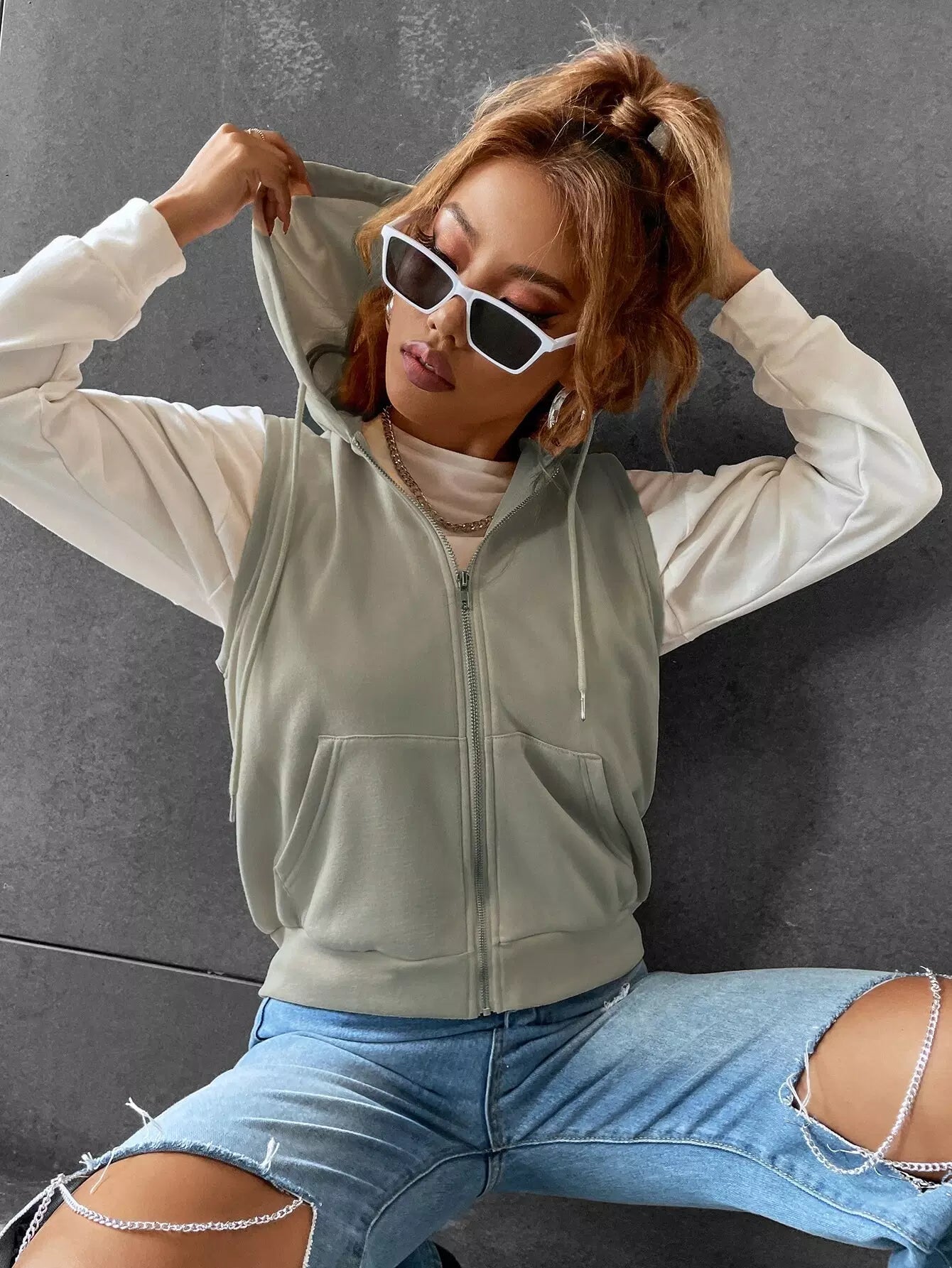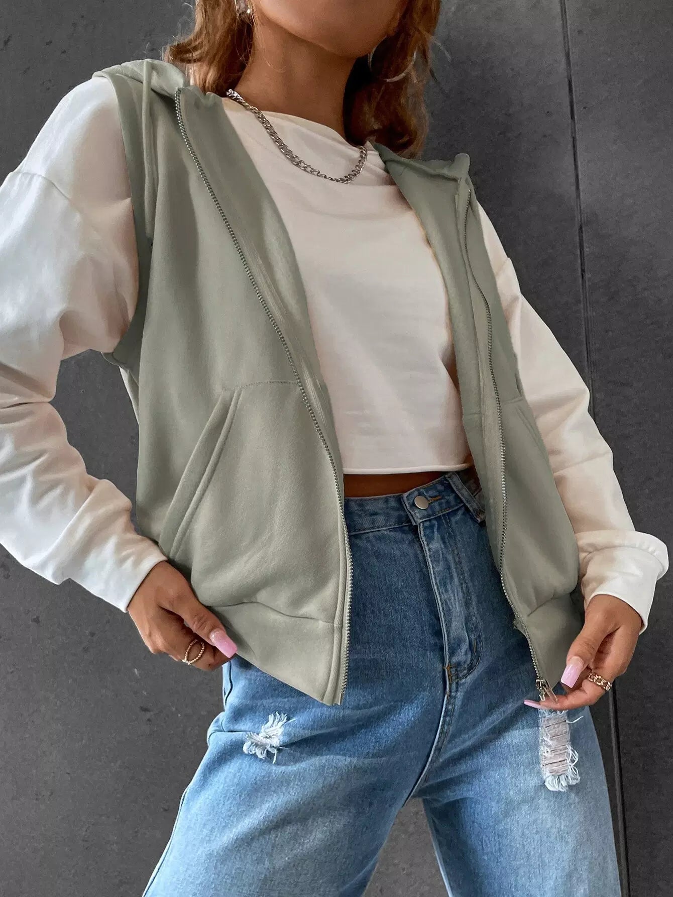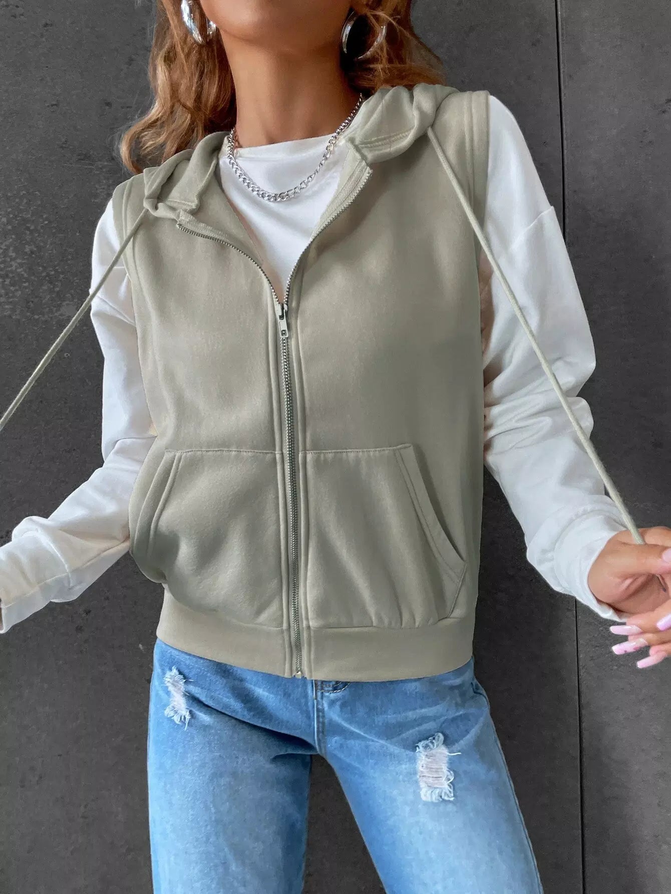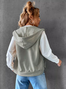 Kangaroo Pocket Drawstring Zipper Thermal Vest Hoodie
