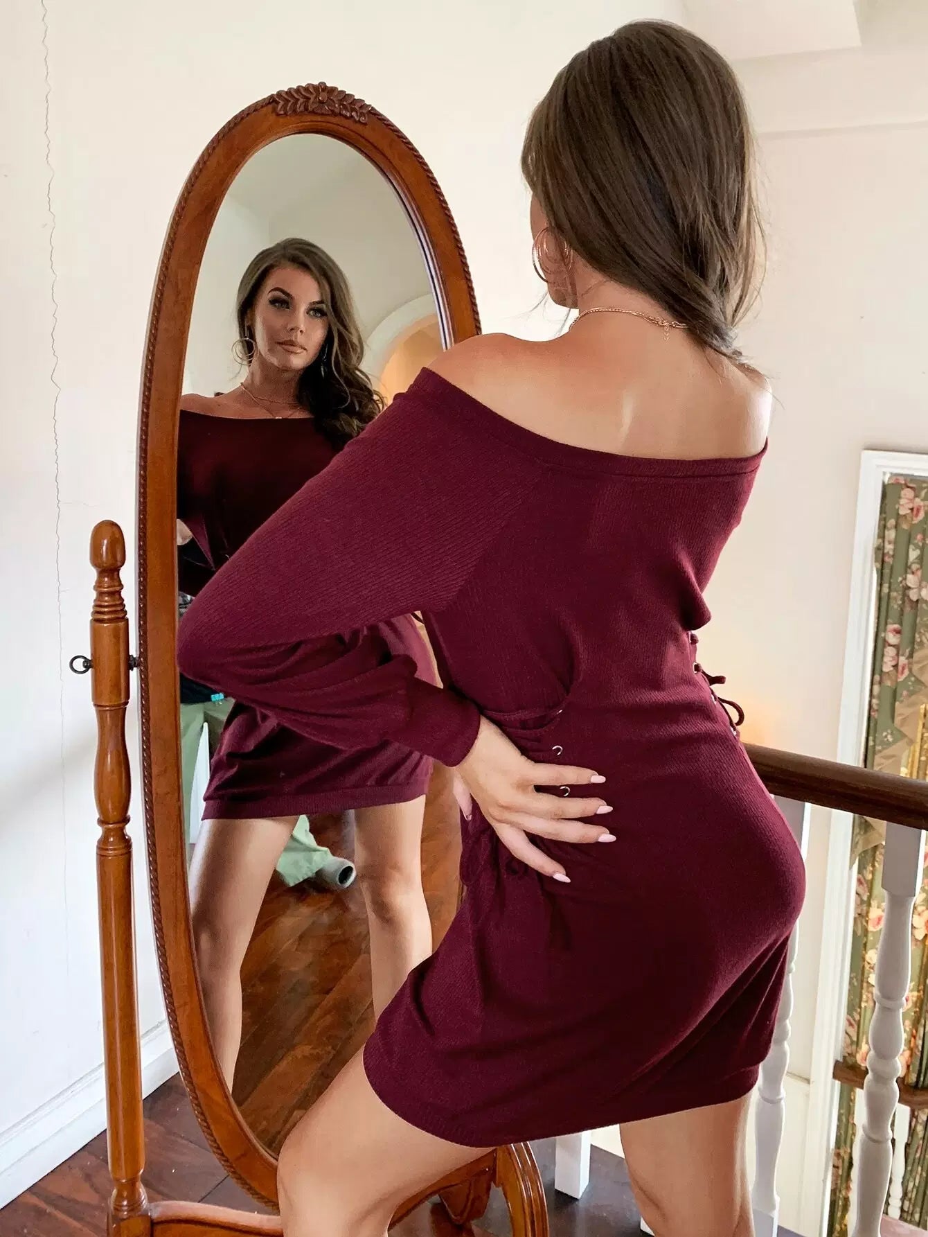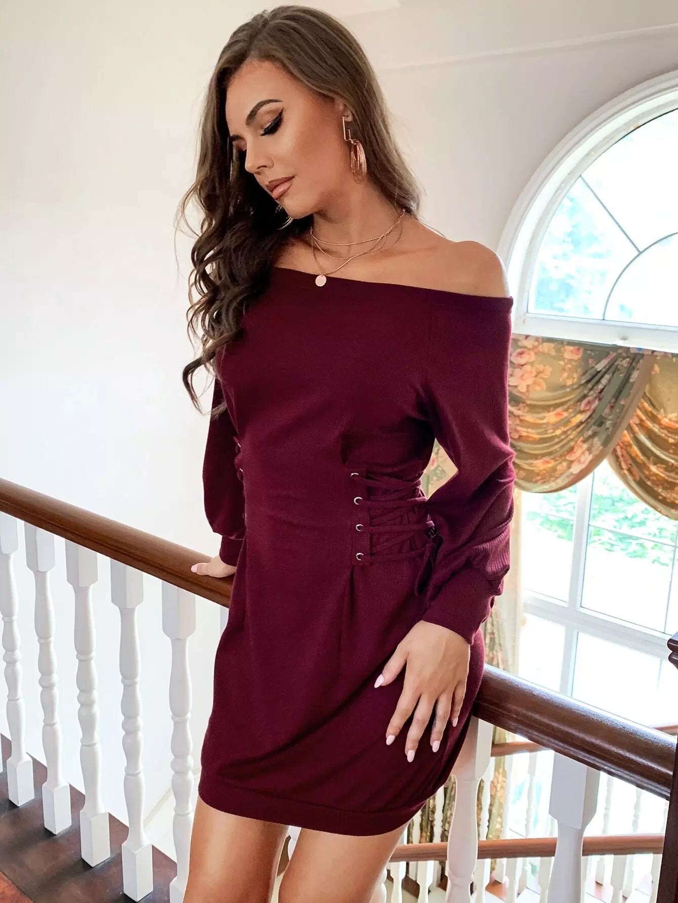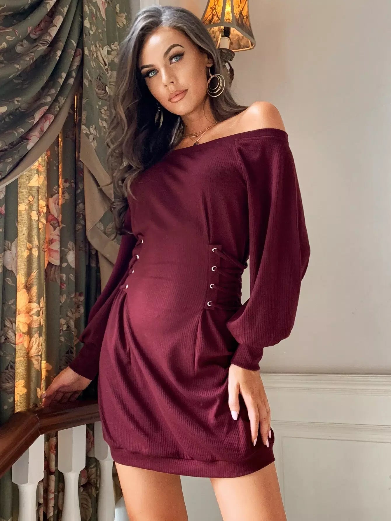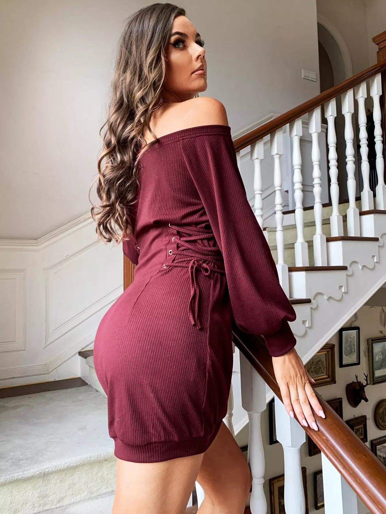 Women - Lantern Sleeve Corset Lace Up Knot Rib-knit Sweatshirt Dress