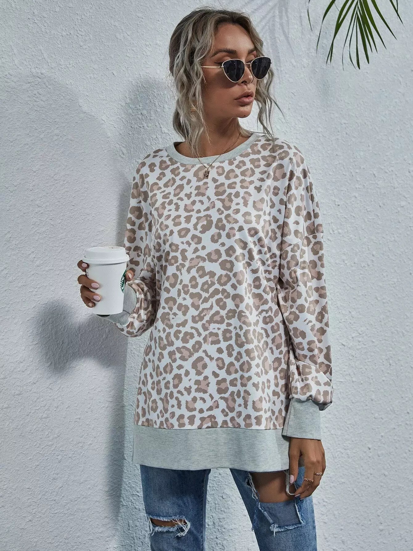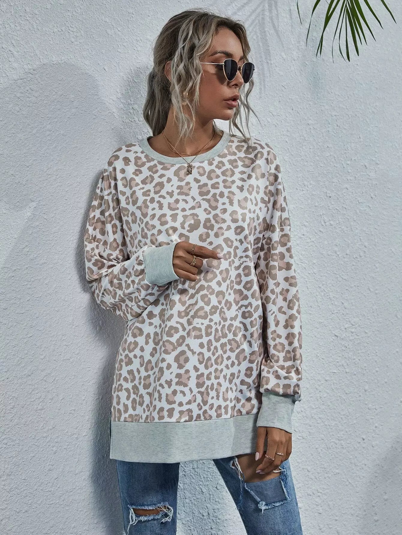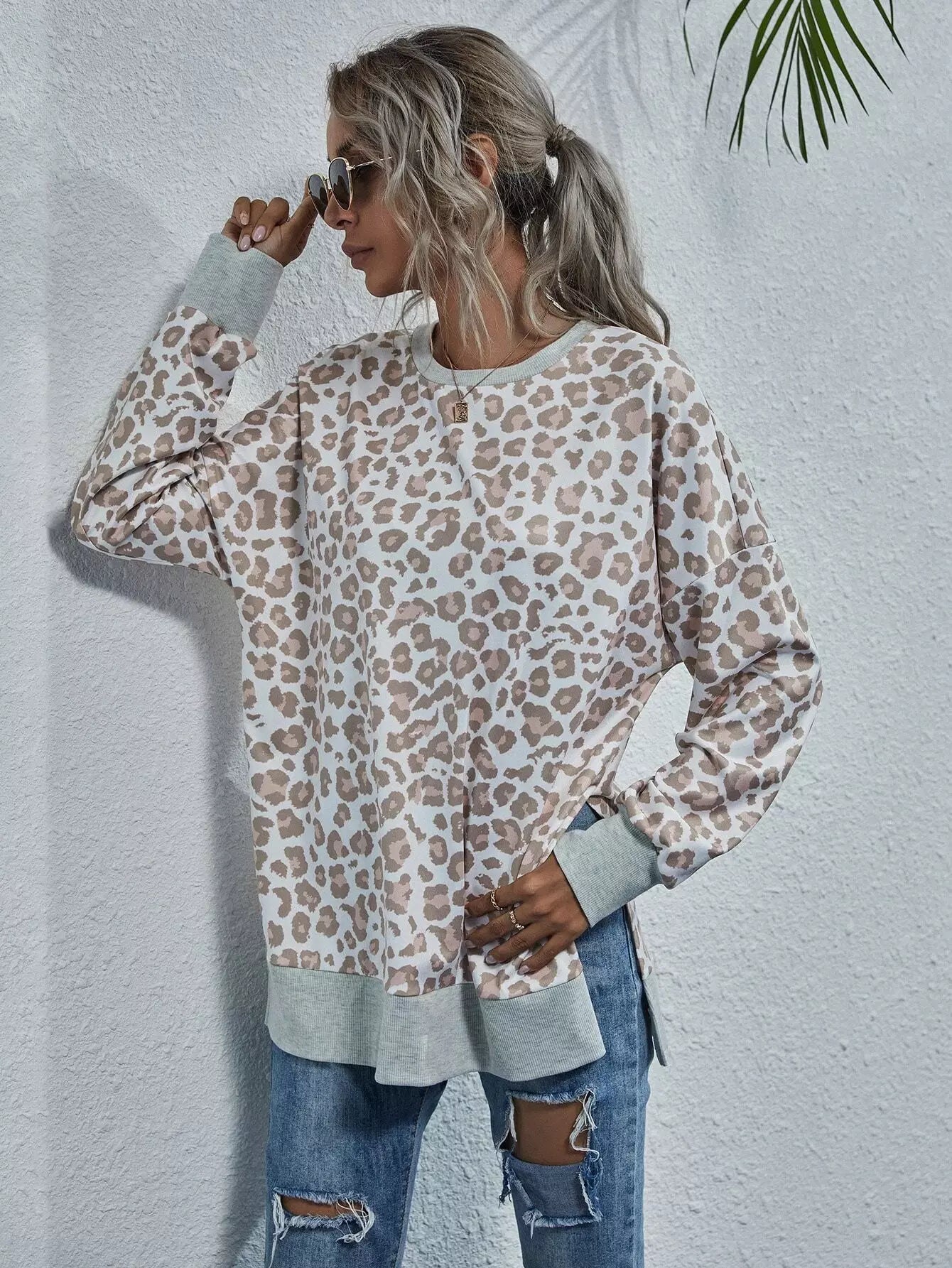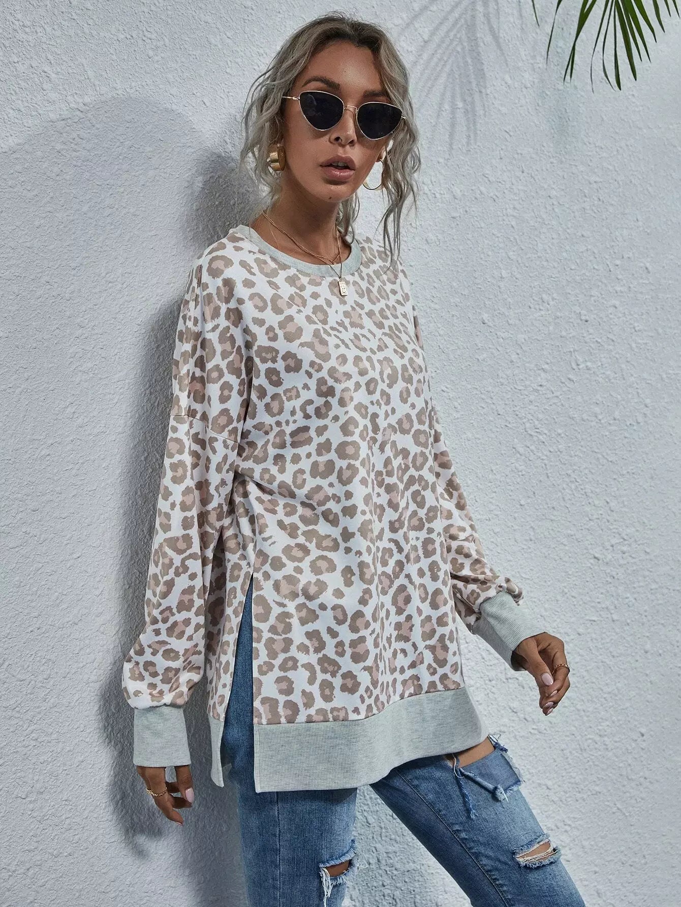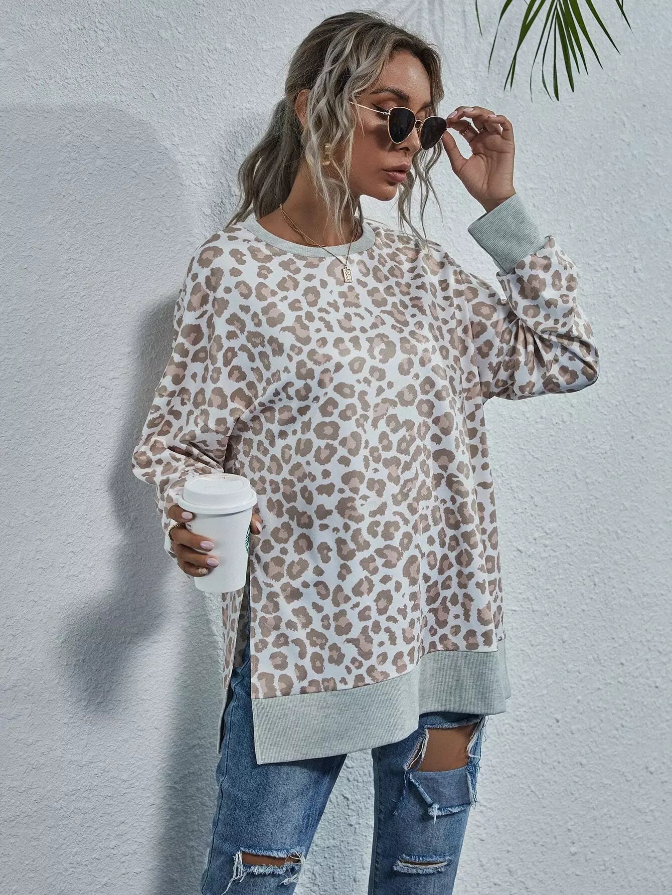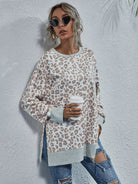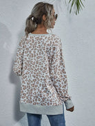 Leopard Print Split Hem Drop Shoulder Sweatshirt