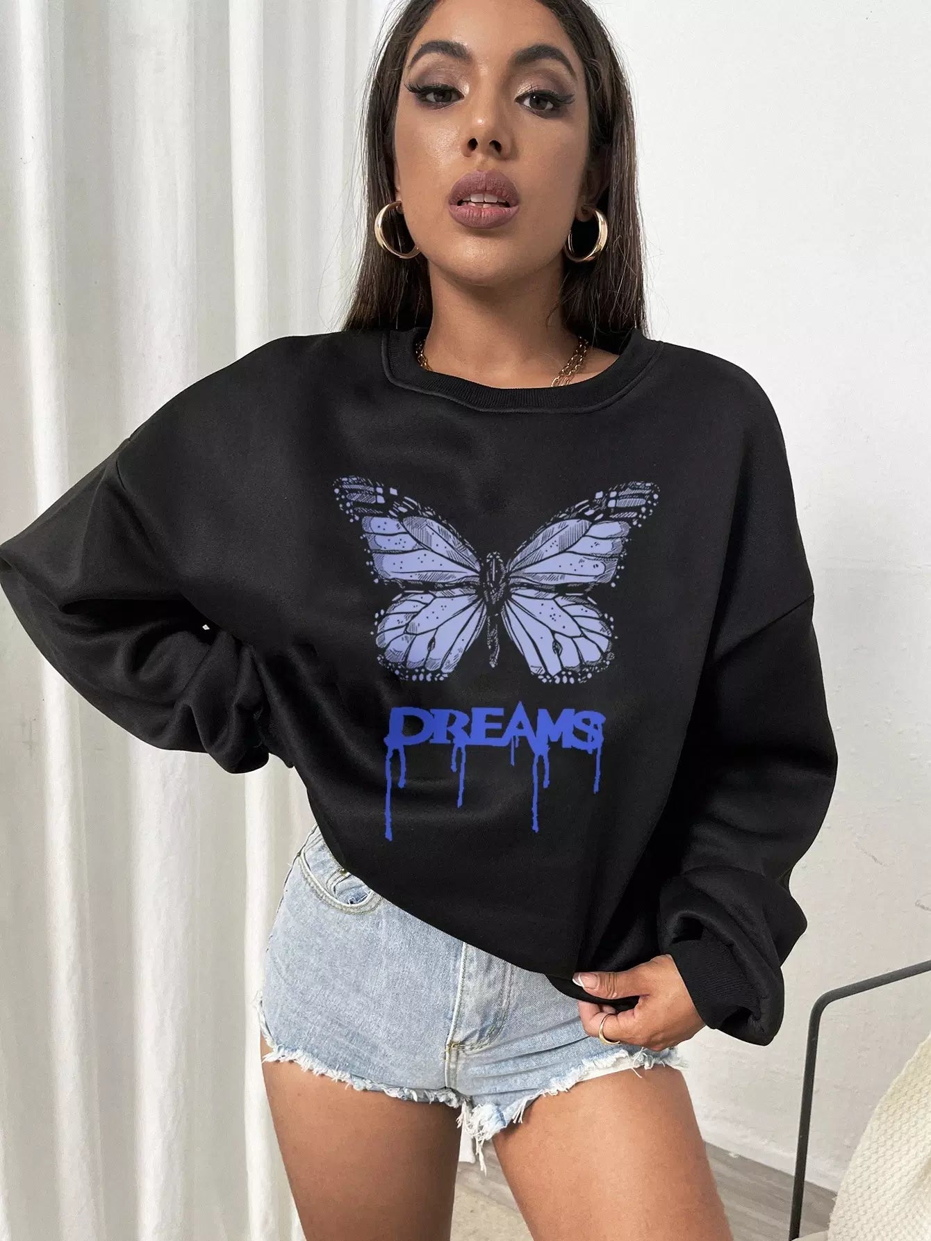 Letter And Butterfly Print Drop Shoulder Sweatshirt