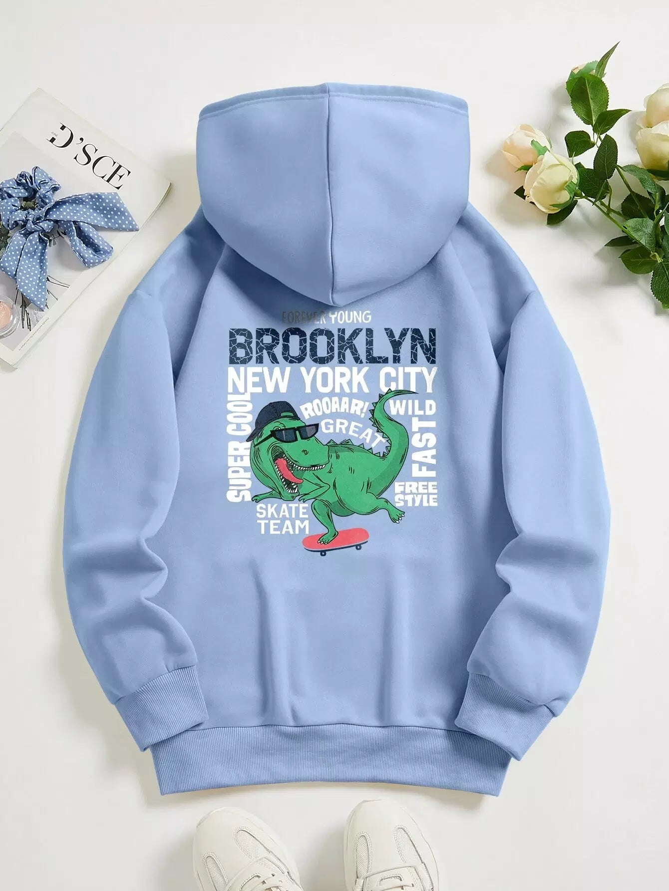 Letter & Dinosaur Print Kangaroo Pocket Drawstring Thermal Hoodie